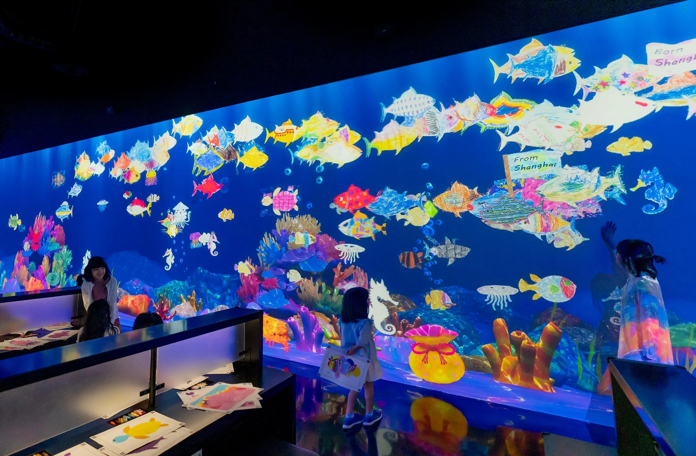 Color in a fish on the paper provided. See the picture you have drawn come to life in the massive aquarium in front of you, swimming together with the fish drawn by other people.