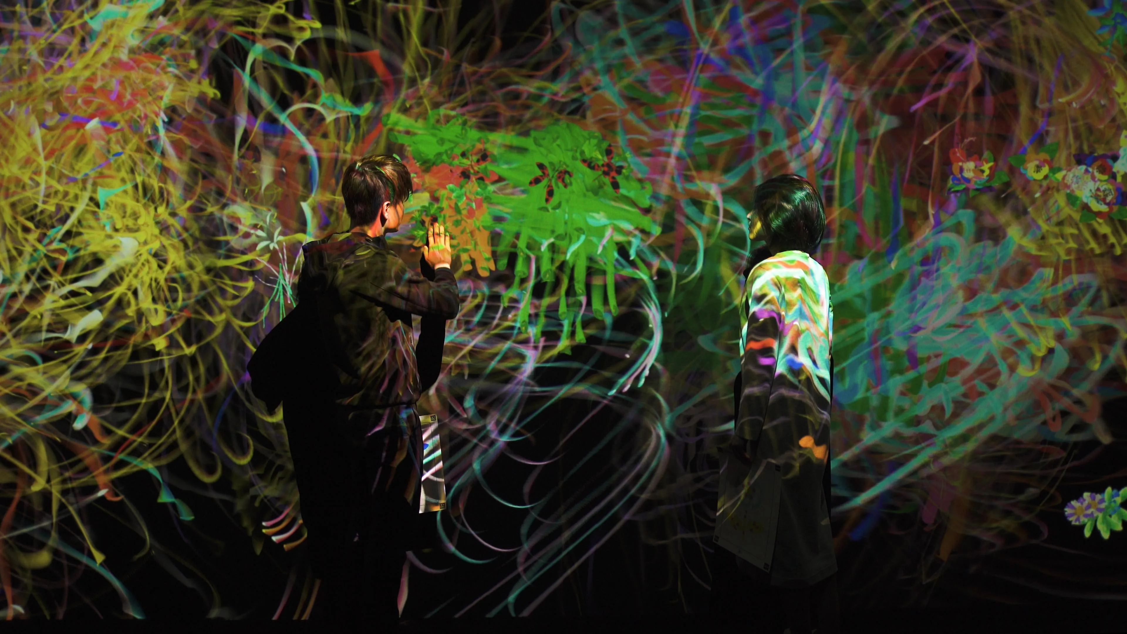 If people place their hands on the wall and hold them still, more flowers bloom. If they move their hands all the flowers scatter in an instant.