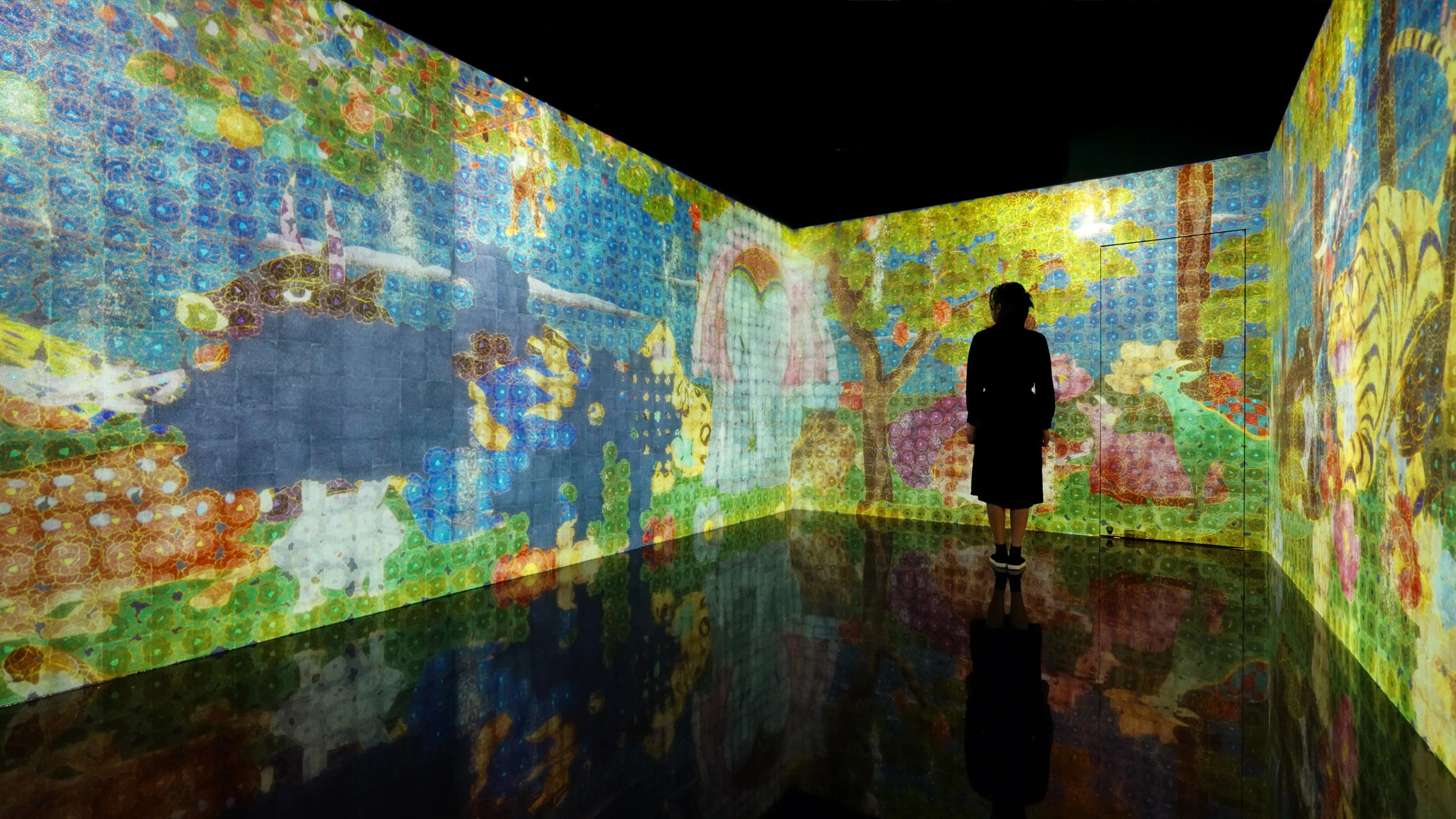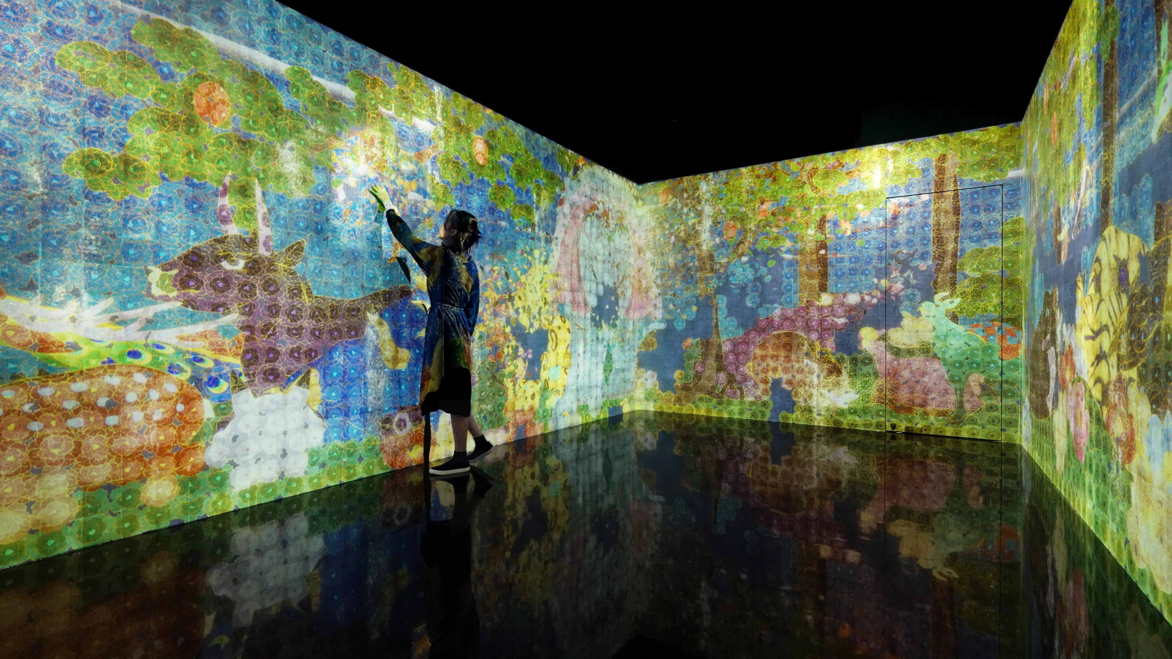 As the animals move while the flowers on the screen remain fixed, the coloring of the flowers moves on a different time axis to the space of the artwork. When viewed as a whole from a distance, the bright colors created by visual mixing represent the world of plants and animals in a space moving on a slow time axis. When viewed up close, the highly saturated colors broken down by the lines that draw the flowers represent the world of flowers changing on a fast time axis. The faint sparkle on the work represents a world between the viewer and the world of the work, which changes on the time axis of the viewer's own physical movements. Three space-times overlap.
