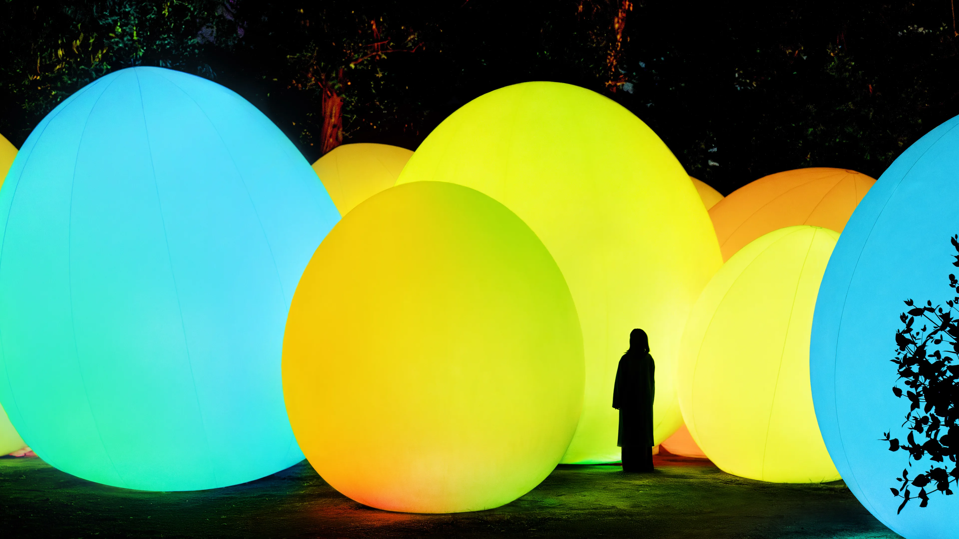 The densely packed ovoids of light, standing in the Eucalyptus park, are autonomous. When an ovoid is pushed over by people moving through or blown down by the wind, it rises back up as the color of its light changes and emits a tone specific to that color. The surrounding ovoids respond one after another, resonating and emitting the same tone and light color.