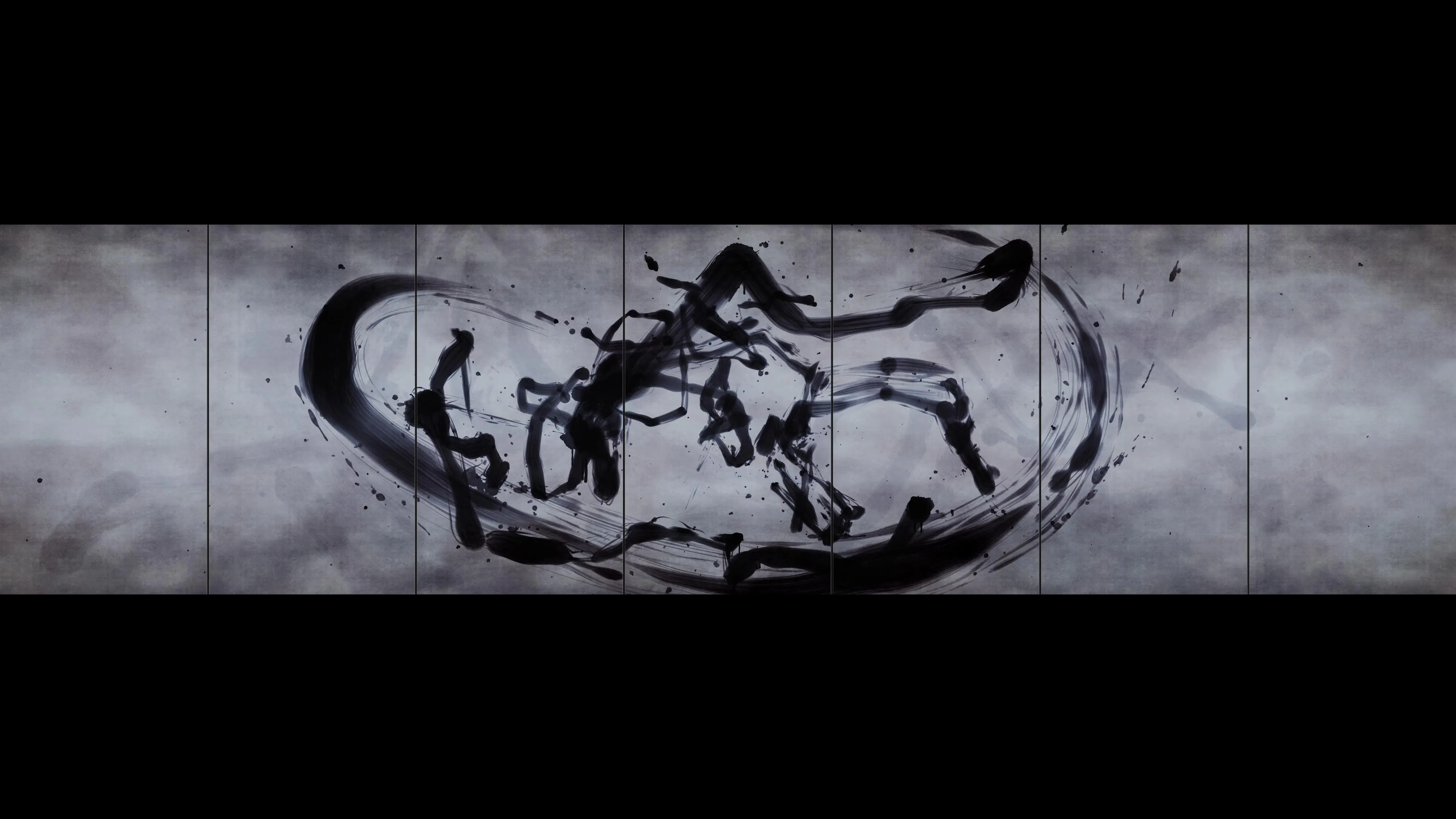 Spatial Calligraphy is a form of calligraphy drawn in space that teamLab has been exploring since it was founded. The artwork reconstructs calligraphy in three dimensional space to express the depth, speed and power of the brush stroke, and that calligraphy is then flattened using the logical structure of space that teamLab calls Ultrasubjective Space. The calligraphy shifts between two and three dimensions.