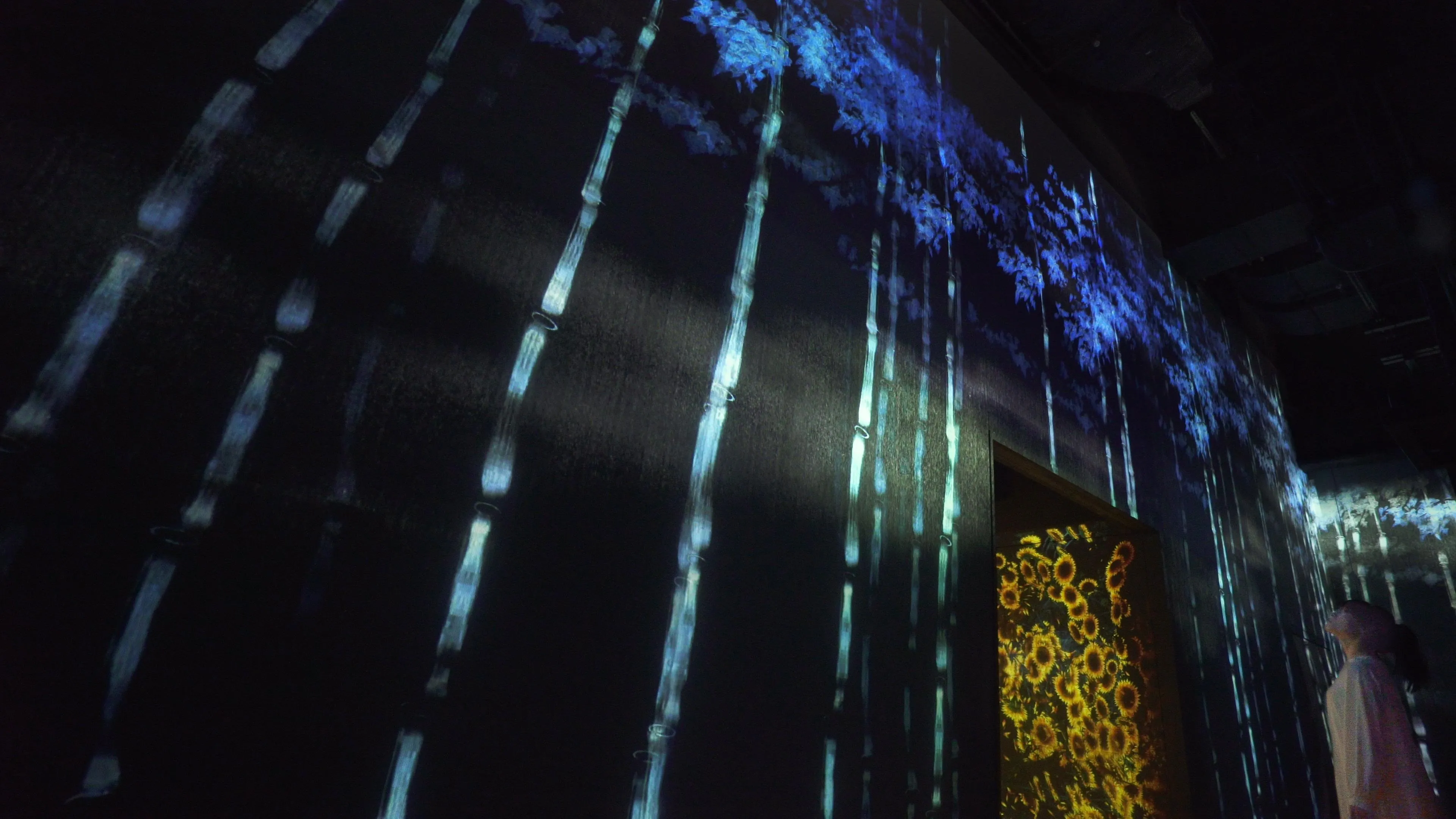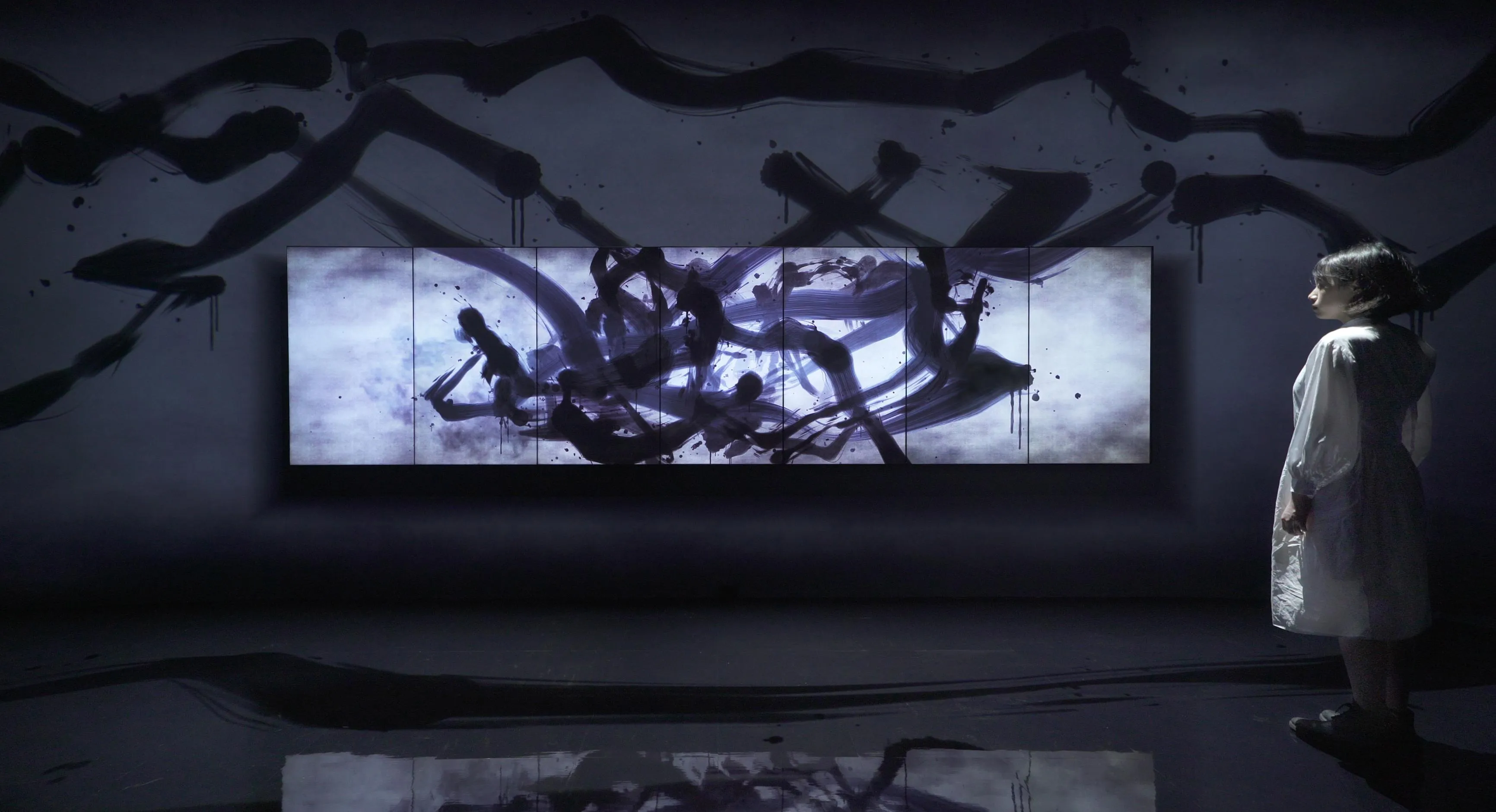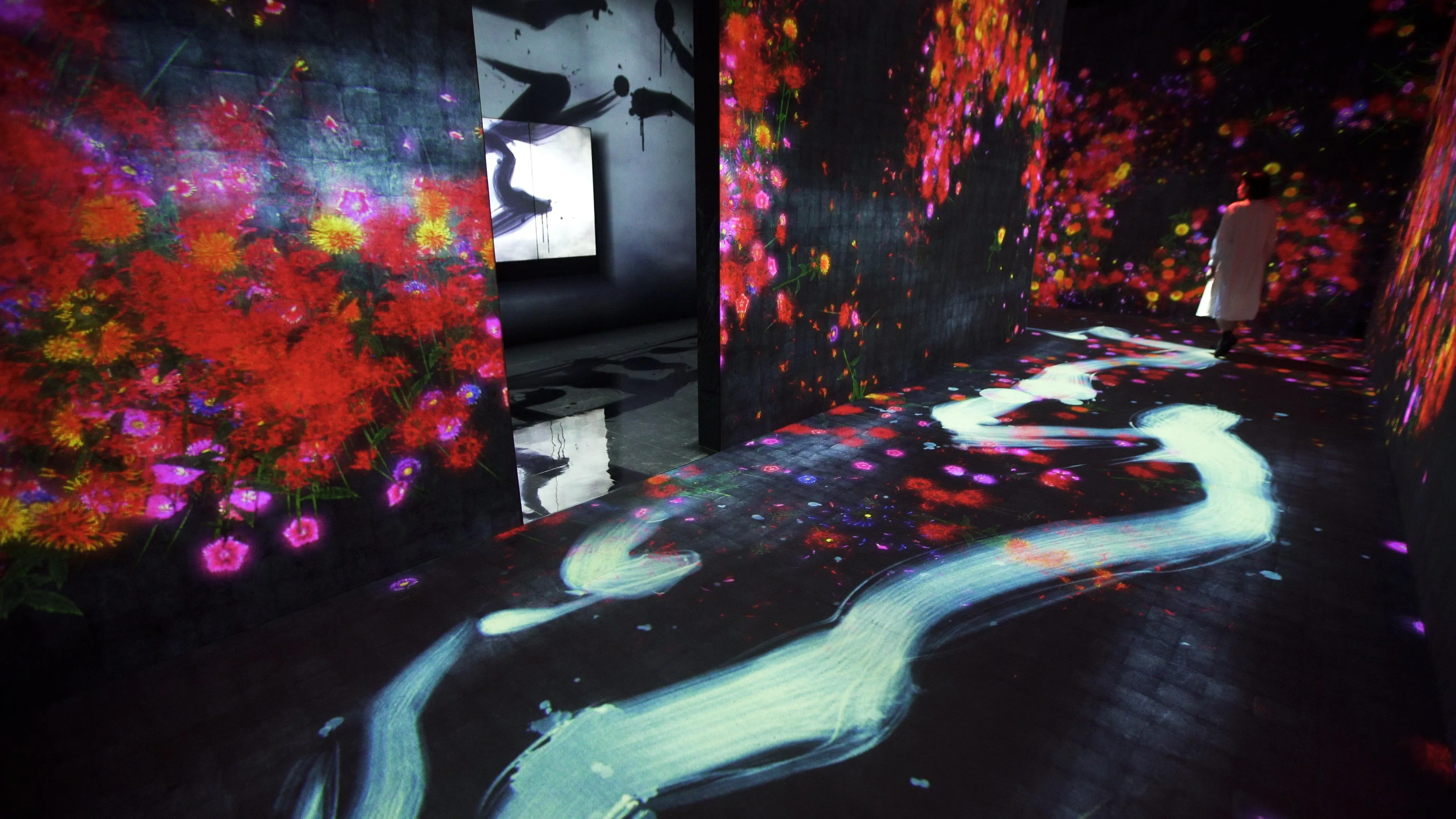 The Spatial Calligraphy artwork Reversible Rotation transcends the boundaries of the display and continues across the Borderless World in a single stroke. This single stroke influences other artworks, and causes the flowers in Forest of Flowers and People: Lost, Immersed and Reborn to scatter their petals. The calligraphy stroke draws images such as bamboo as it flows seamlessly into other artworks.
