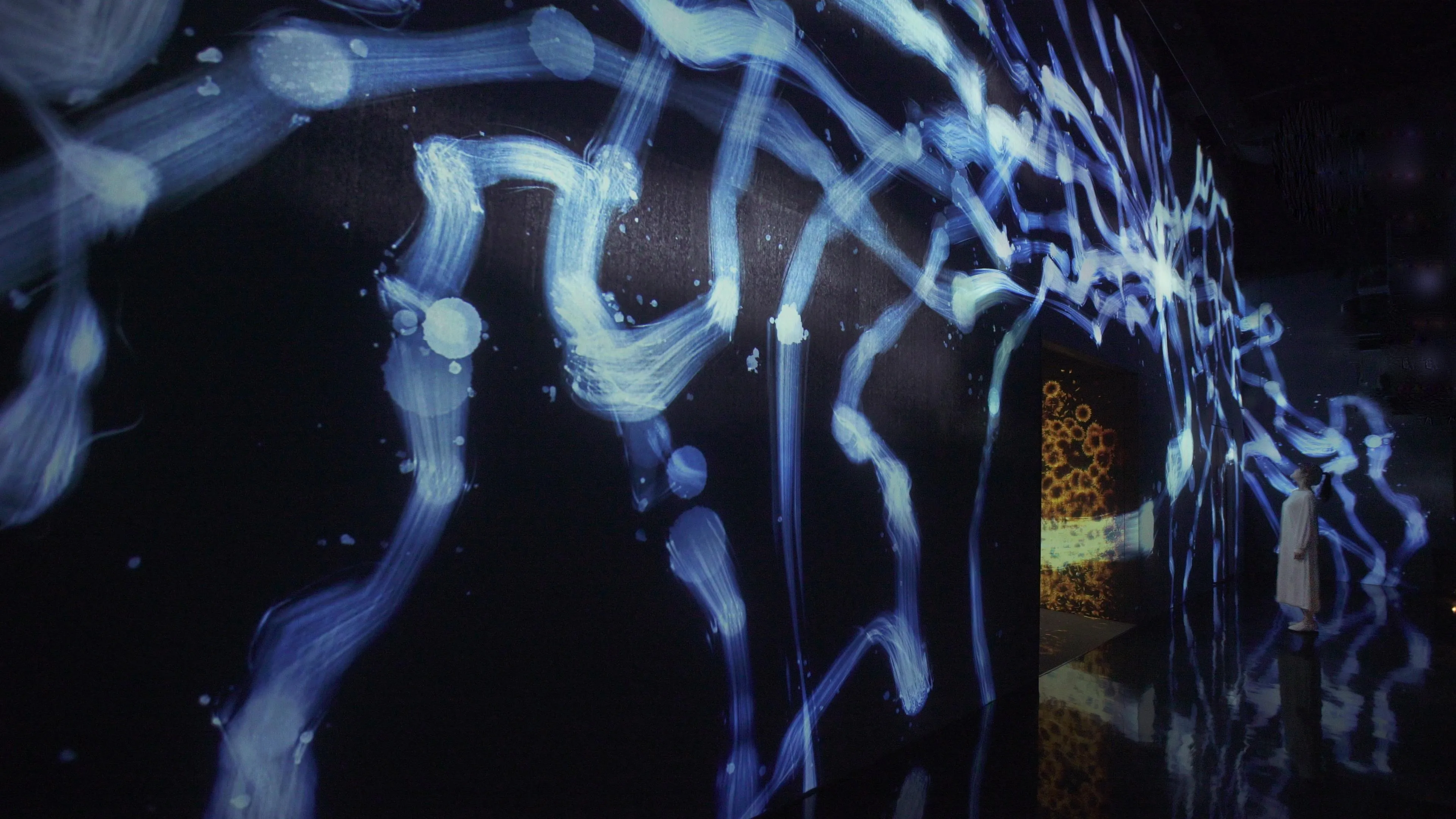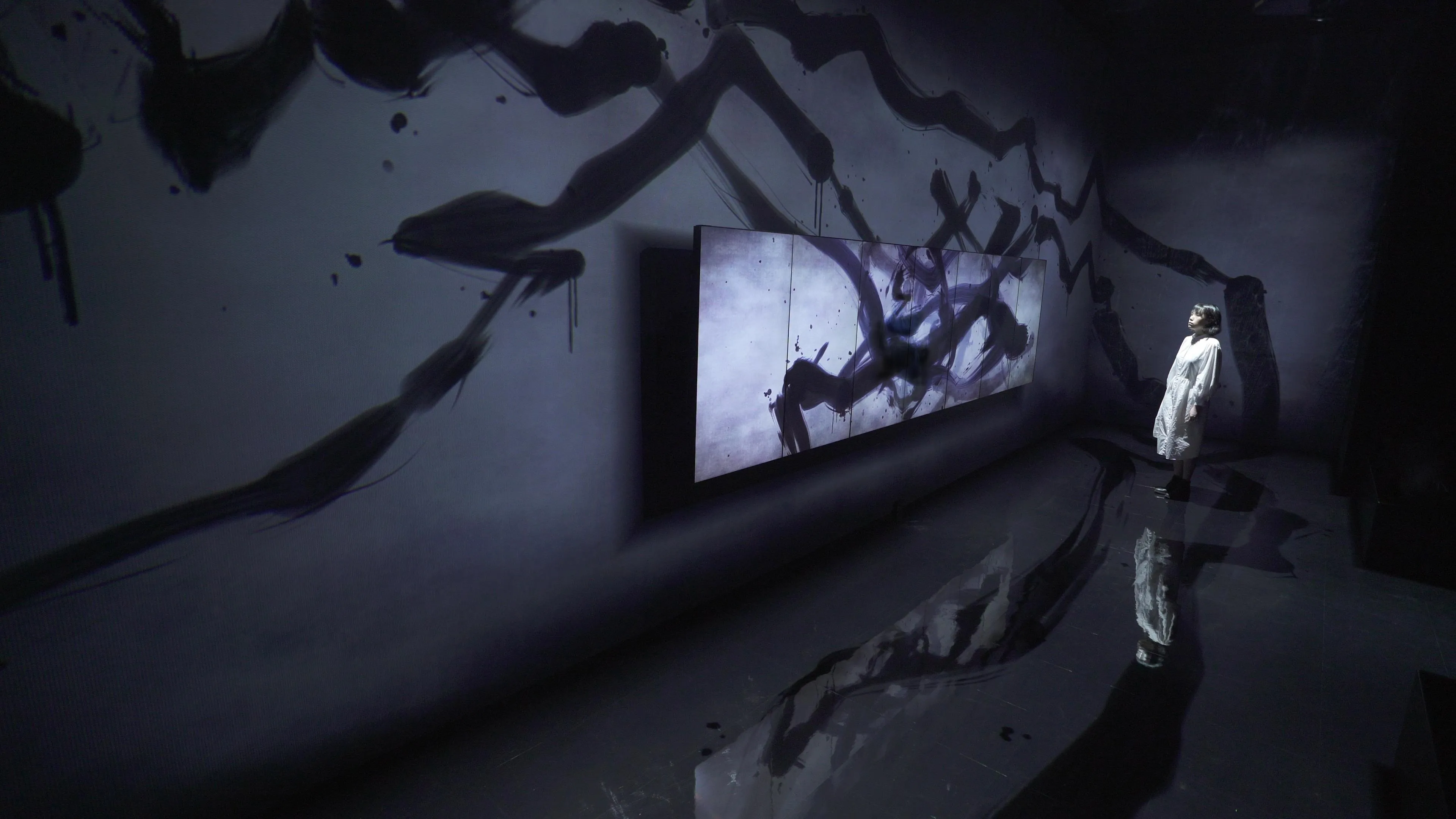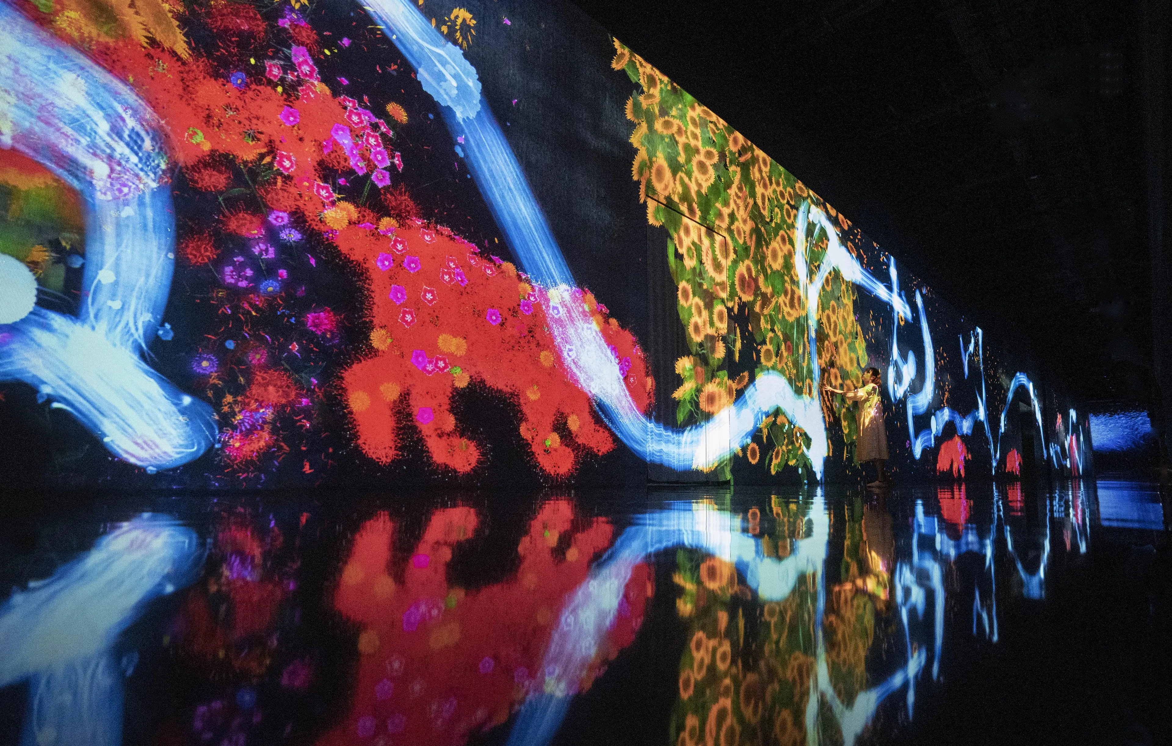 The Spatial Calligraphy artwork Reversible Rotation transcends the boundaries of the display and continues across the Borderless World in a single stroke. This single stroke influences other artworks, and causes the flowers in Forest of Flowers and People: Lost, Immersed and Reborn to scatter their petals. The calligraphy stroke draws images such as bamboo as it flows seamlessly into other artworks.