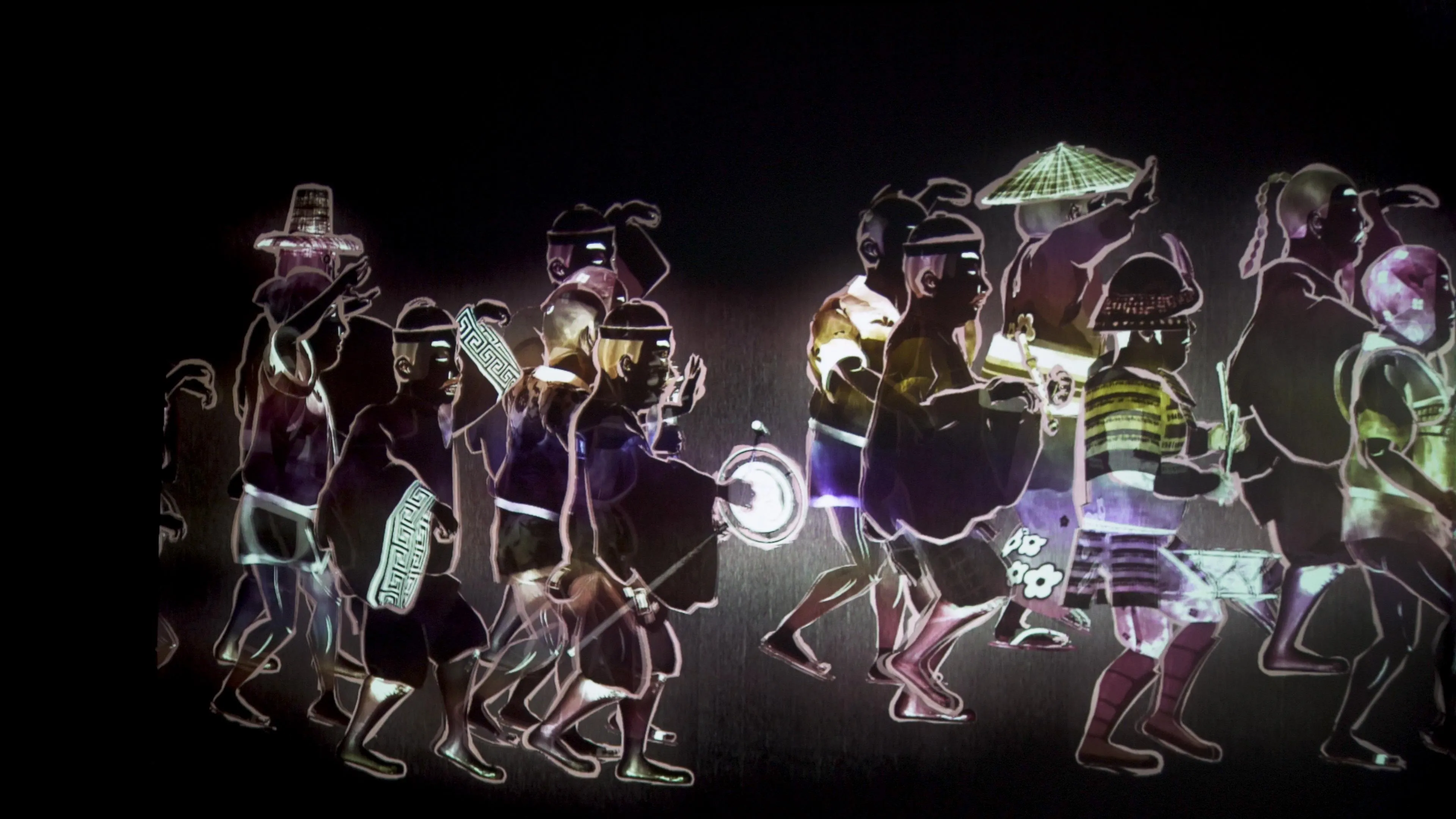 This space is made of a group of anonymous and diverse figures. The figures keep walking and as they do the artwork moves. When visitors touch the figures, they react, sometimes stop, sometimes change the direction and choose a different path.