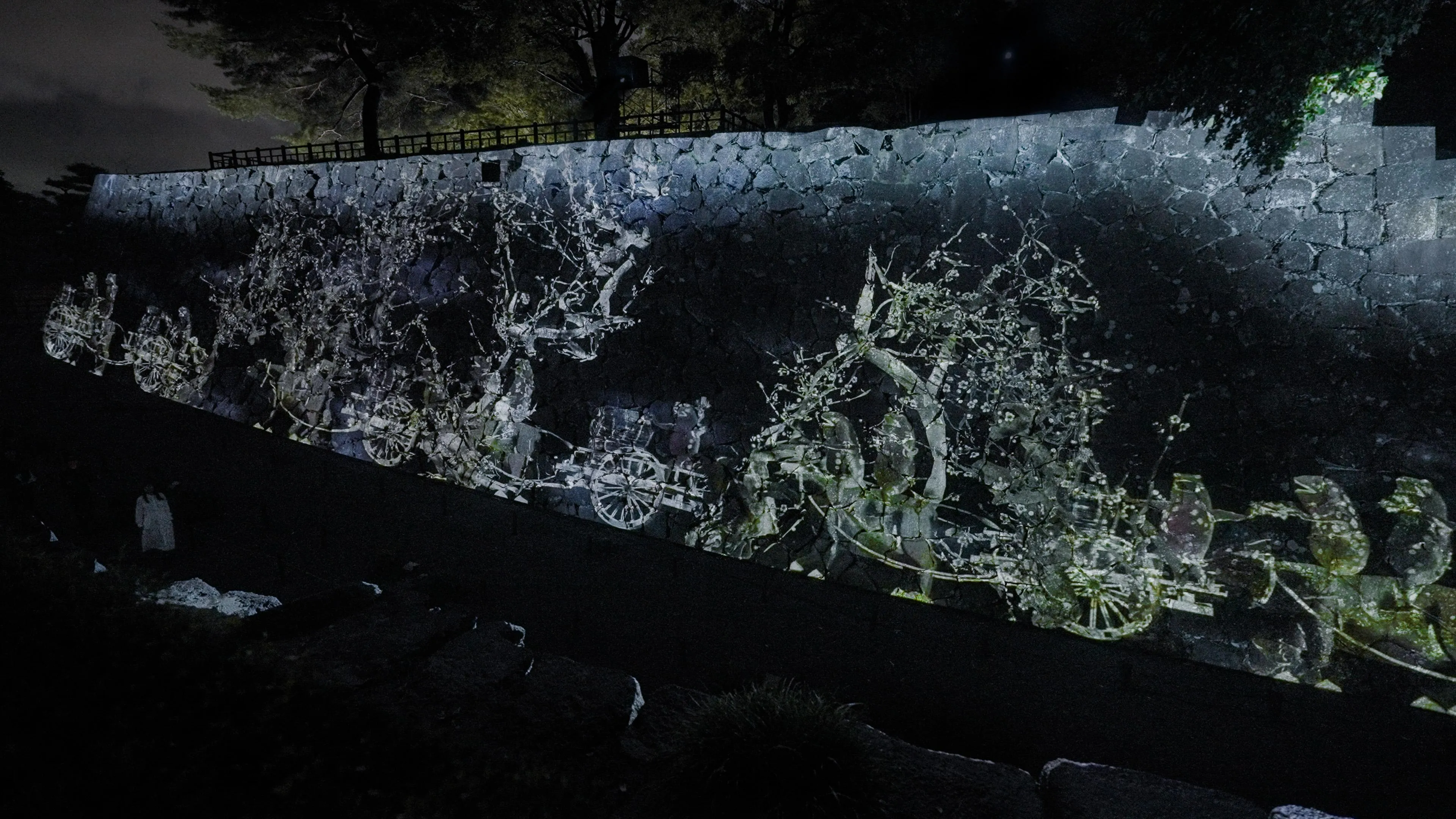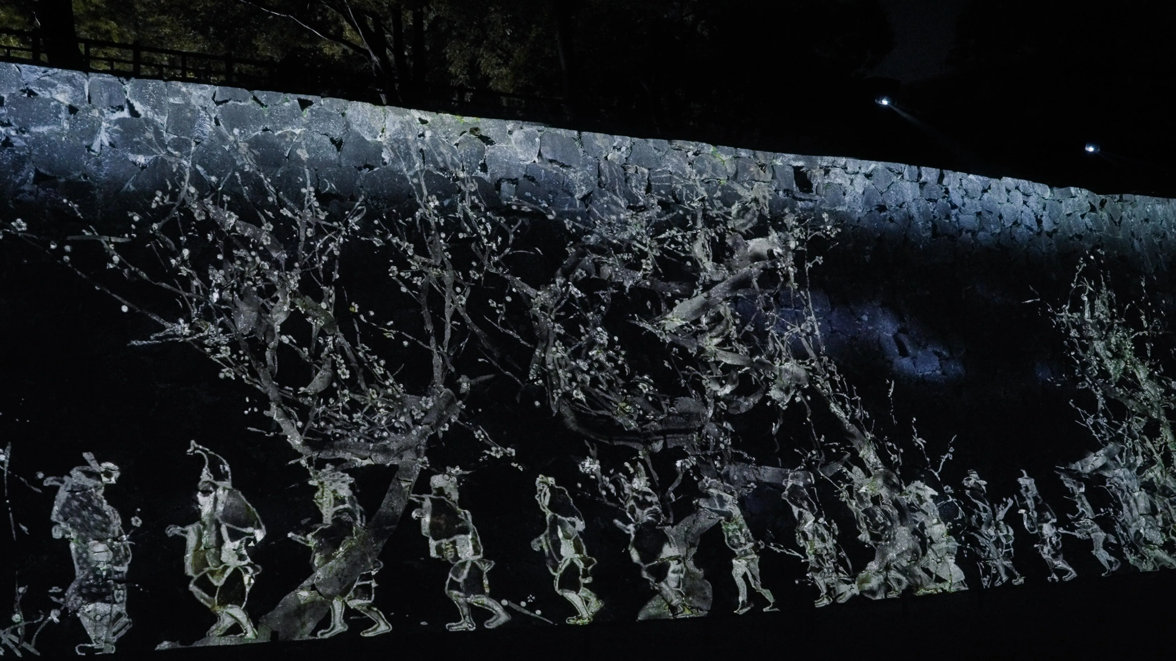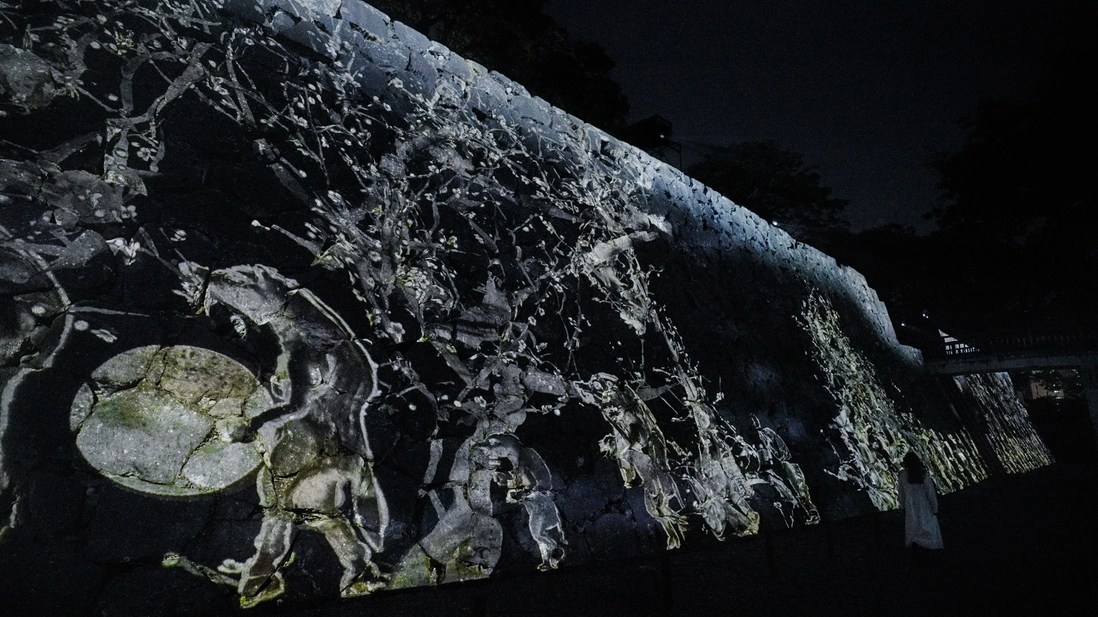 A group of anonymous and diverse figures walk along the stone wall of Kanazawa Castle.