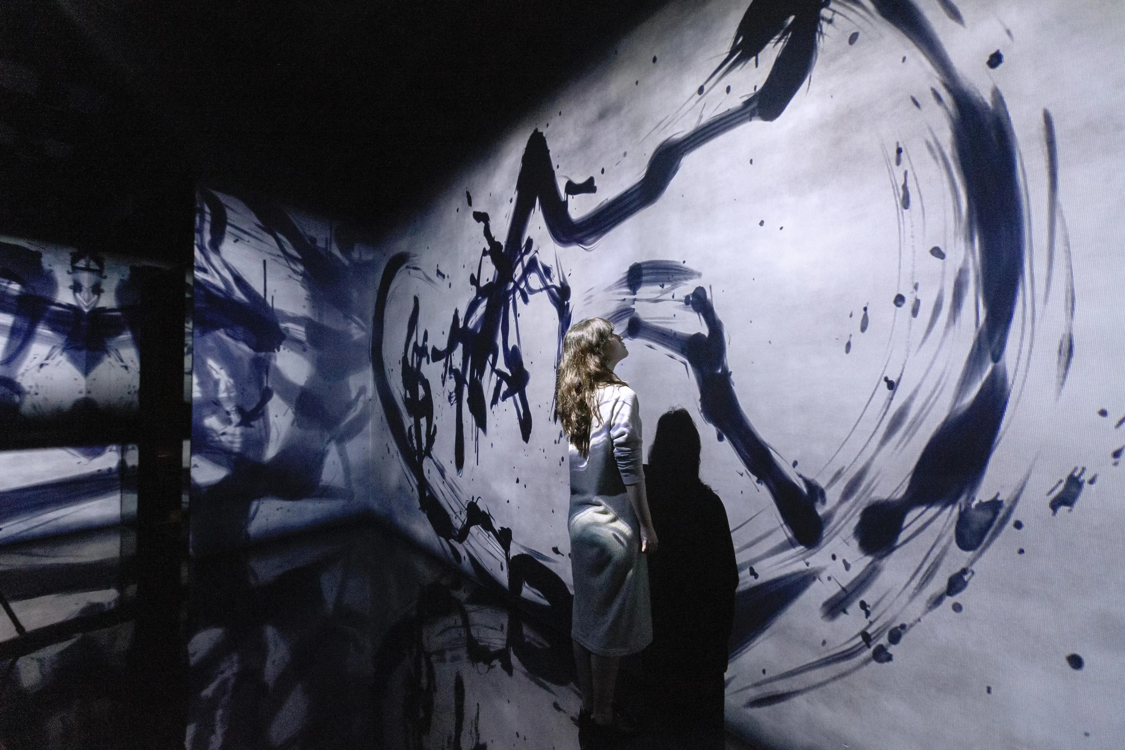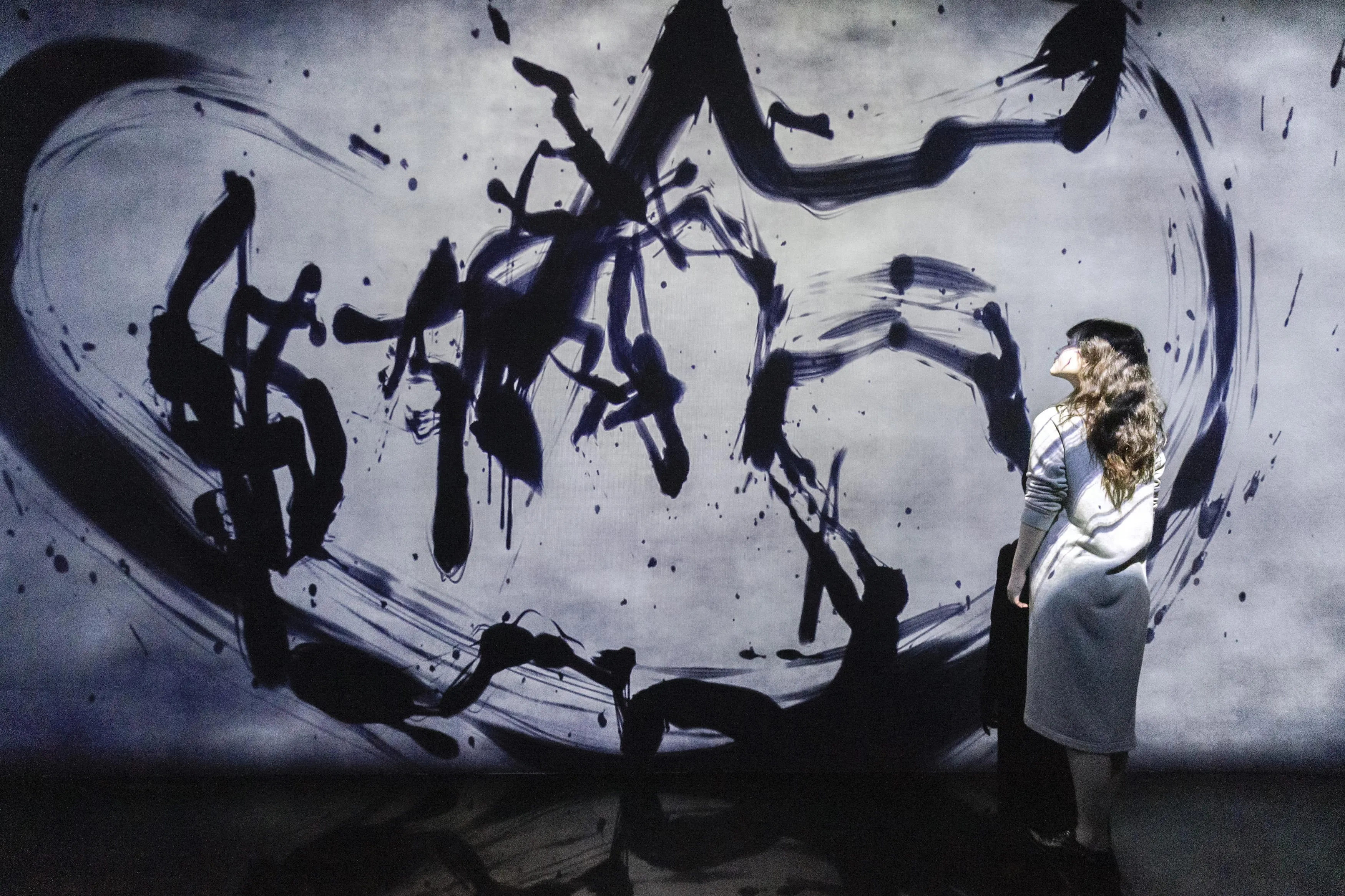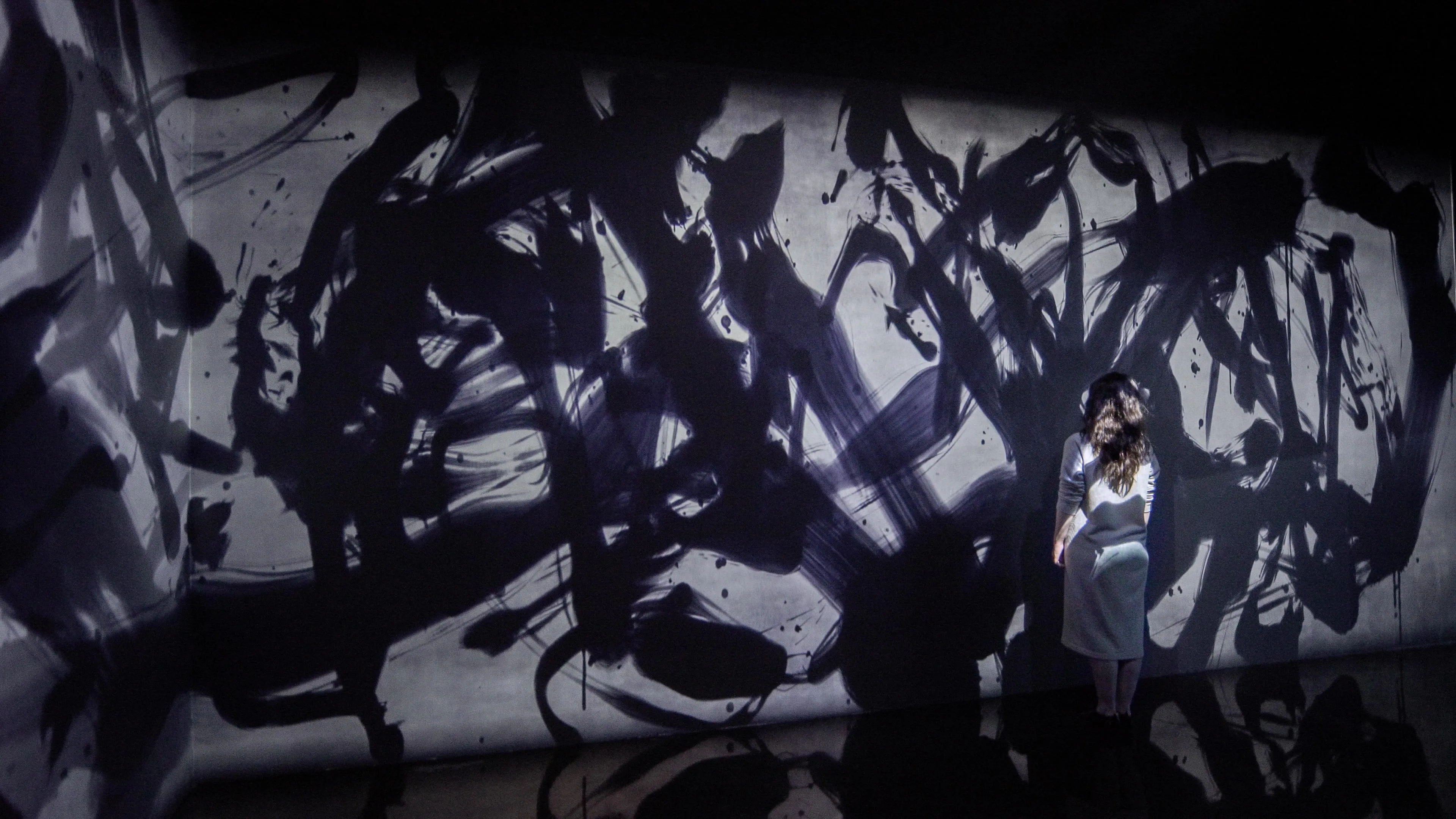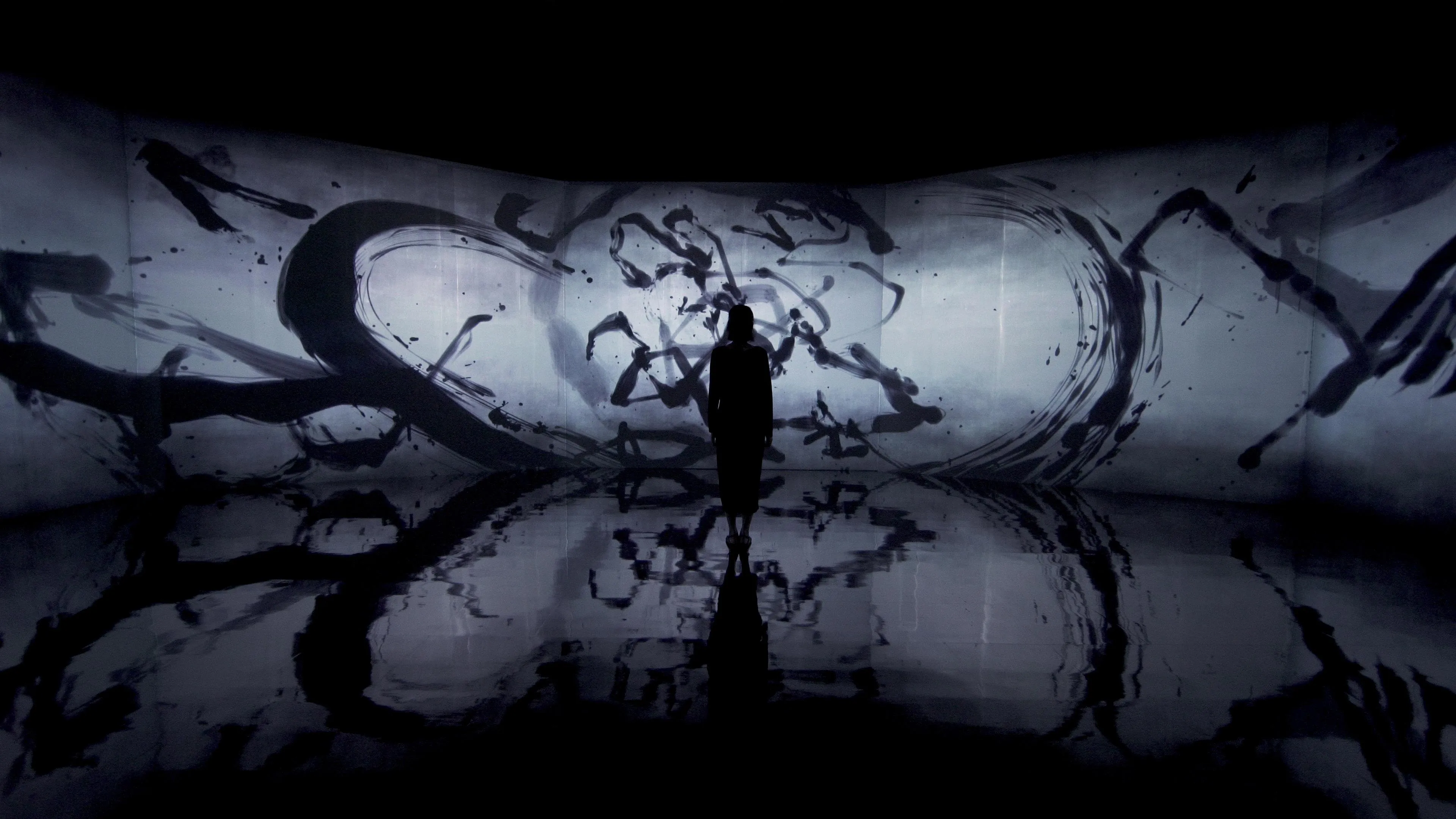 Spatial Calligraphy is a form of calligraphy drawn in space that teamLab has been exploring since it was founded. The artwork reconstructs calligraphy in three-dimensional space to express the depth, speed, and power of the brush stroke, and that calligraphy is then flattened using the logical structure of space that teamLab calls Ultrasubjective Space. The calligraphy shifts between two and three dimensions.