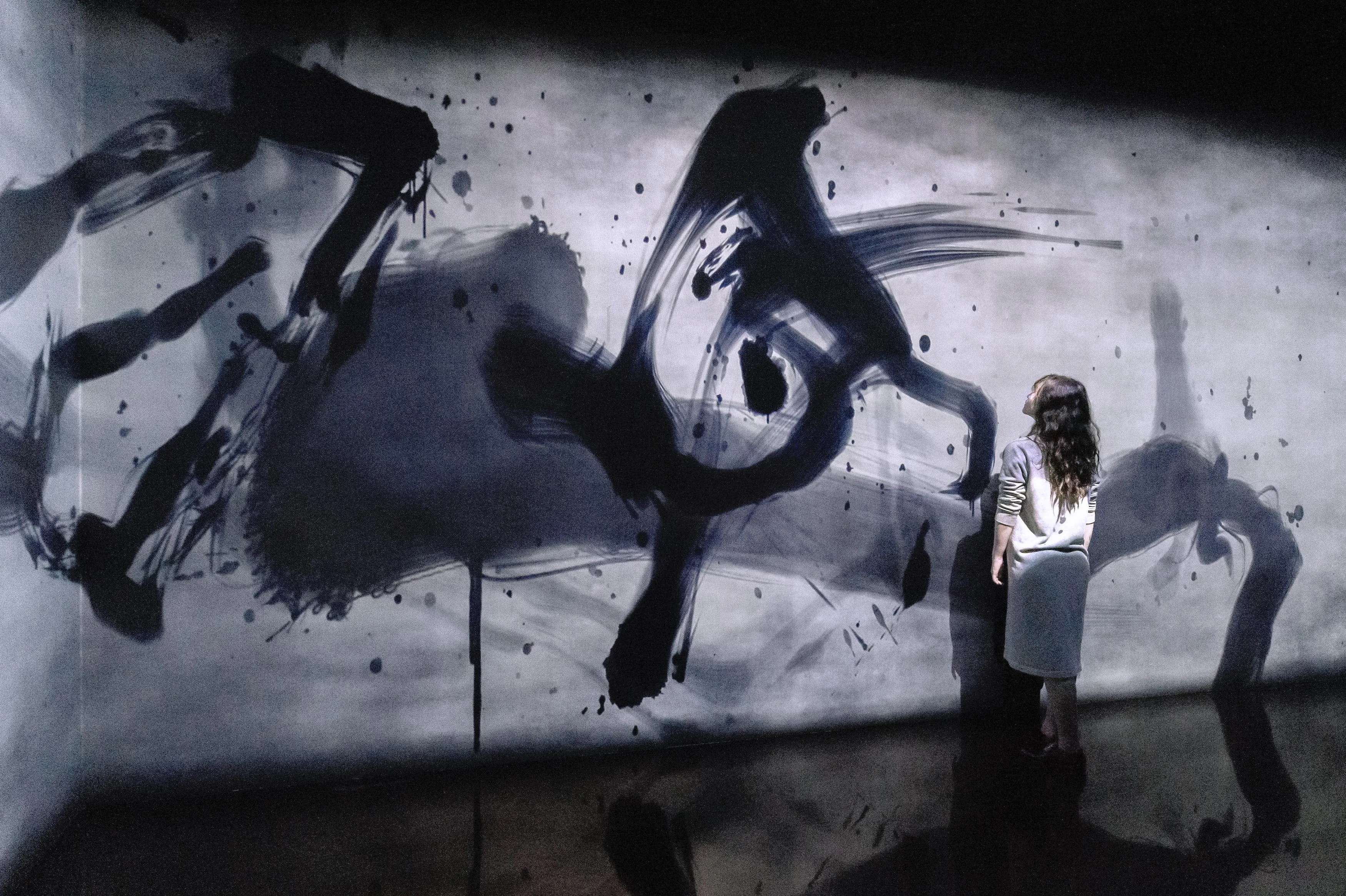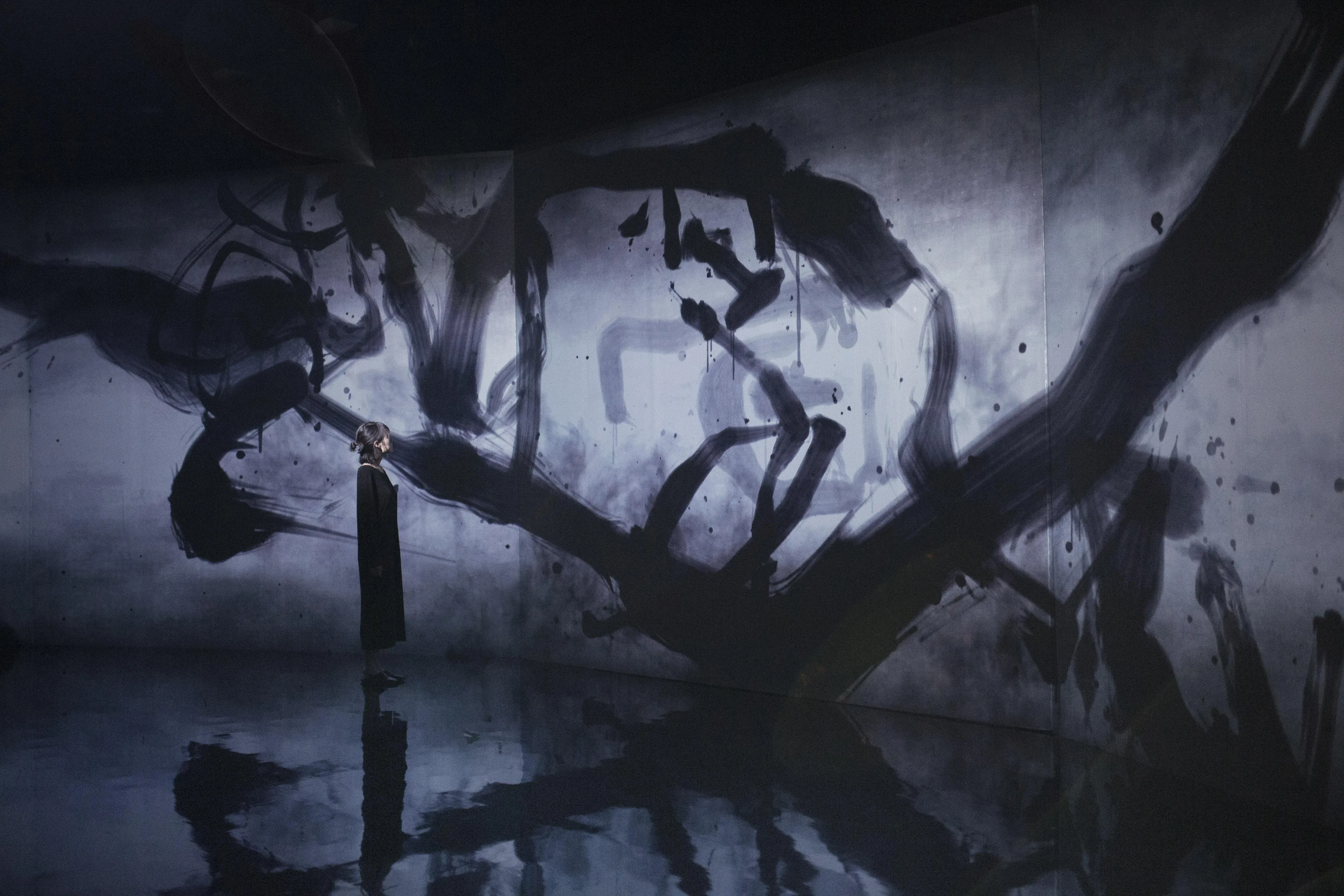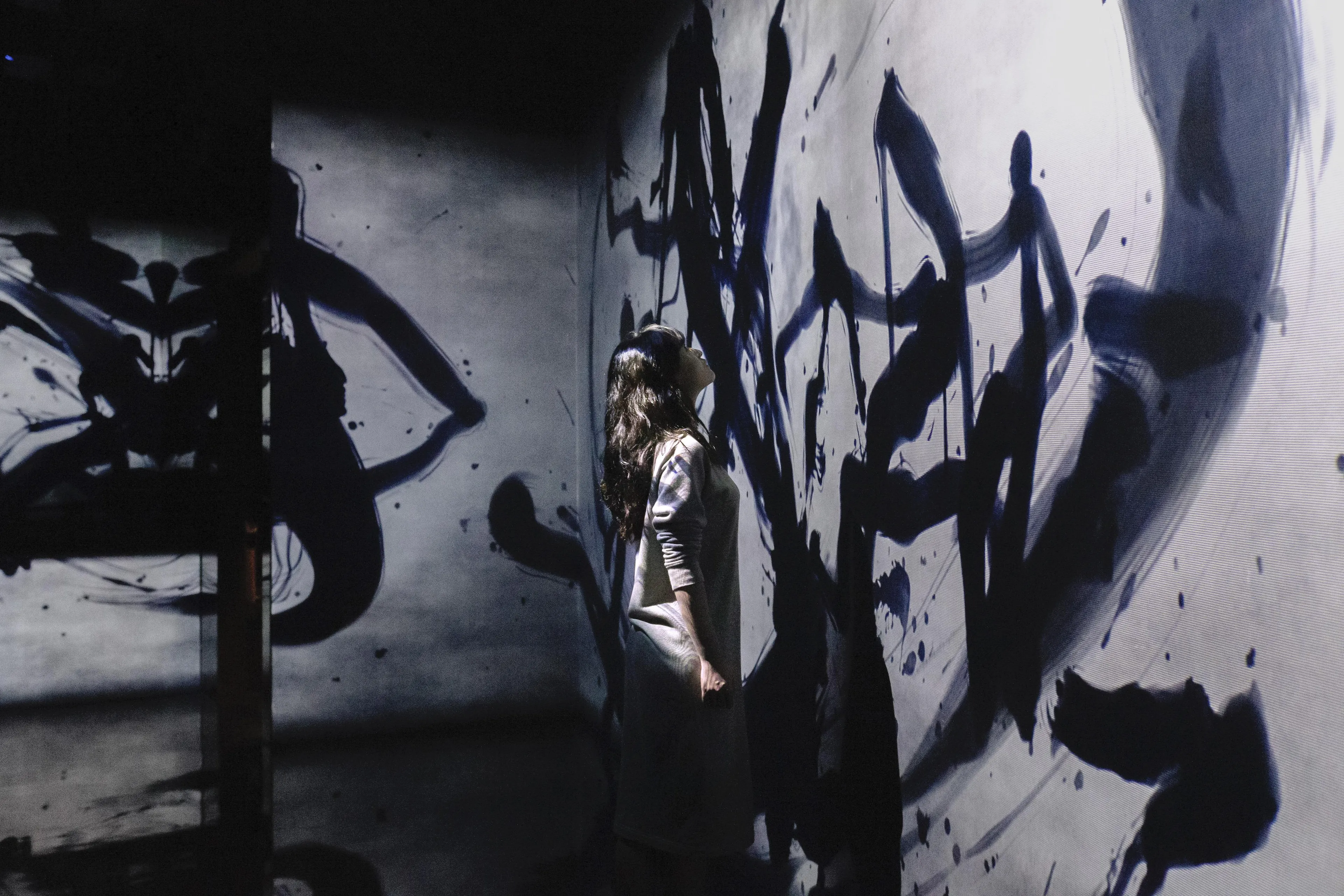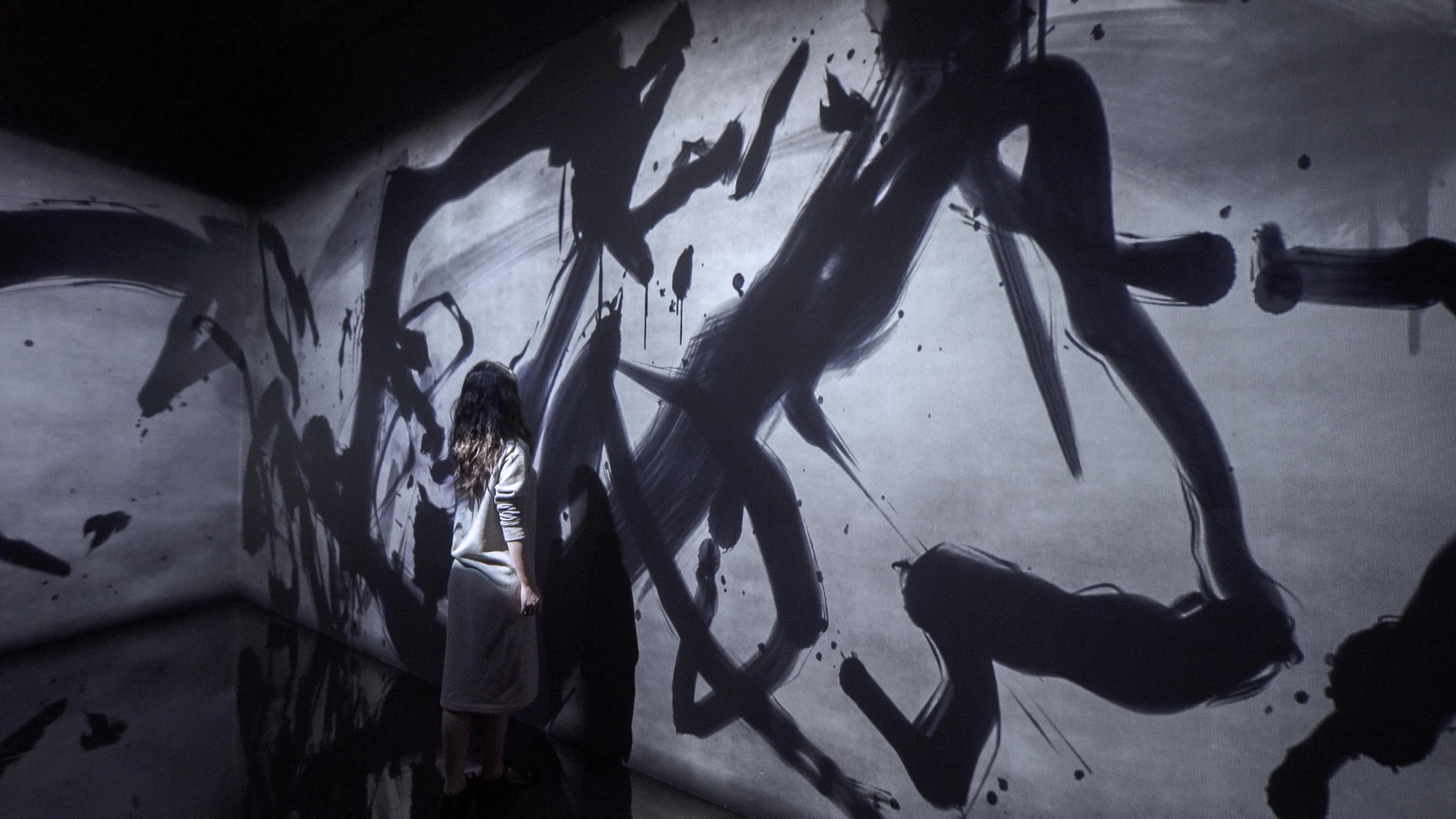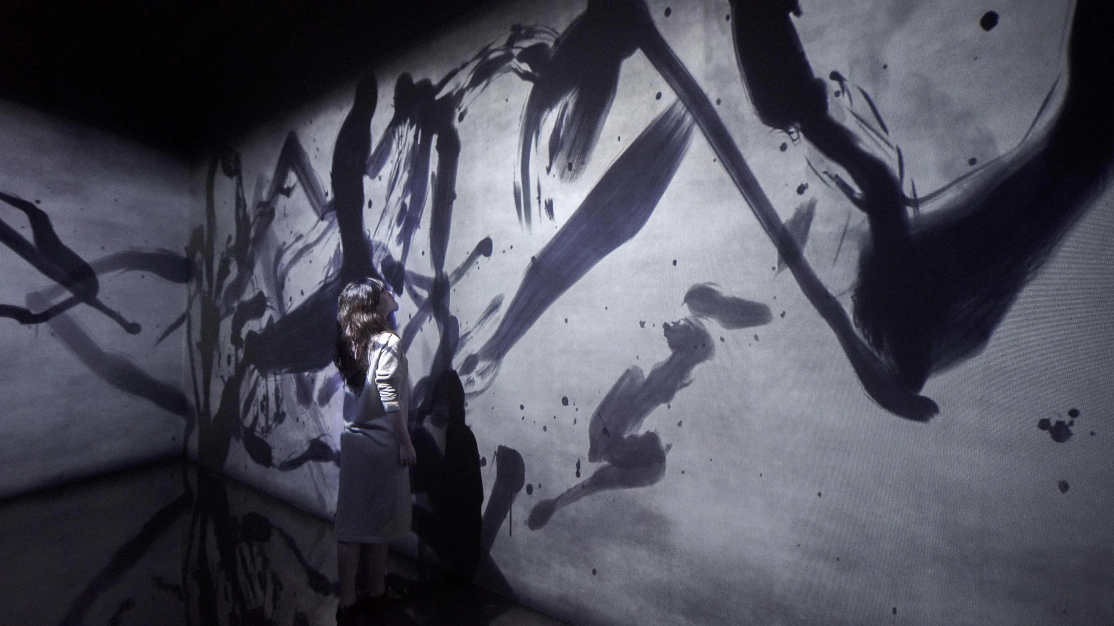 Spatial Calligraphy is a form of calligraphy drawn in space that teamLab has been exploring since it was founded. The artwork reconstructs calligraphy in three-dimensional space to express the depth, speed, and power of the brush stroke, and that calligraphy is then flattened using the logical structure of space that teamLab calls Ultrasubjective Space. The calligraphy shifts between two and three dimensions.