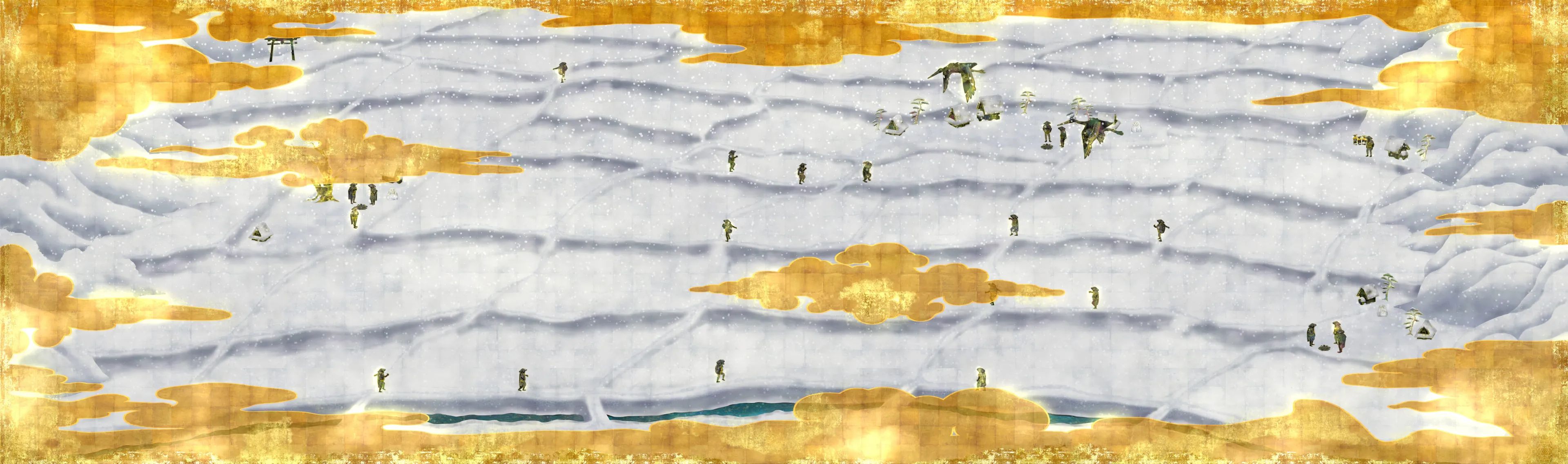 The depicted landscape and people’s lives change in the picture throughout the year.