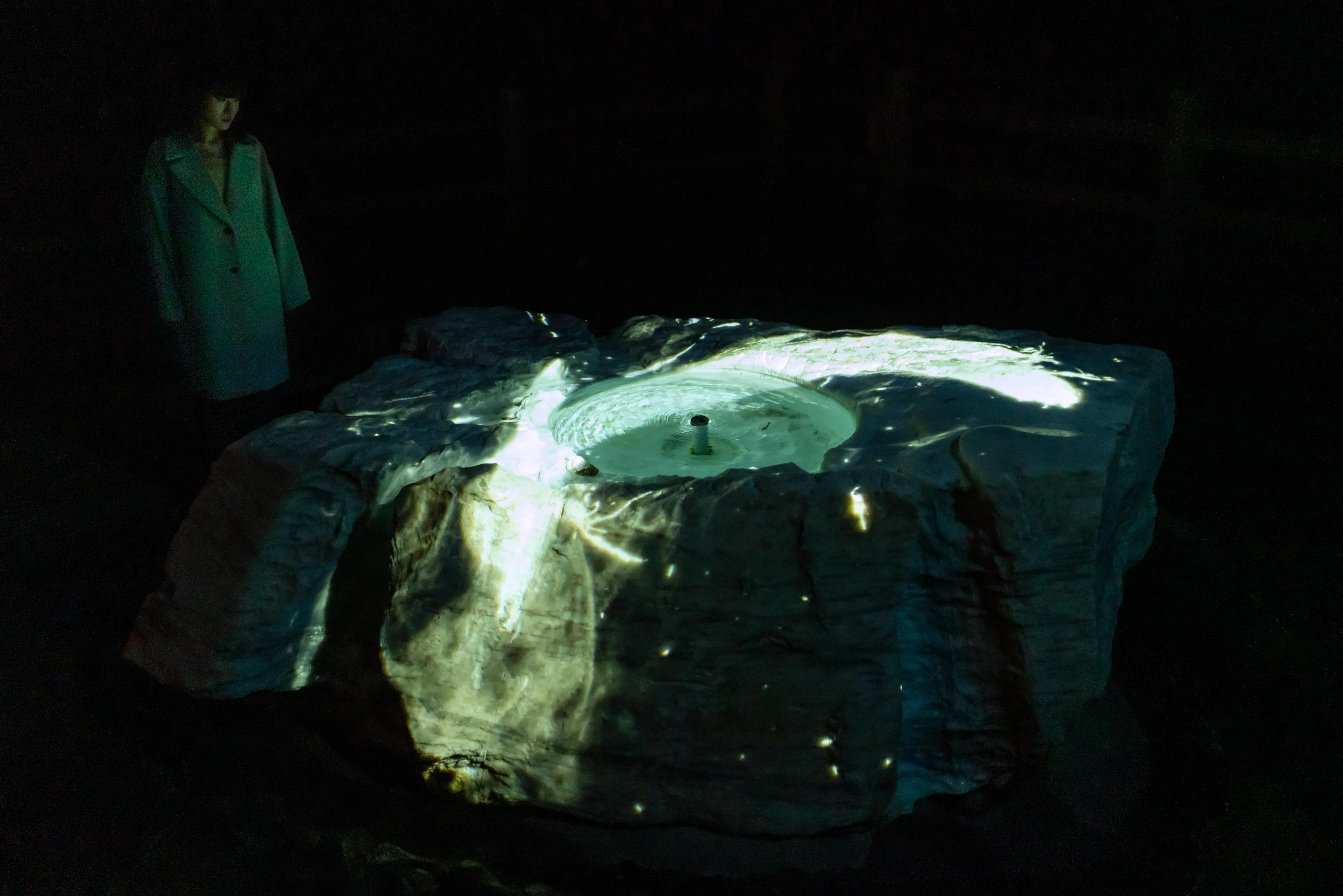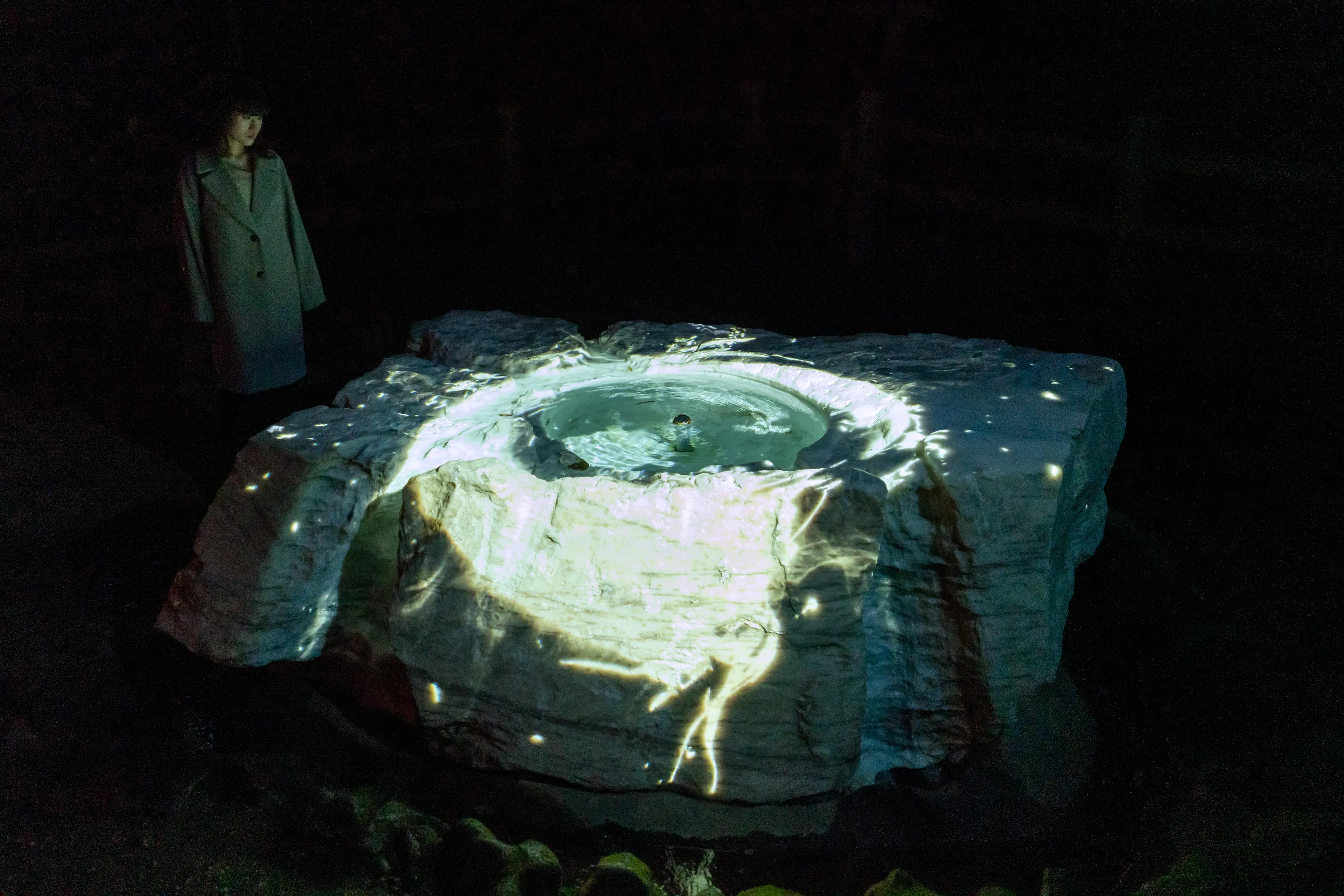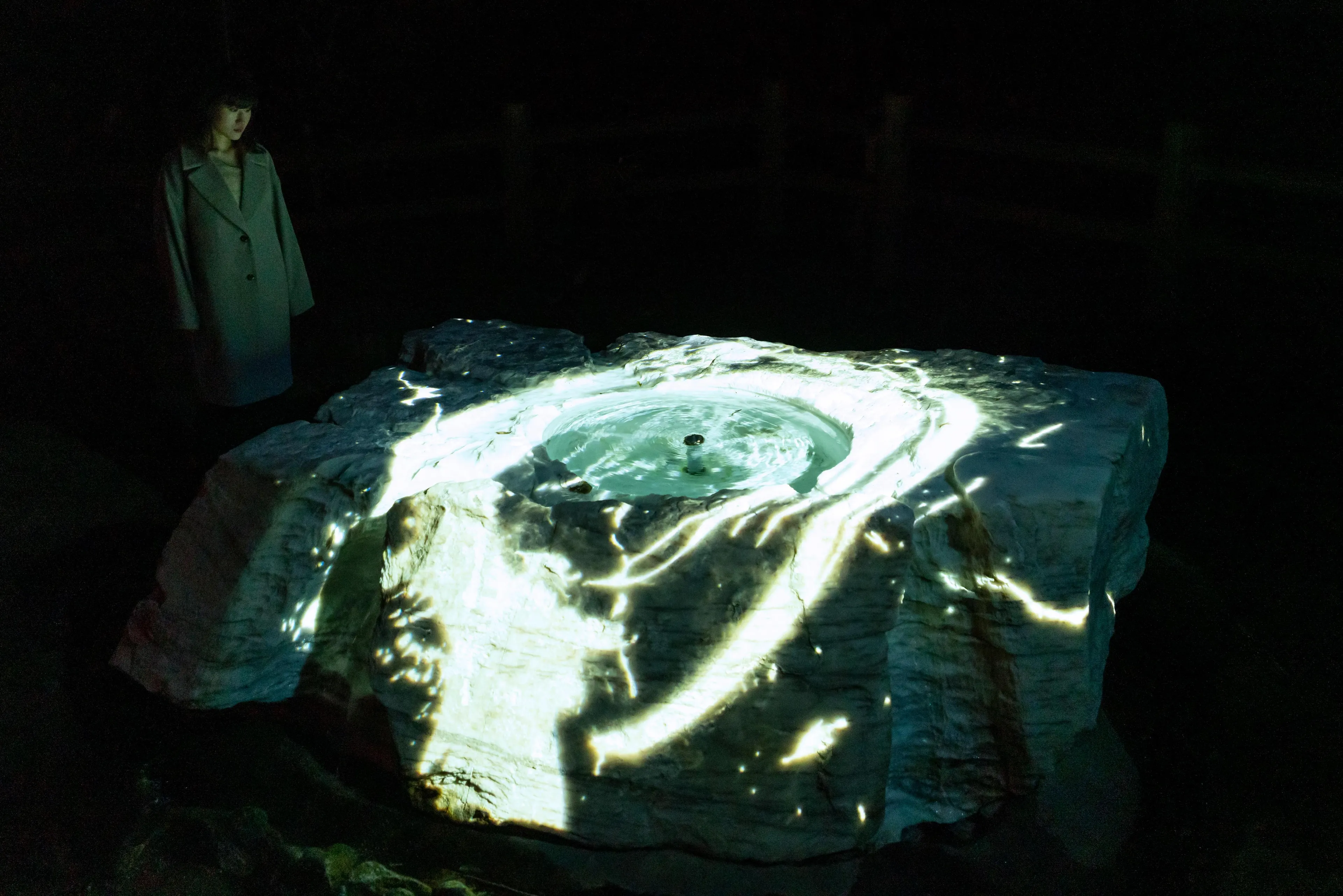 “空书”是在空间里书写的书法。书法特有的墨迹,深浅度、速度和力度,在全新诠释的空间里被立体的再构建,通过teamLab的“超主观空间”的理论结构被二次元化。书法在平面和立体之间不断巡回。