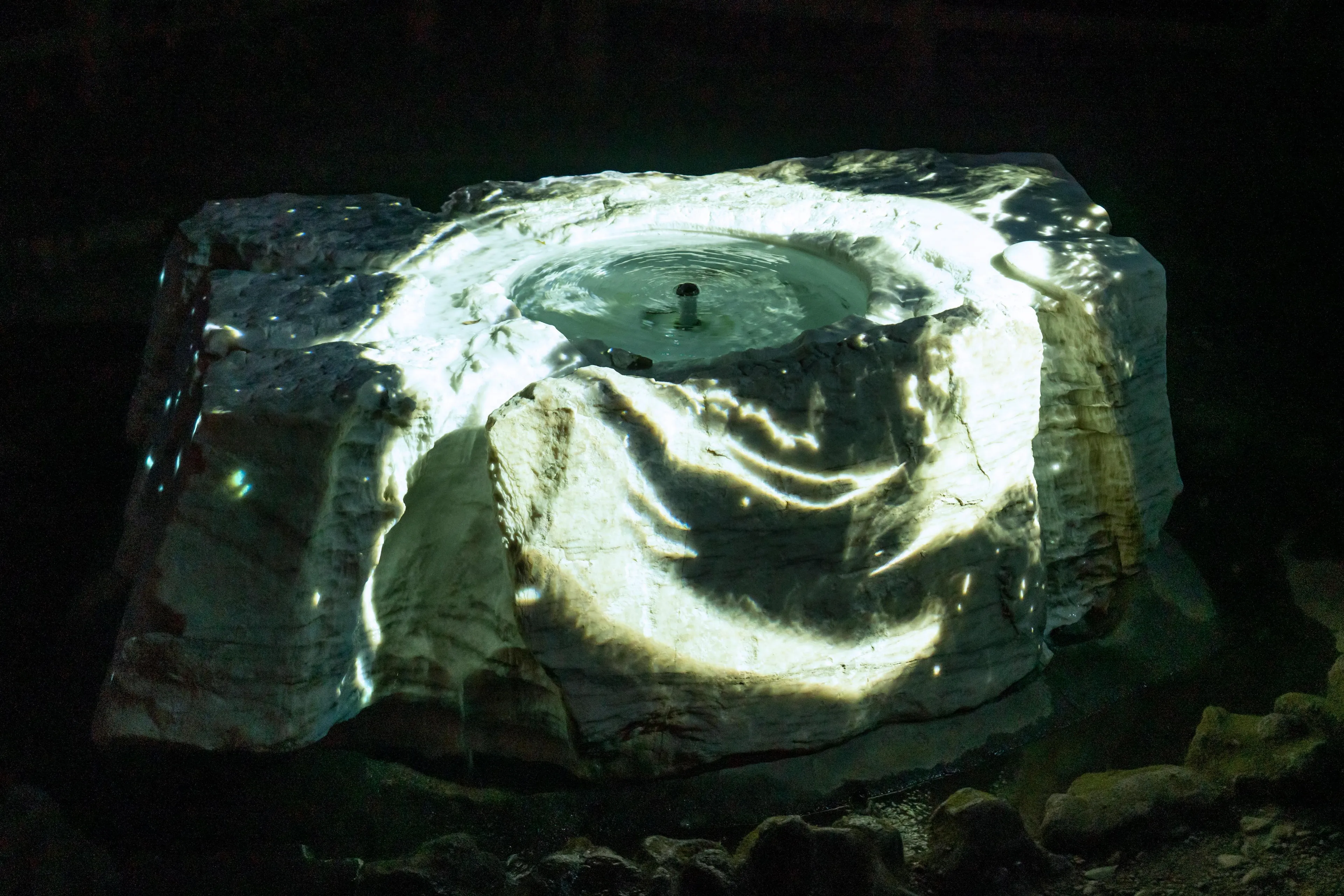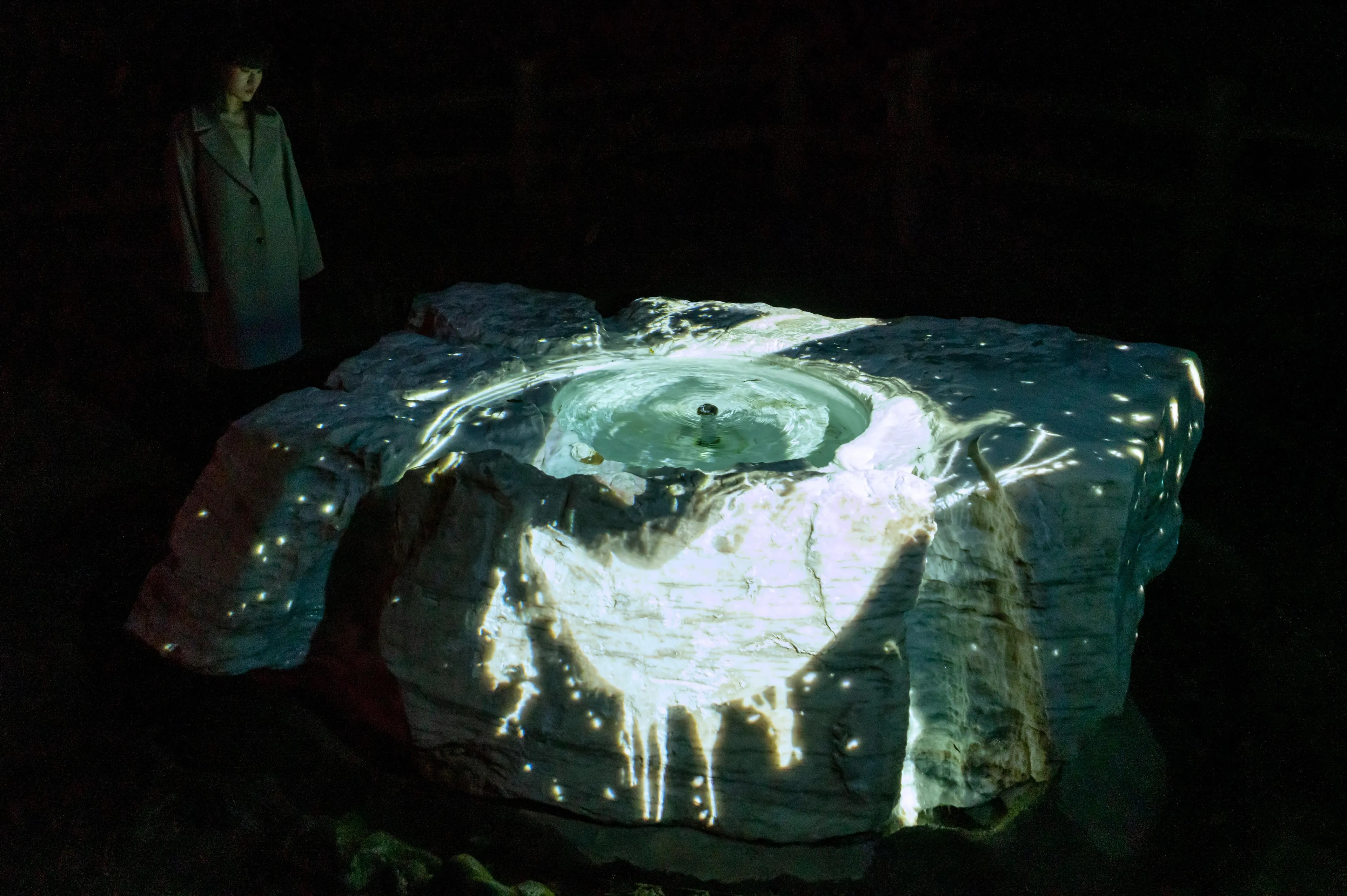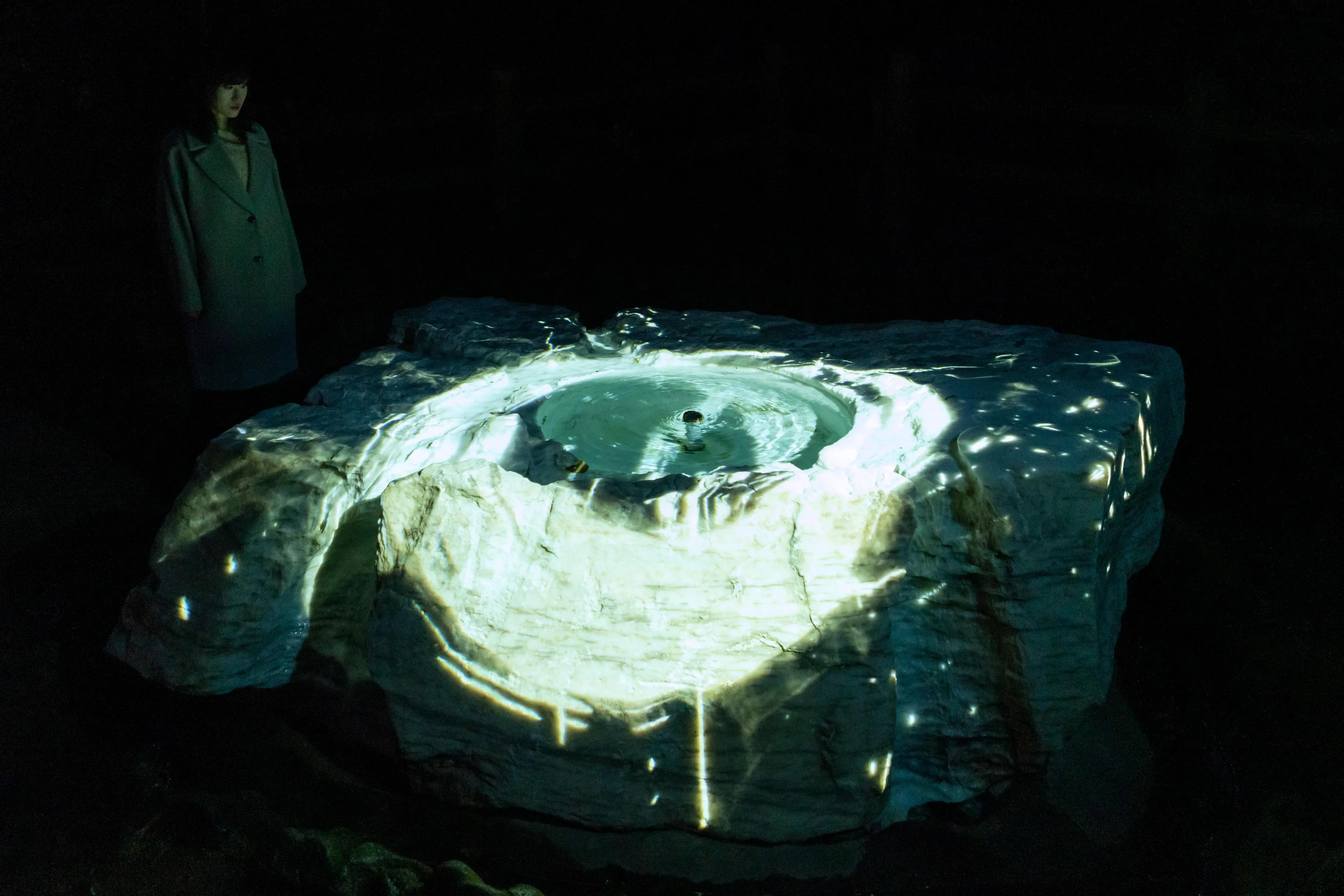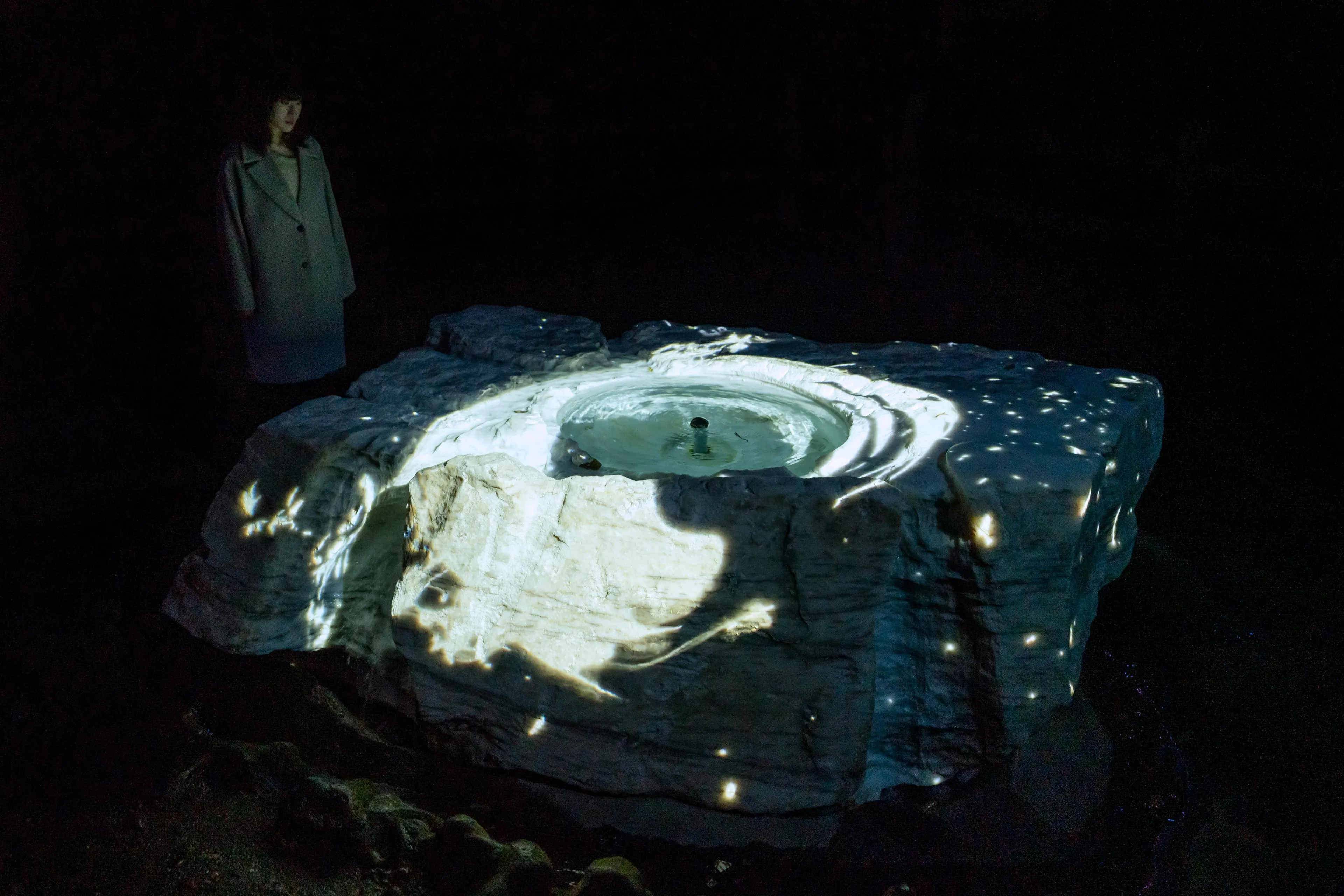 “空书”是在空间里书写的书法。书法特有的墨迹,深浅度、速度和力度,在全新诠释的空间里被立体的再构建,通过teamLab的“超主观空间”的理论结构被二次元化。书法在平面和立体之间不断巡回。