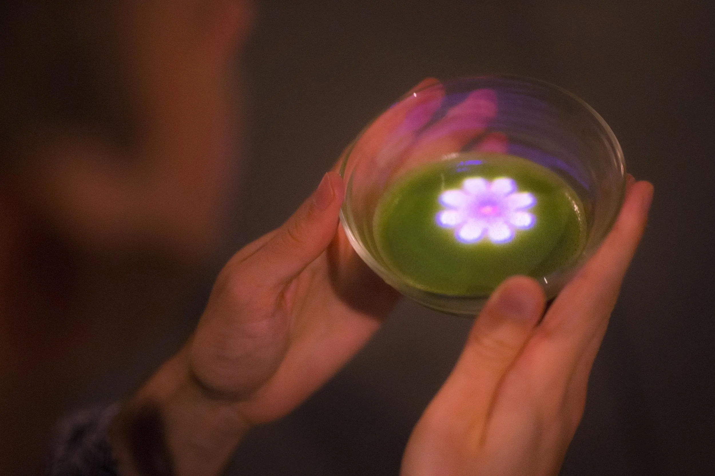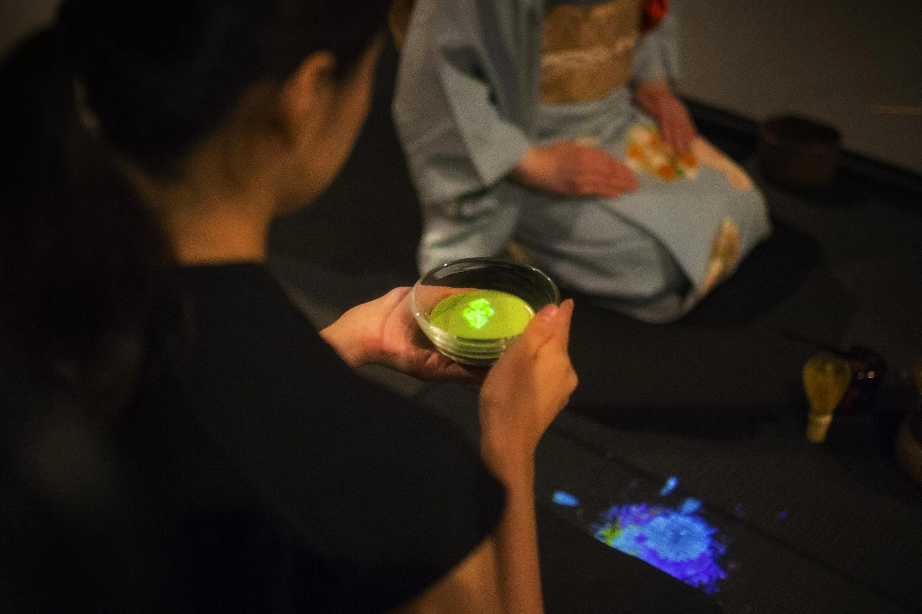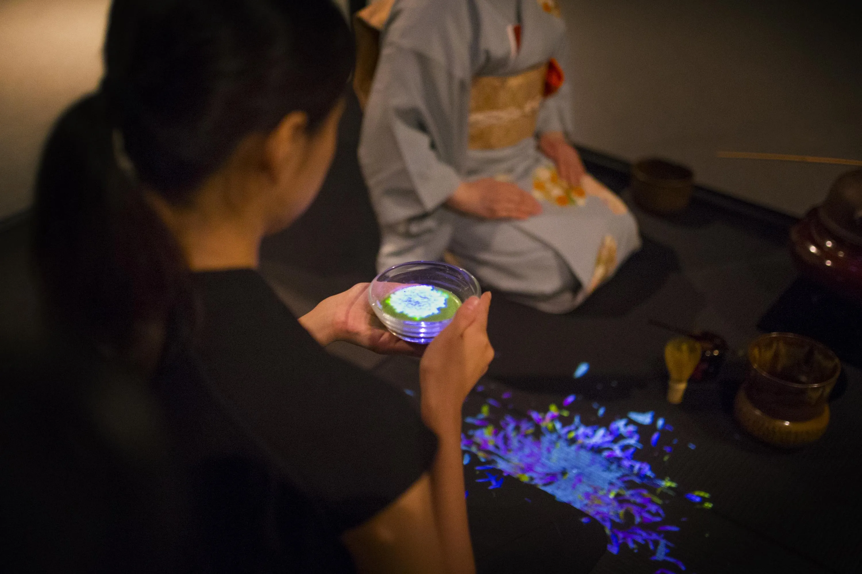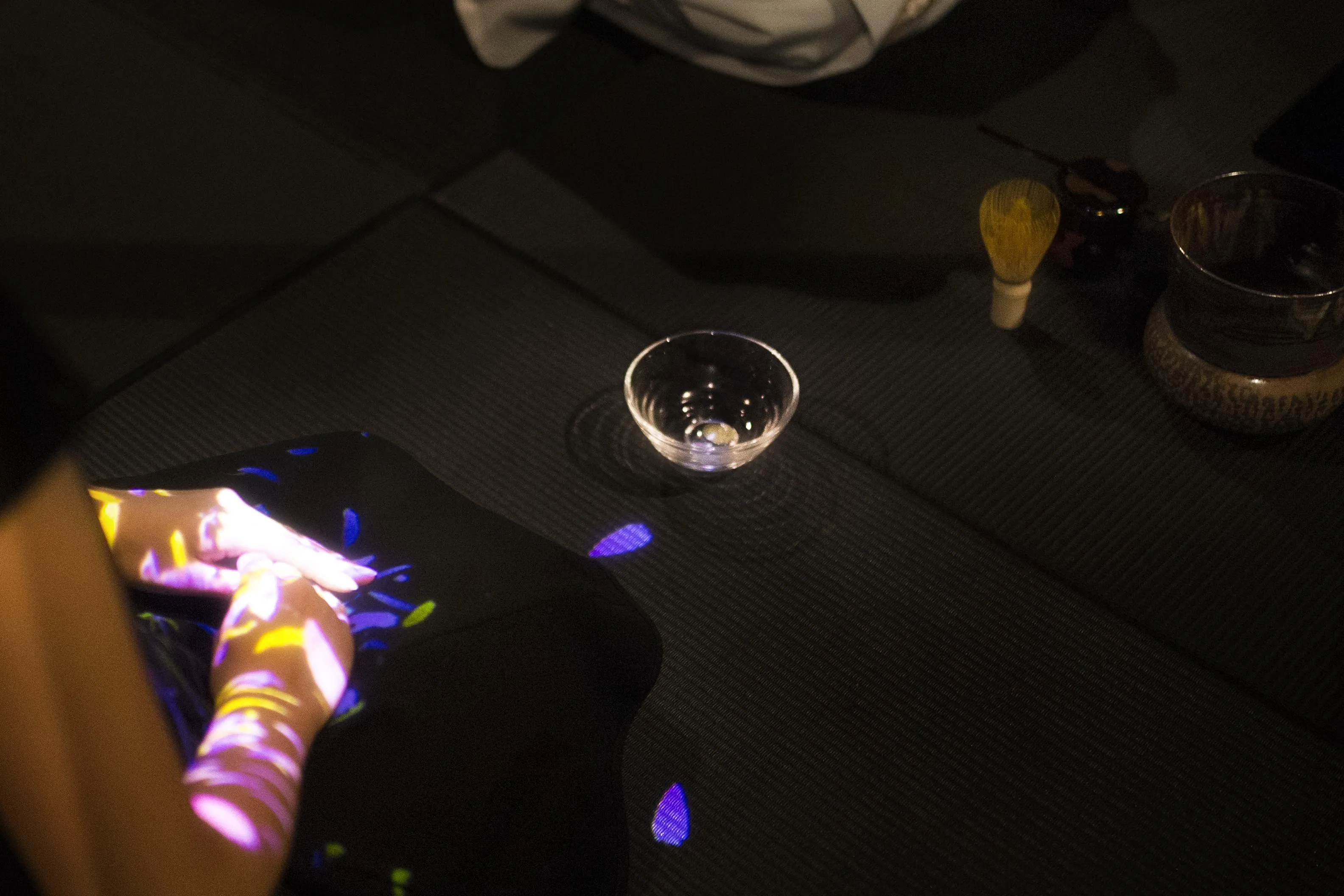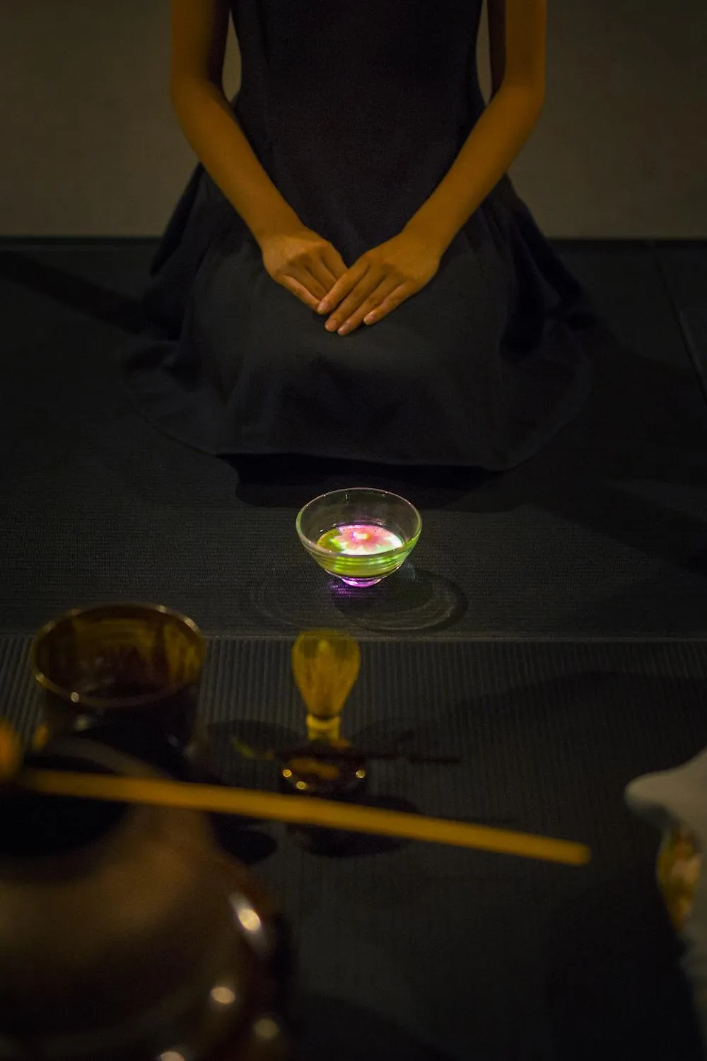 茶是一种容易变化的存在,根据茶碗中茶水量的不同,茶水面积大小也会不断改变。配合着这个变化,所诞生花朵的大小也会跟着改变。当茶水从茶碗之中溅洒而出时,该处也同样会绽开花朵。