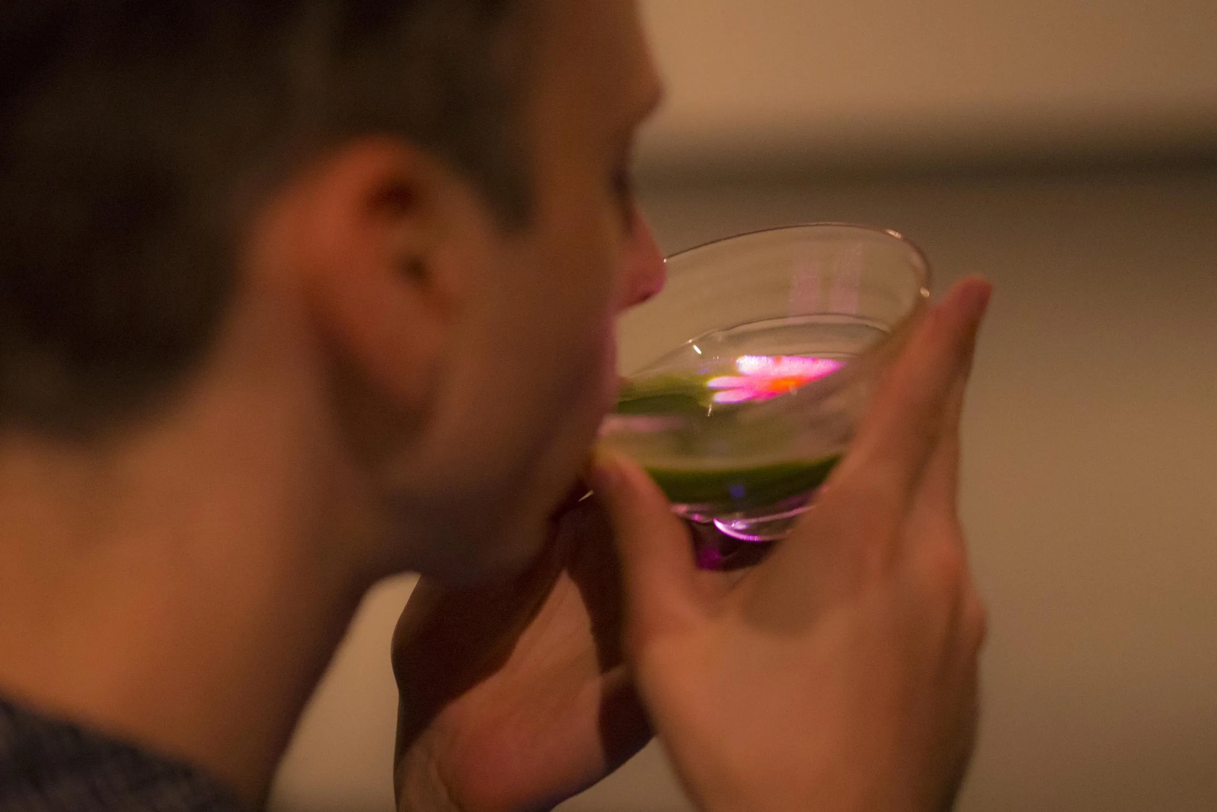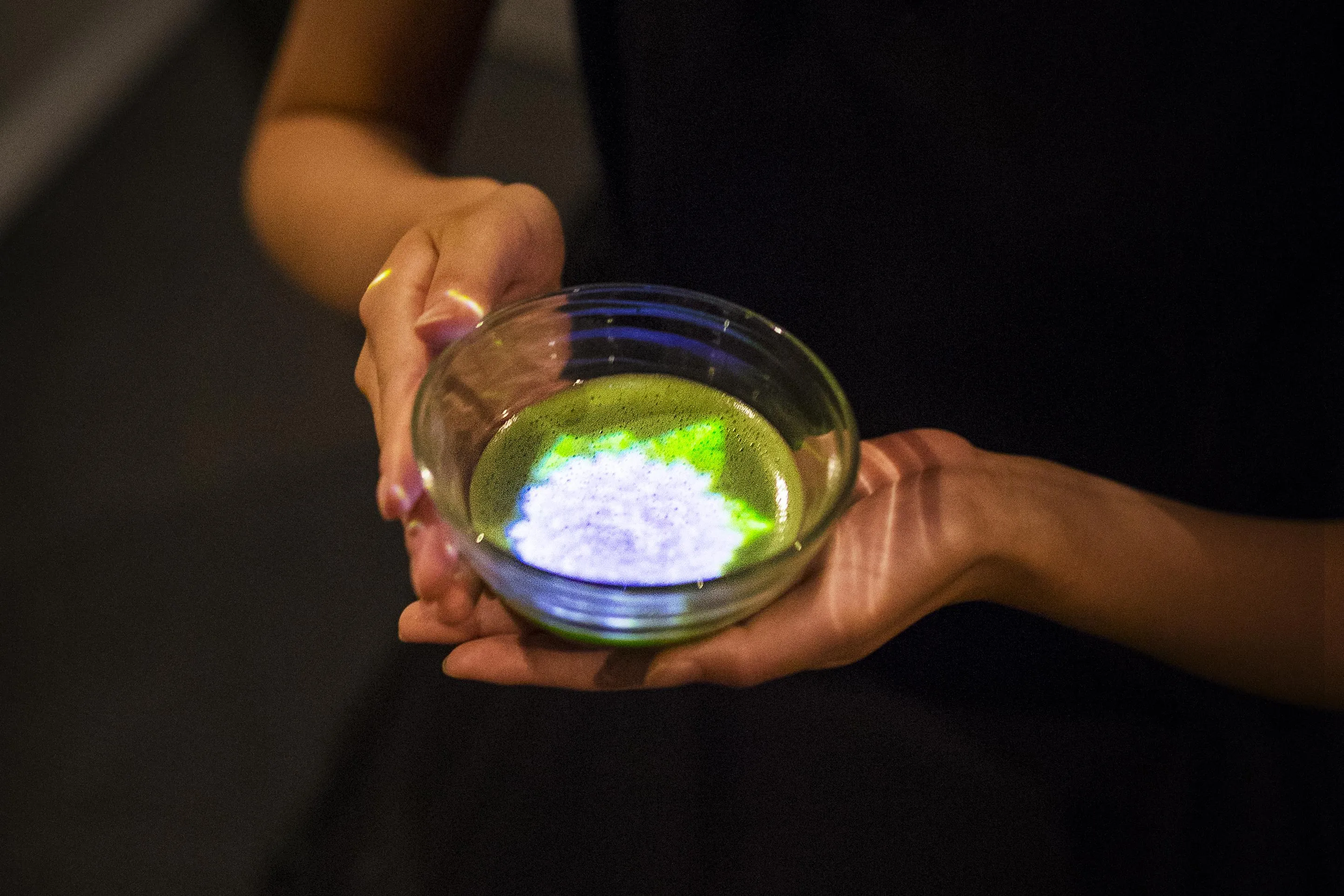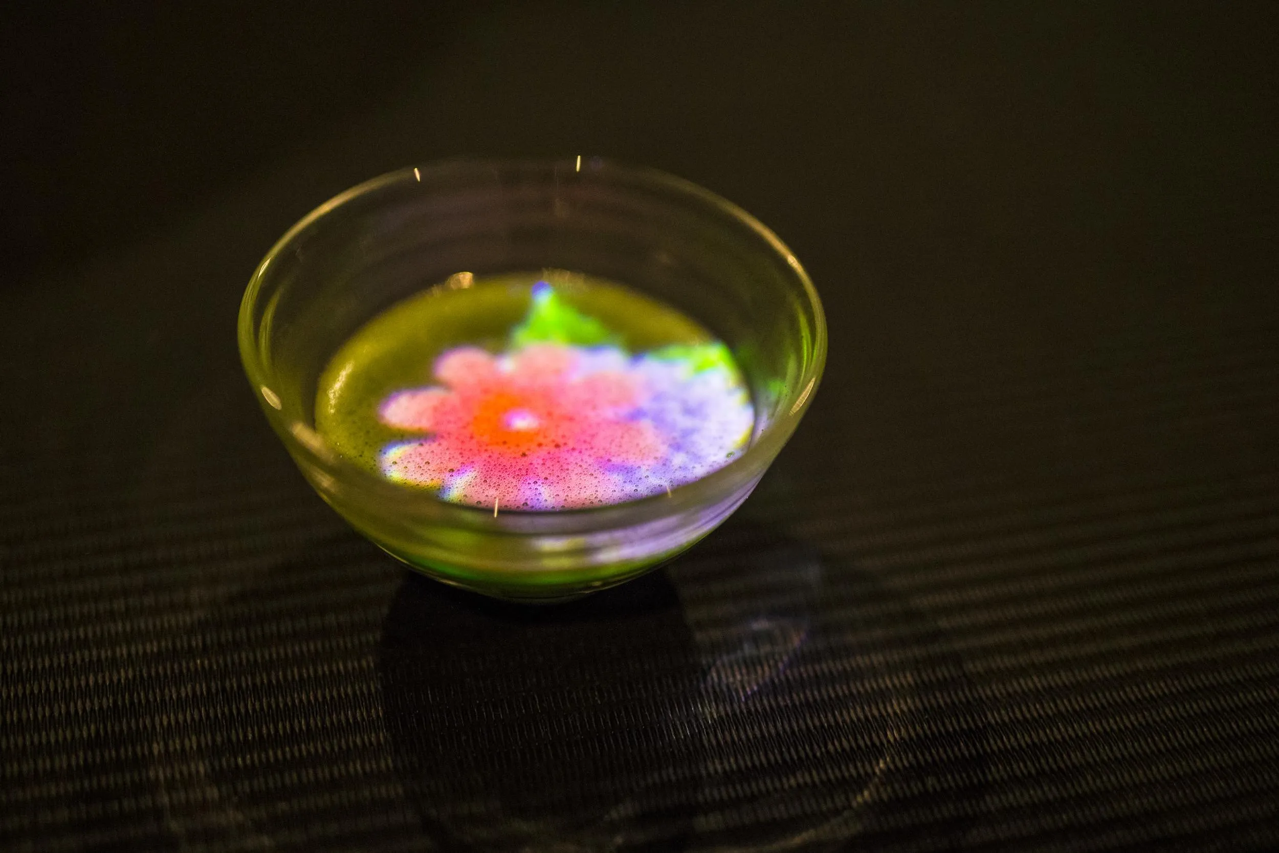 倒完茶之後,茶中会不断绽放花朵。当观赏者拿取茶碗,花朵就会散落而花瓣则会延展到茶碗之外。花朵在茶中不断绽放。只要茶碗之中还有茶水存在,花朵就会不断地绽放盛开。茶碗中的茶,就是花朵能够无限绽放的世界。如此喝茶,就如同将无限扩张的世界喝下去似的。