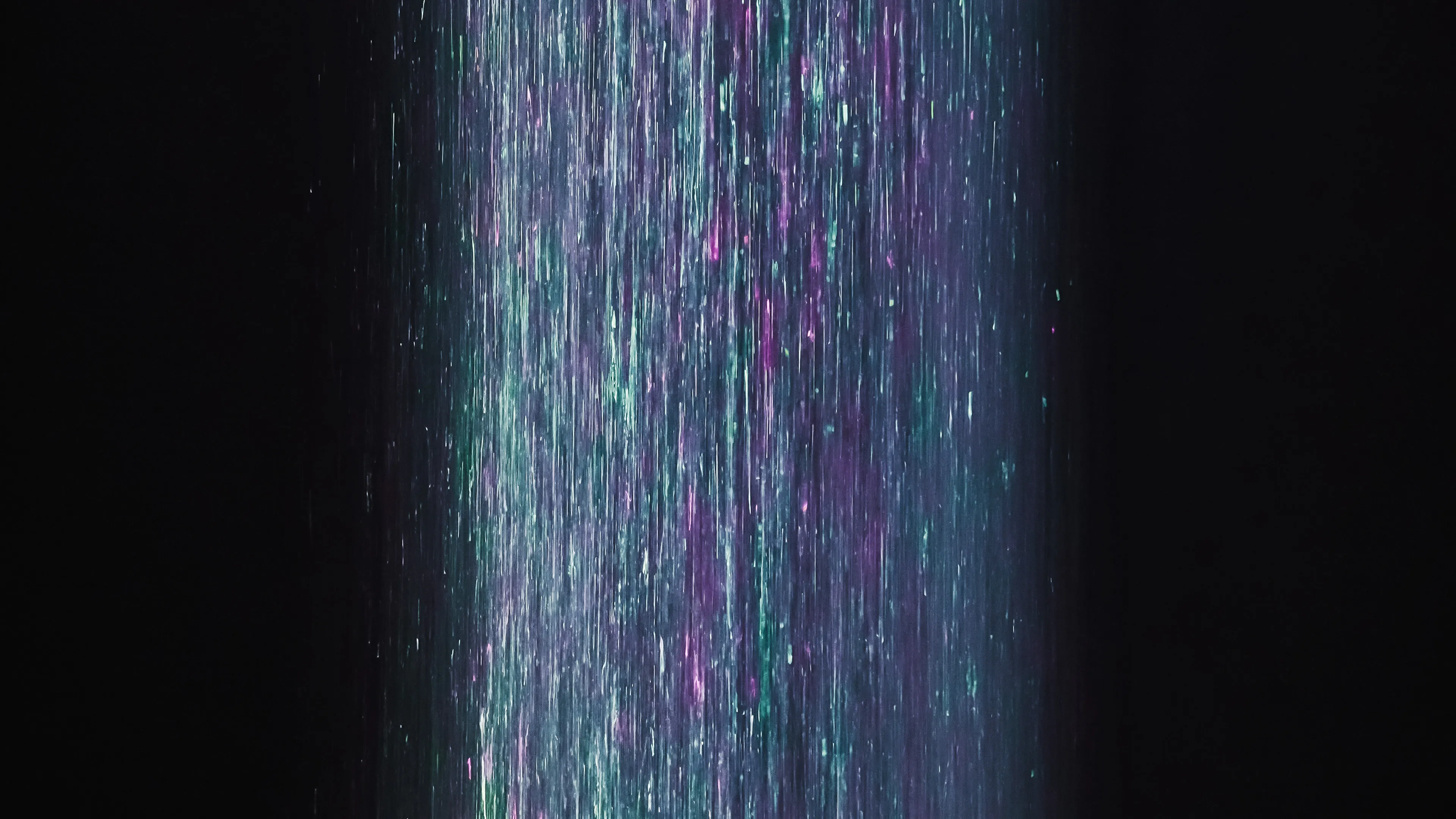 The shining particles cascade down, appearing to draw lines in space. From the combination of these lines, this artwork is born.