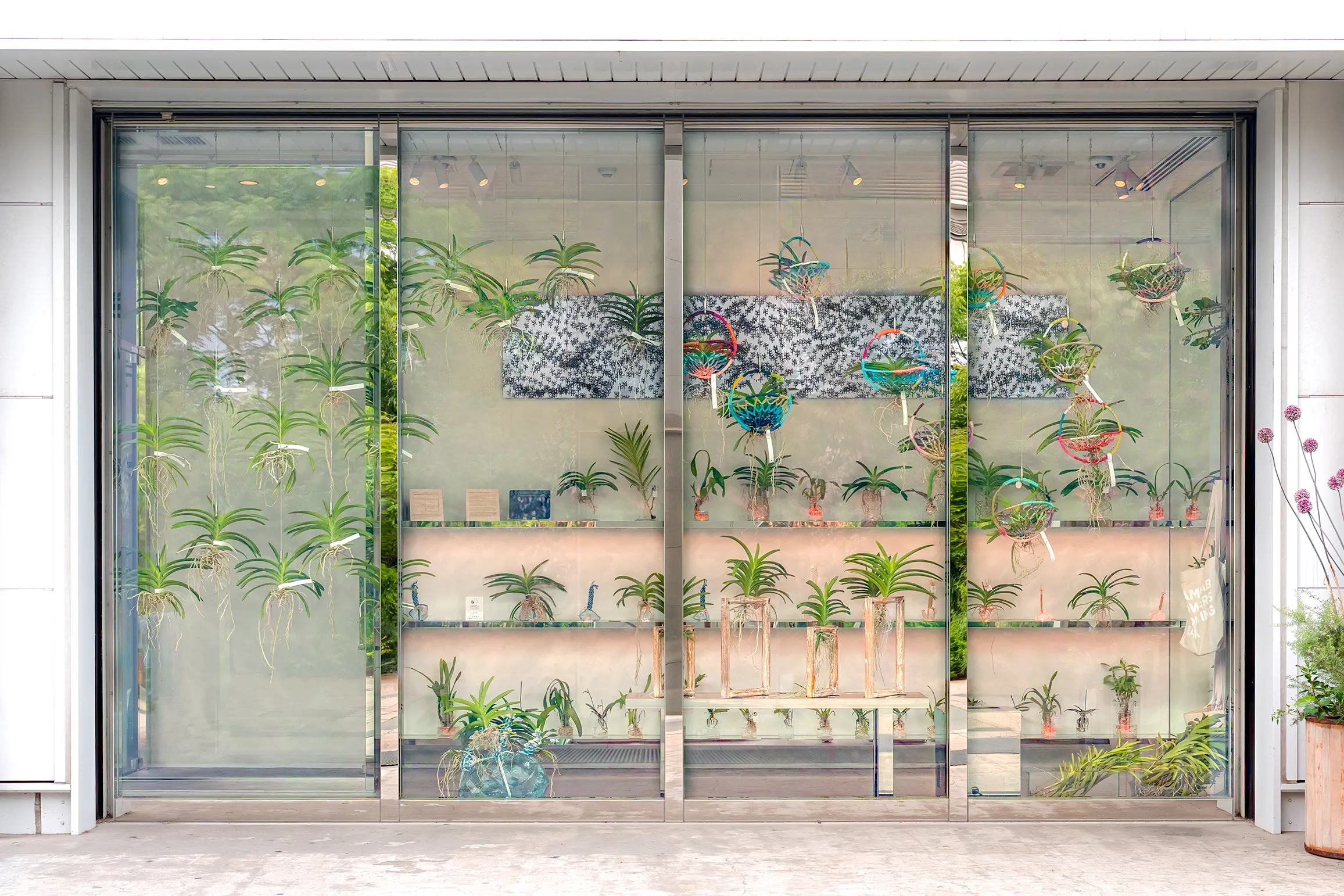 “Floating Flower Garden”的花,是隶属于兰科的花朵。在作品空间绽放的兰,本来是在树木或者岩石等,没有土壤的地方生存。虽然花朵已经凋落,但只要经过精心培育就会再次开花。据说兰可以存活超过100年,并且通过新生的分枝永久的存活下去。