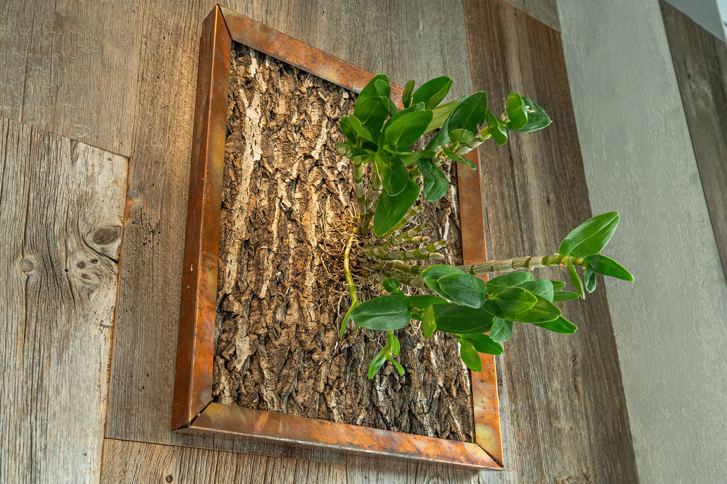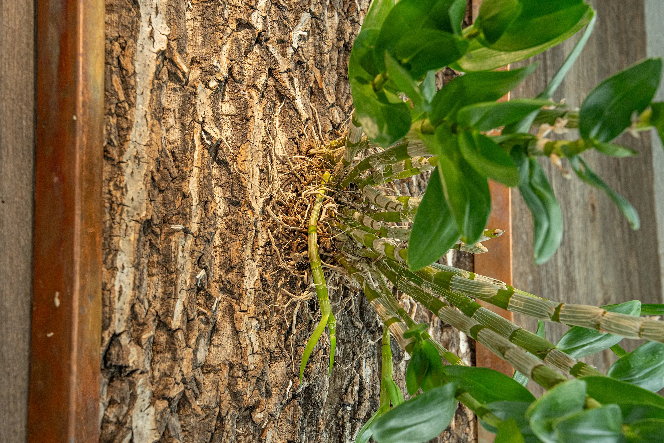这个兰,原本是在没有土的岩石或者树干上生育。在适度的风雨,阳光,水分的环境下,这个兰可以永生。本作品在与外部连续的开放环境中具有永久的特性。