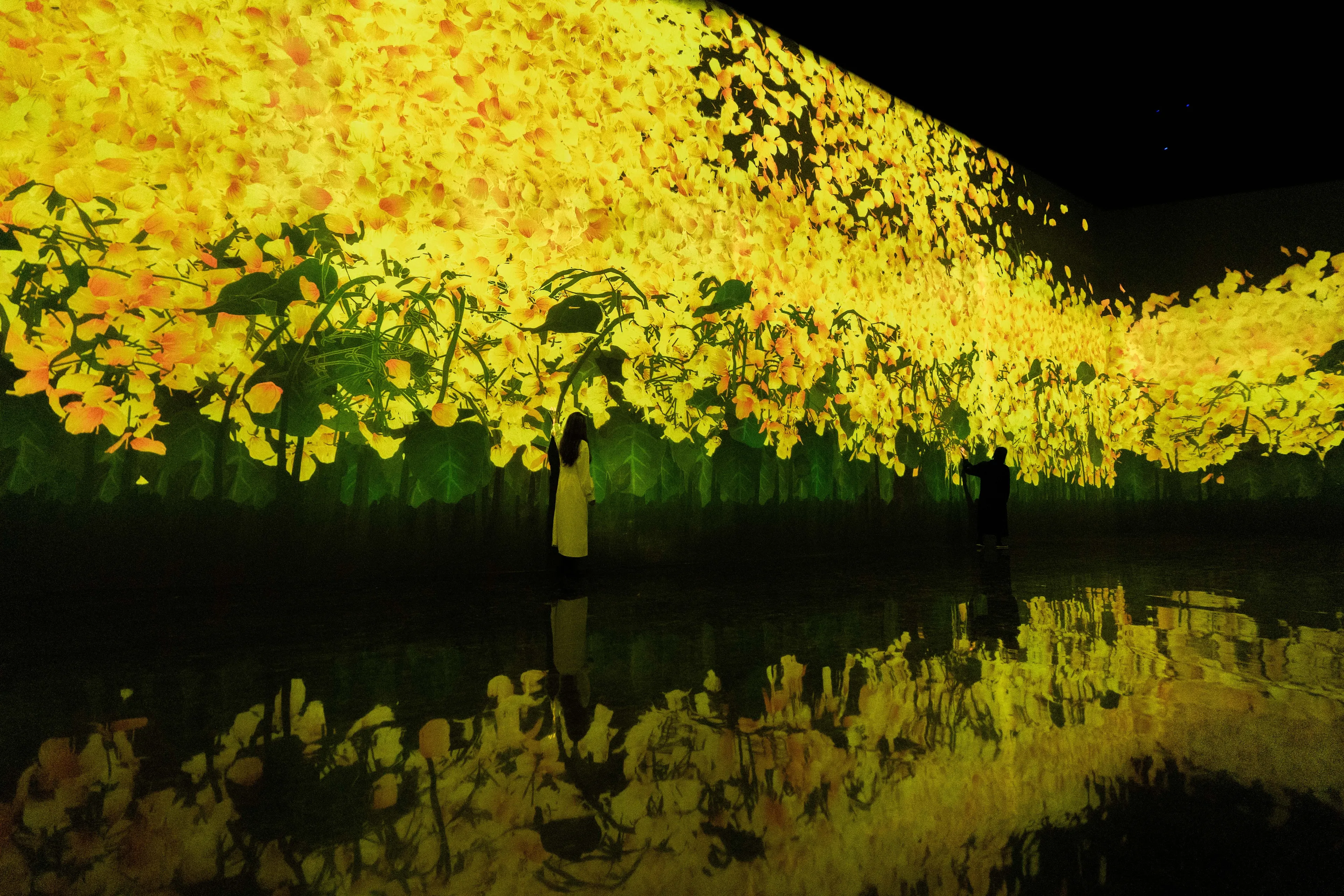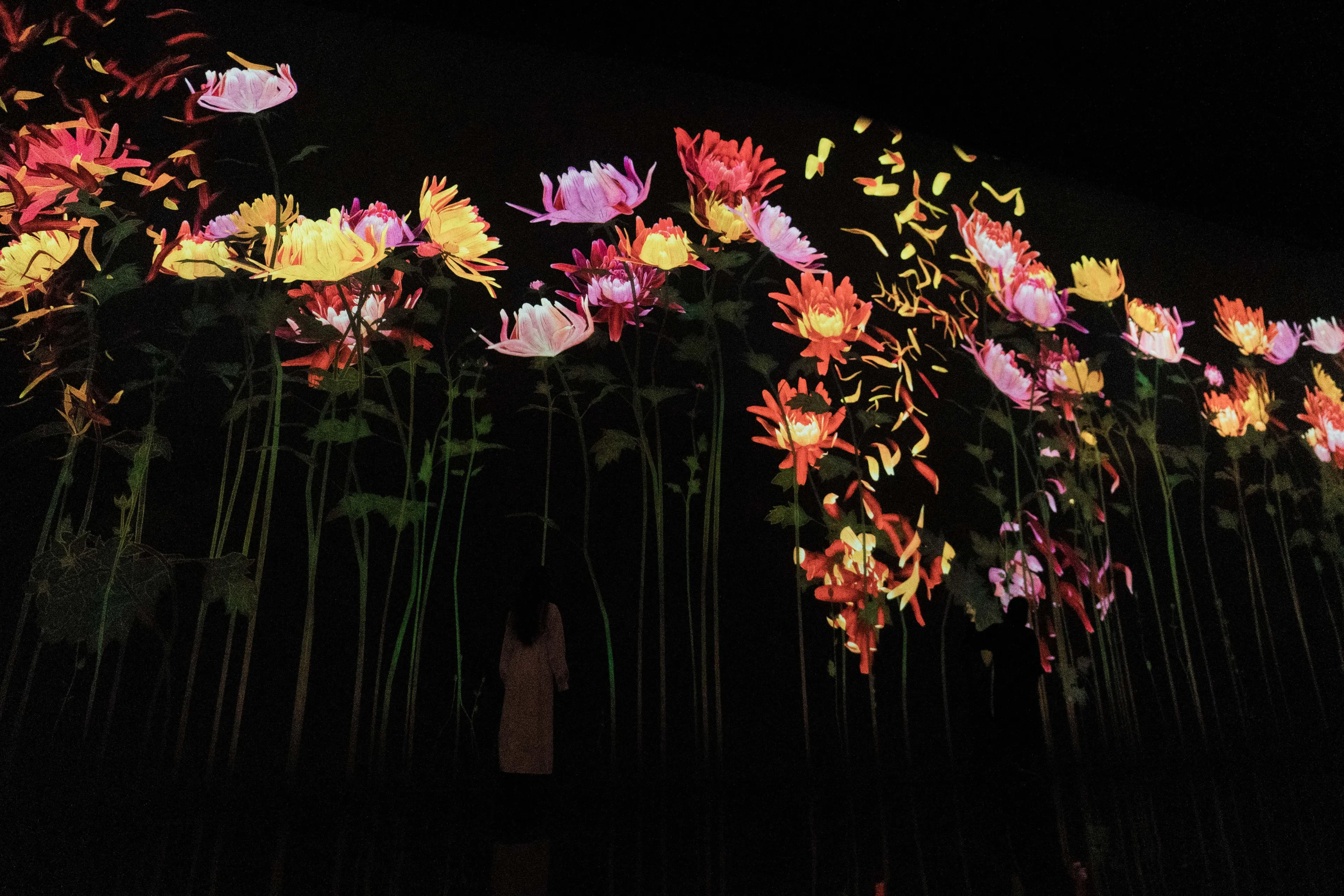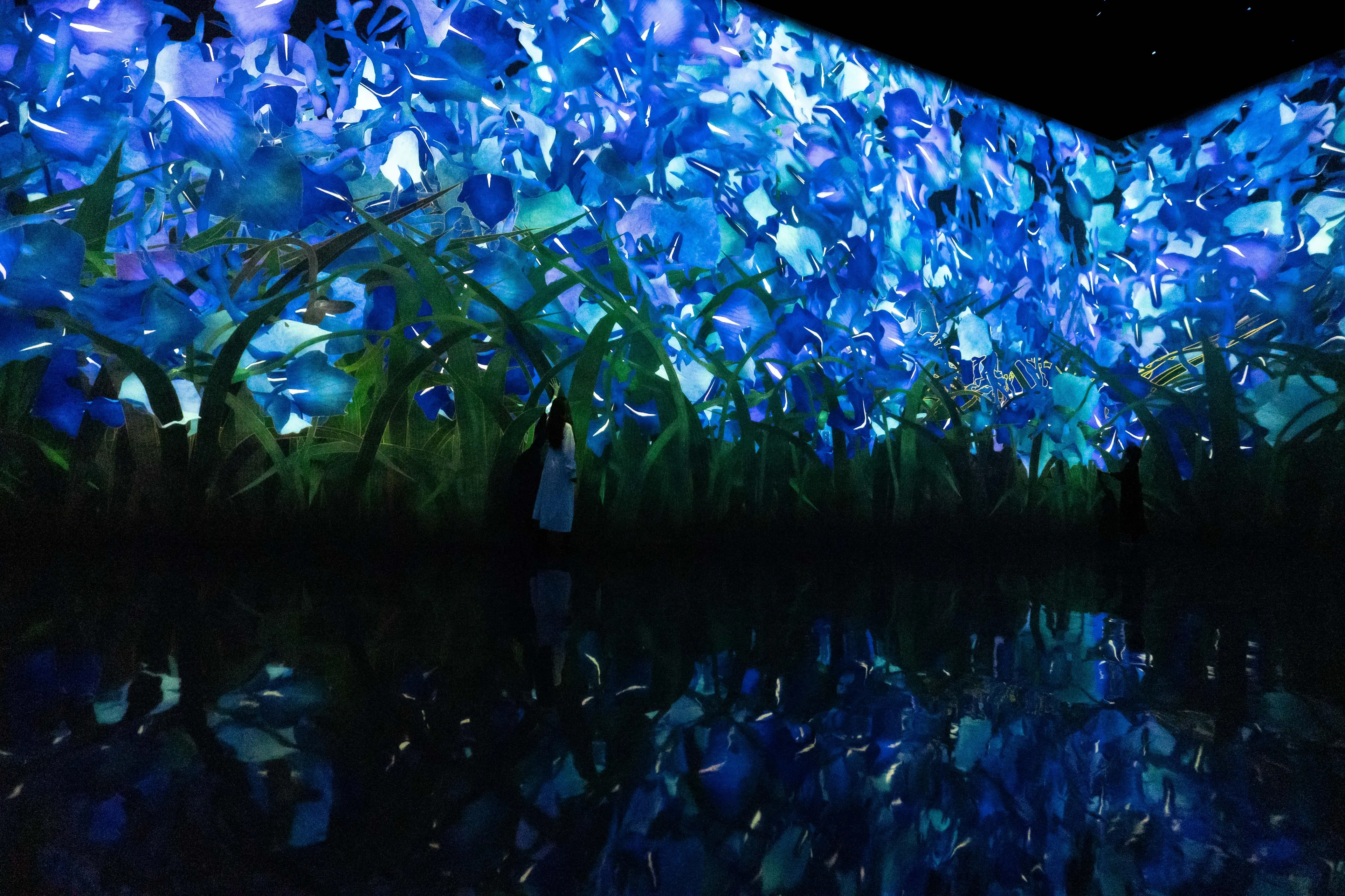 作品的世界,是基于teamLab所发想的「超主观空间」理论平面化而来的,因此不同于由镜头或透视法平面化而来的空间,观赏者的视角不会被固定,身体也会变得自由可动。映出作品世界的墙壁不会成为我们与作品的界线,花与作品的边界面变得模糊,作品世界与人们身体所在的空间互相连续。