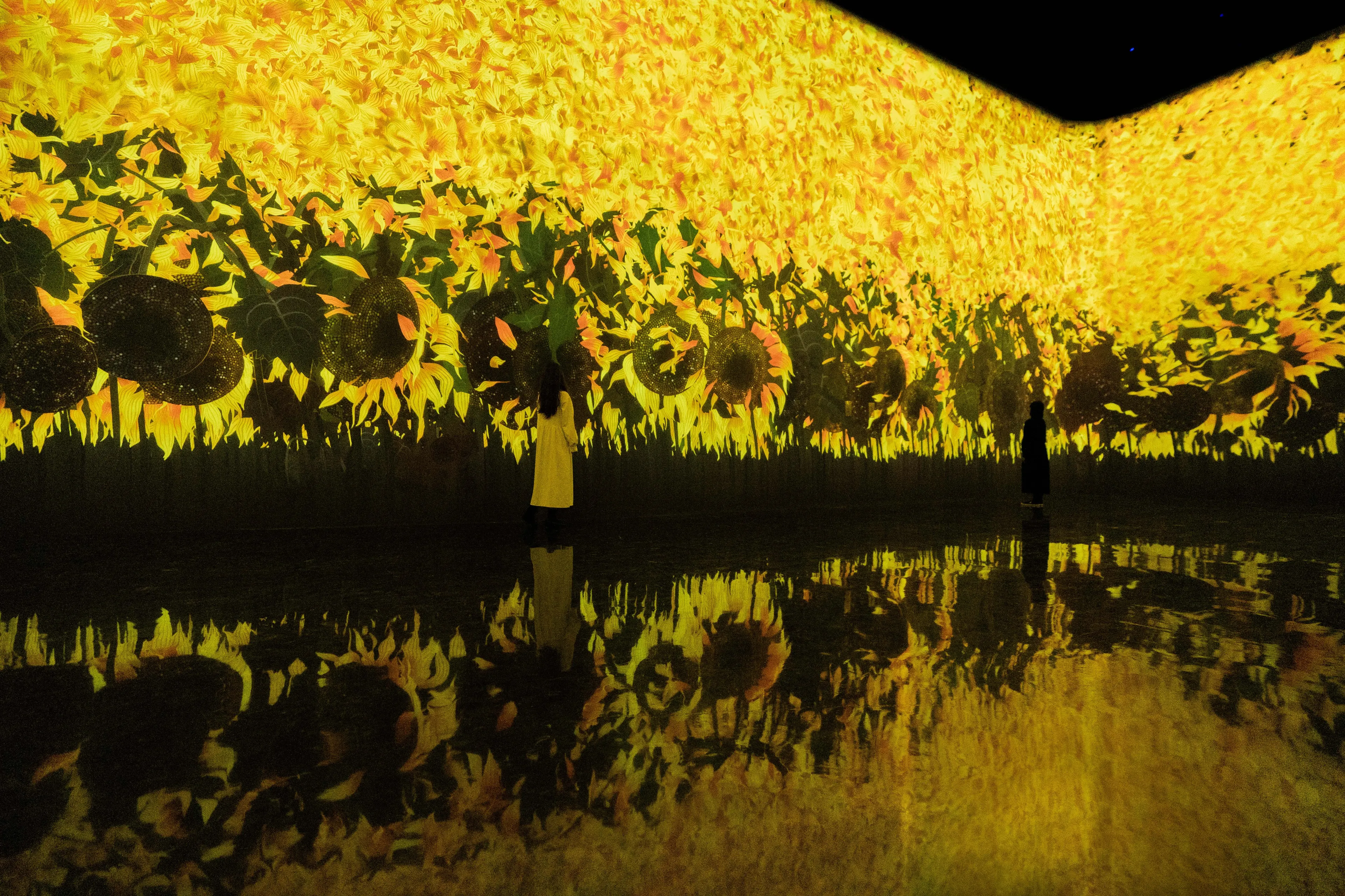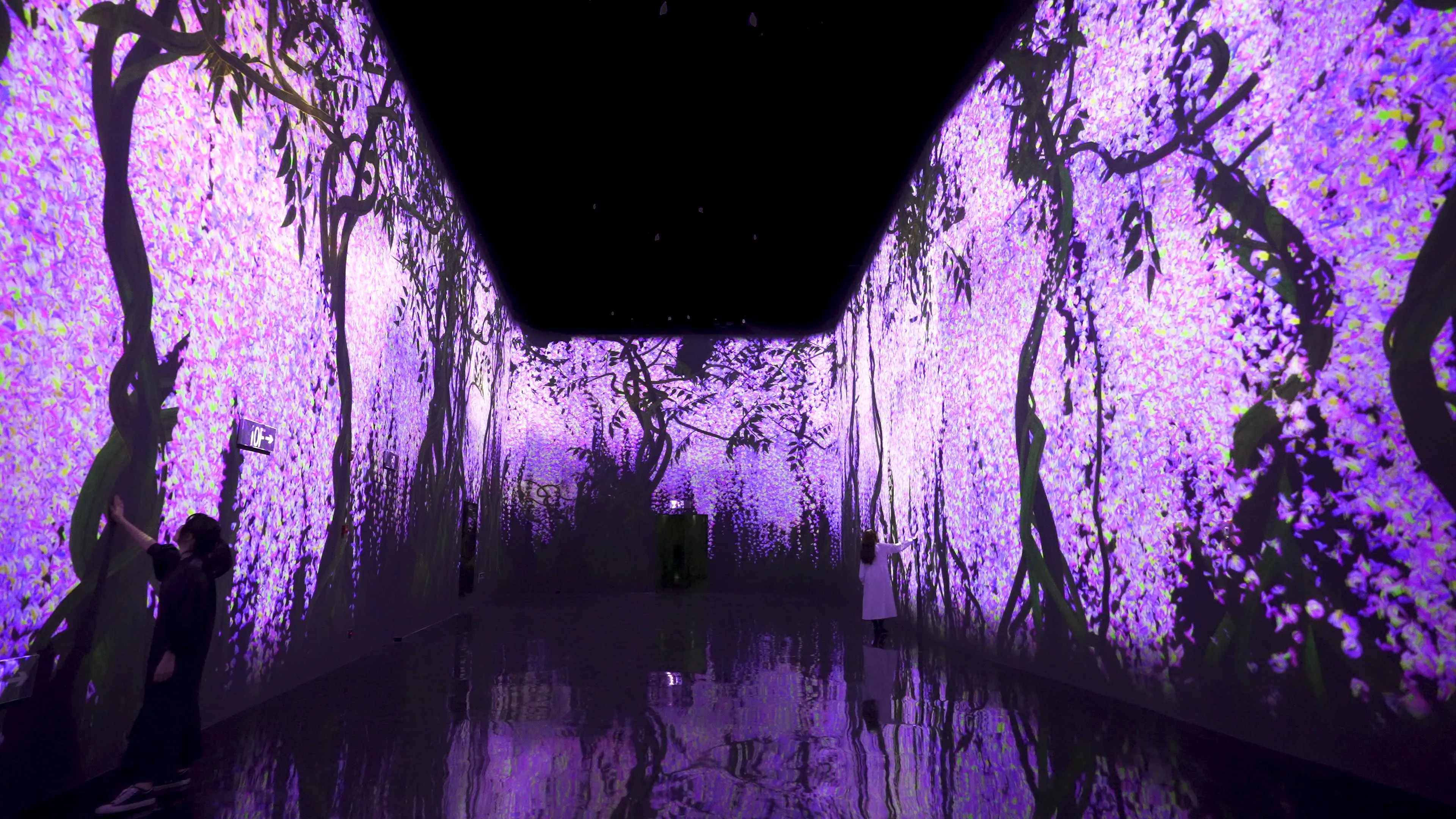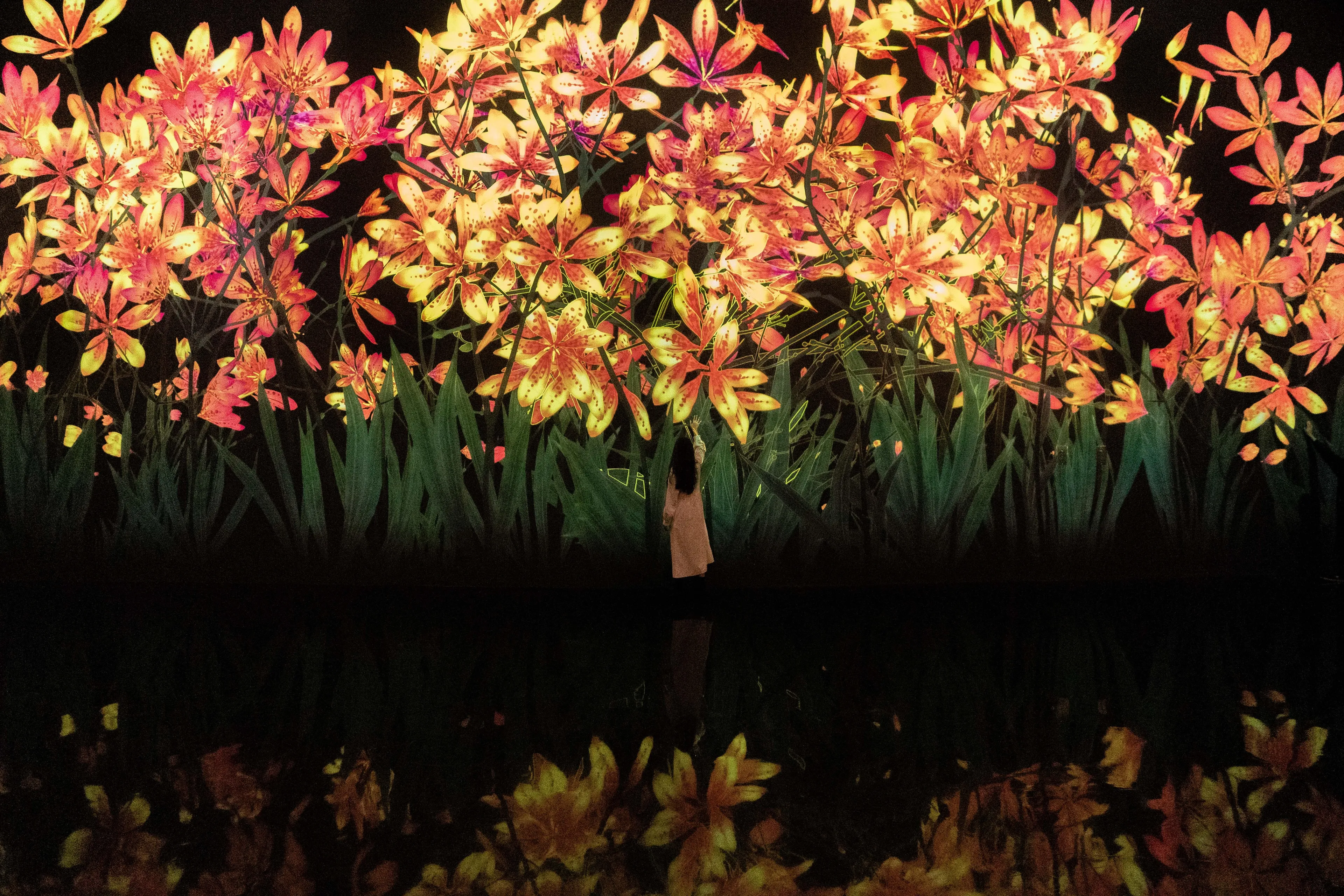 作品的世界,是基于teamLab所发想的「超主观空间」理论平面化而来的,因此不同于由镜头或透视法平面化而来的空间,观赏者的视角不会被固定,身体也会变得自由可动。映出作品世界的墙壁不会成为我们与作品的界线,花与作品的边界面变得模糊,作品世界与人们身体所在的空间互相连续。