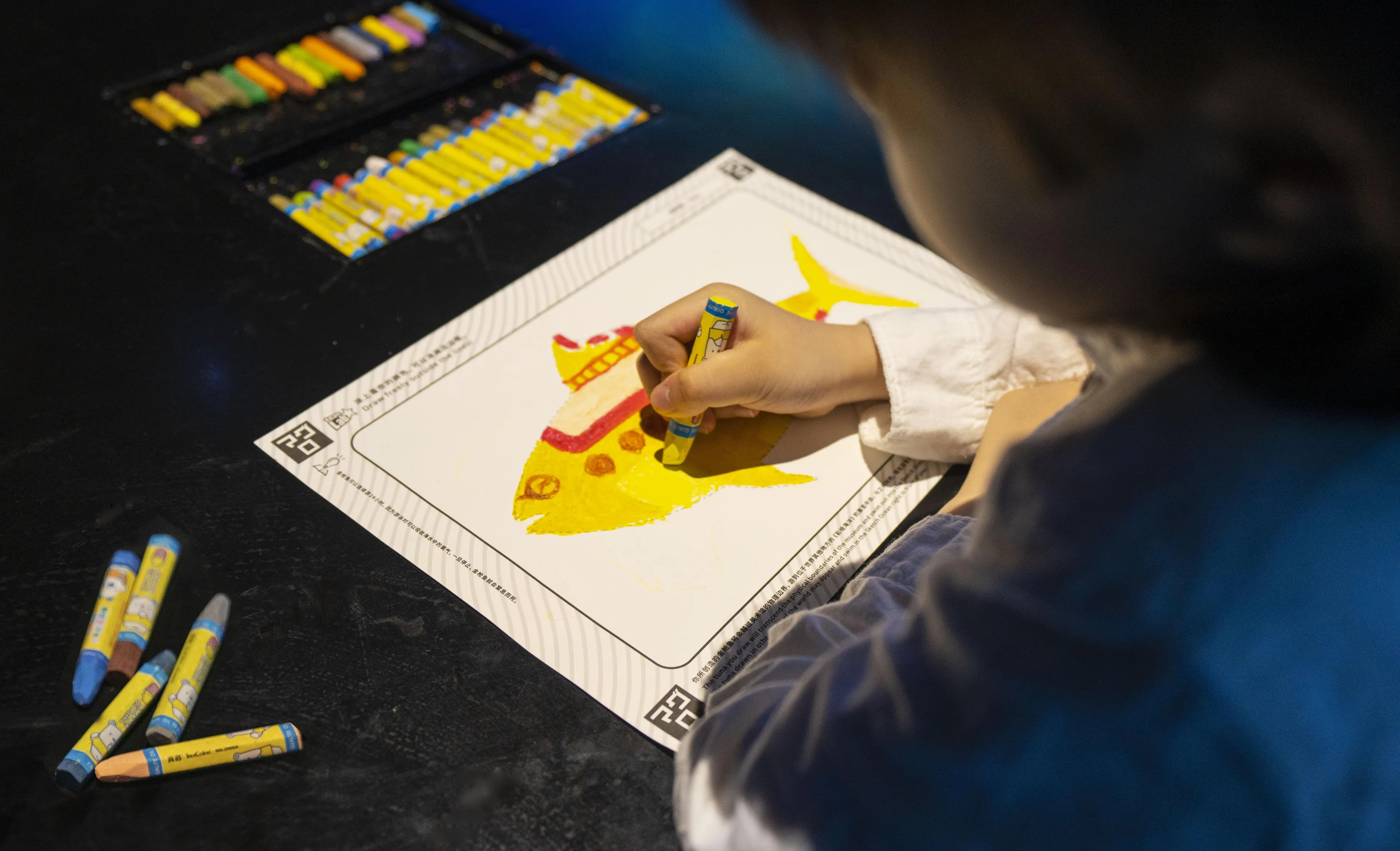 在已经画有鱼类轮廓的着色纸上涂上颜色。2