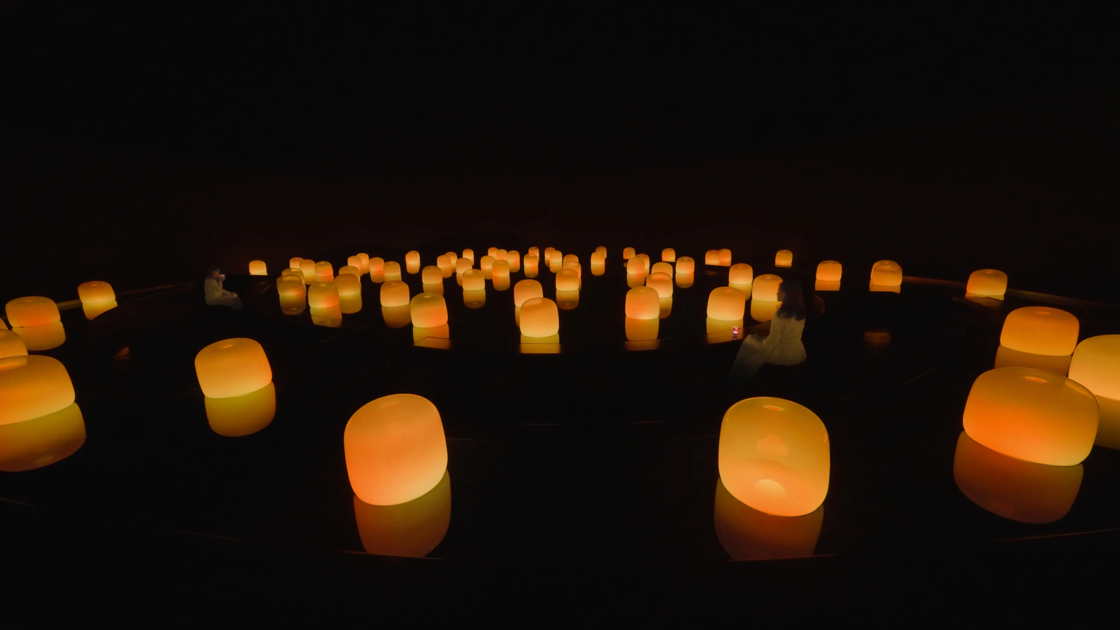 Tea in Spontaneous Order interacts with nearby Tea in Spontaneous Order and the Floating Lamps, causing a spontaneous order phenomenon, in which the flickering rhythms converge.