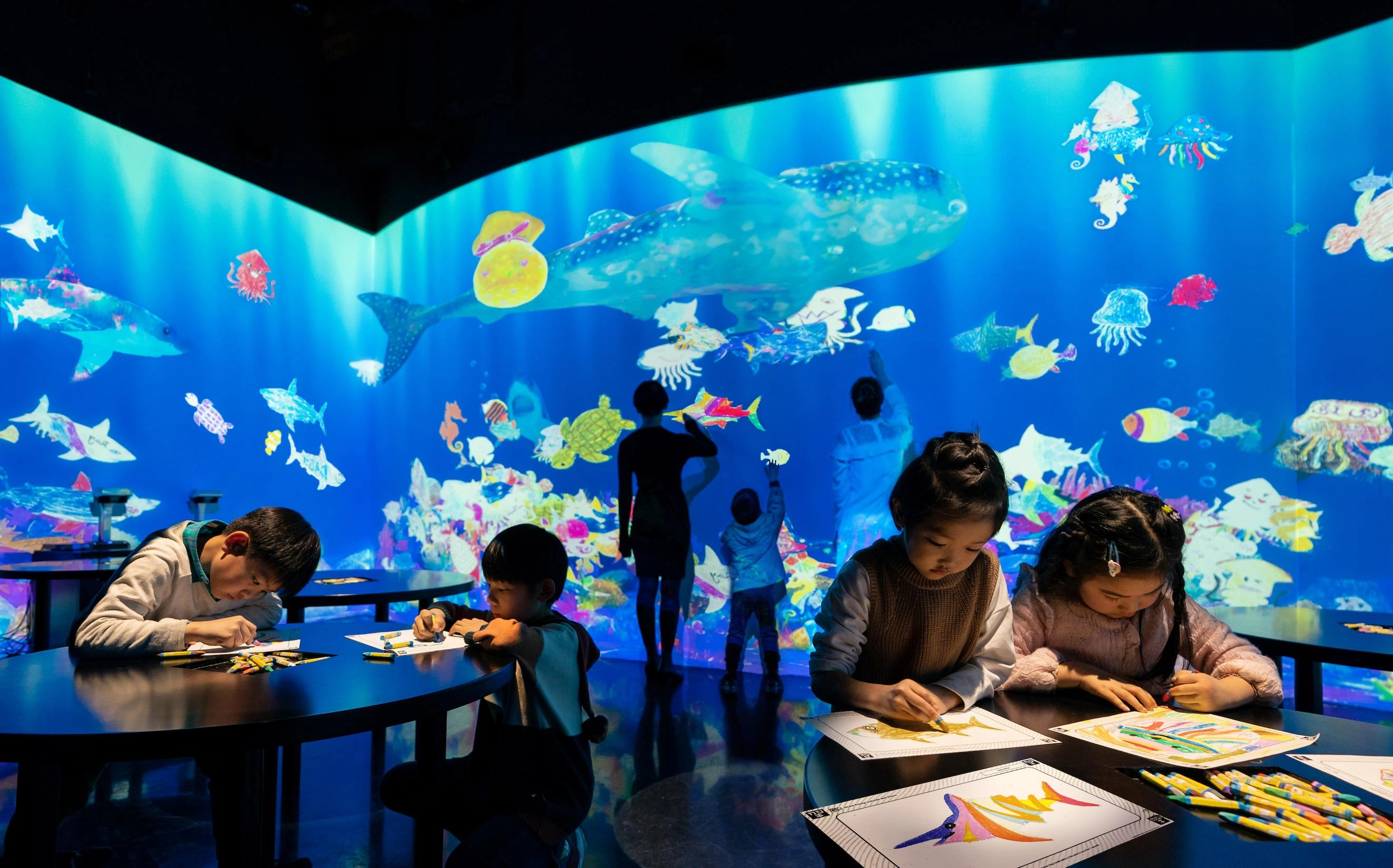 The fish drawn in teamLab: Sketch Ocean travel to teamLab: Continuity in the Akiko Yamazaki and Jerry Yang Pavilion