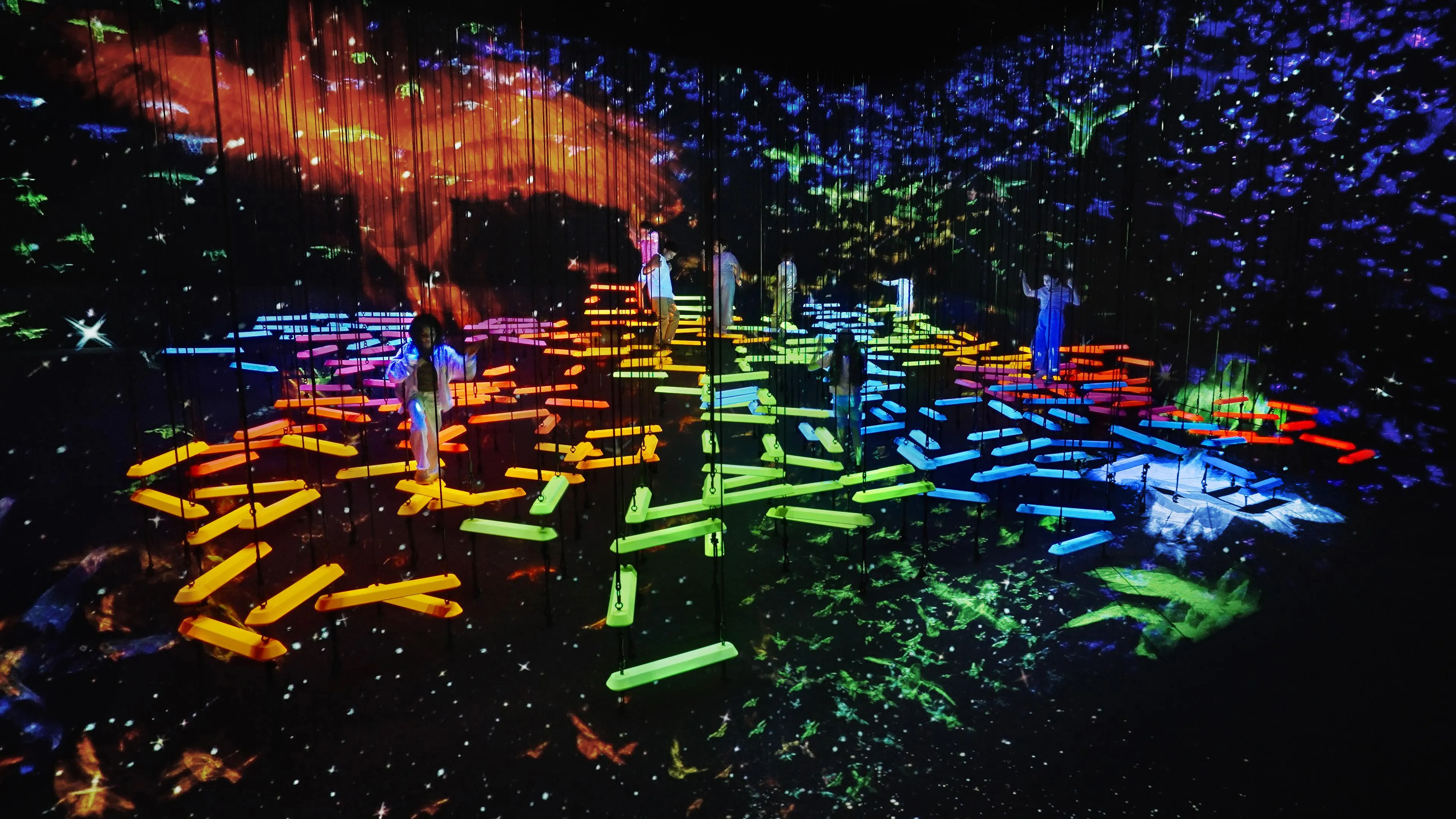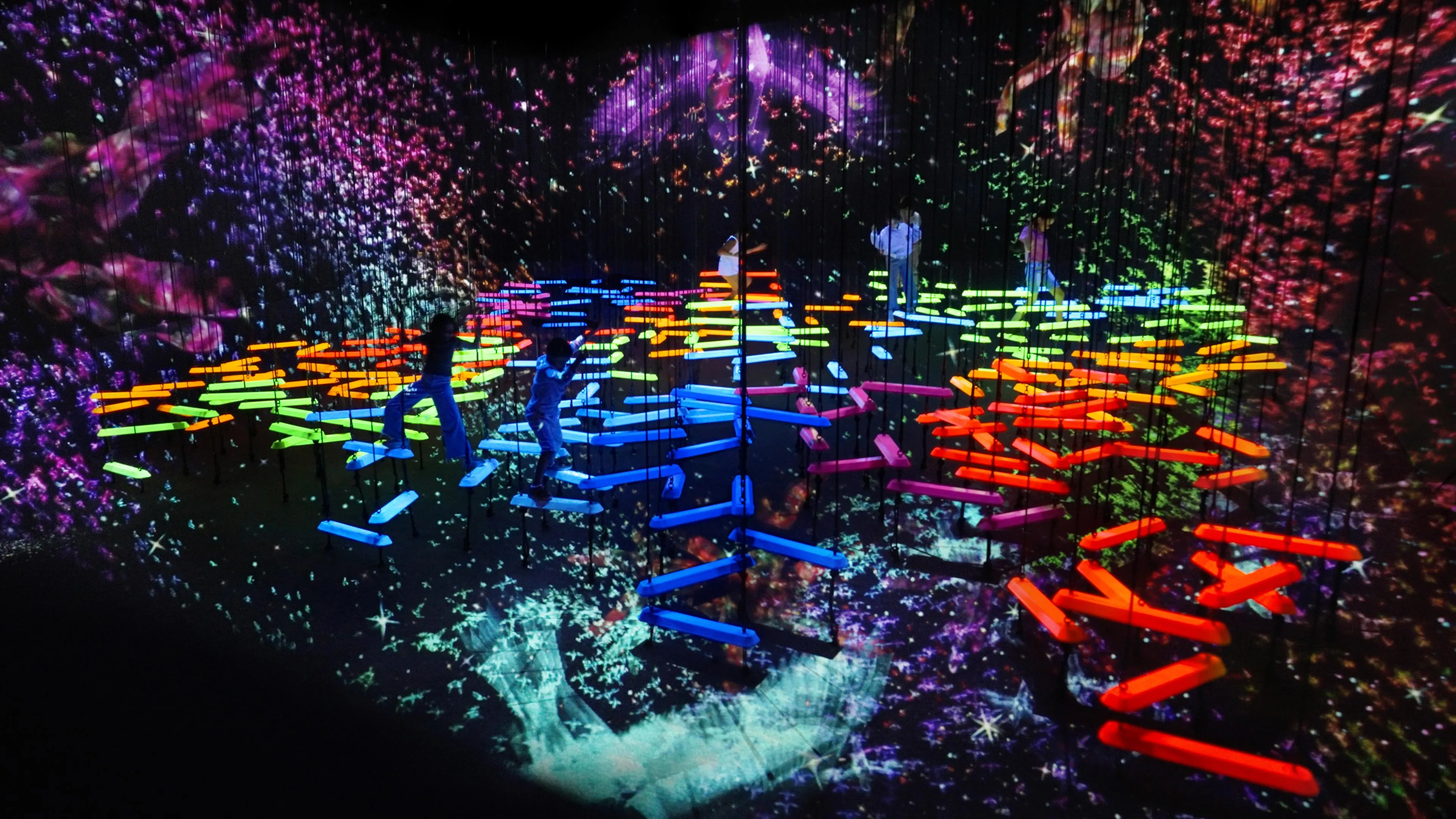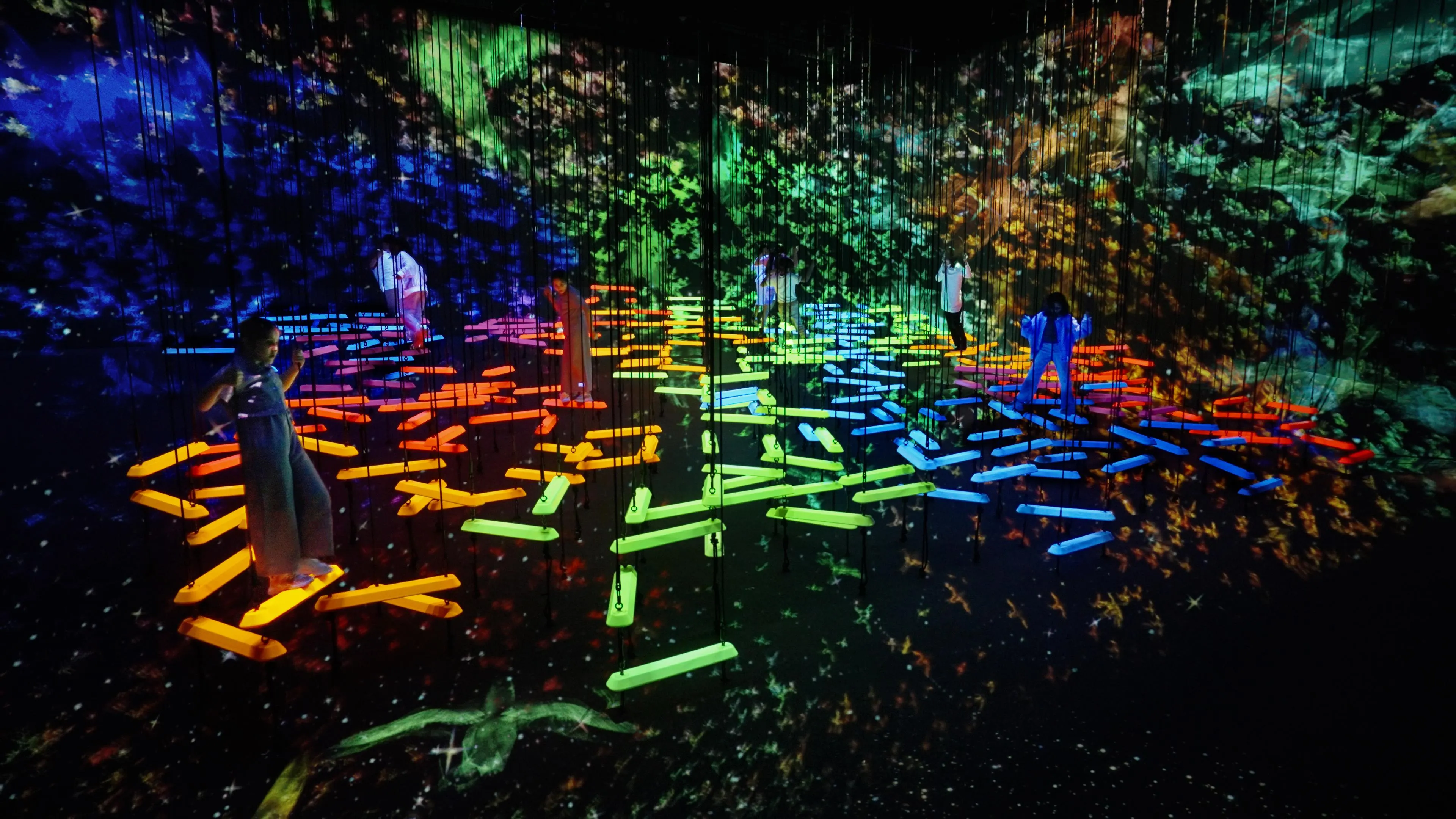 When people climb onto the bars, they shine brightly and produce a sound specific to its color. The more people climb onto bars of different colors, the more sounds will be played at the same time.