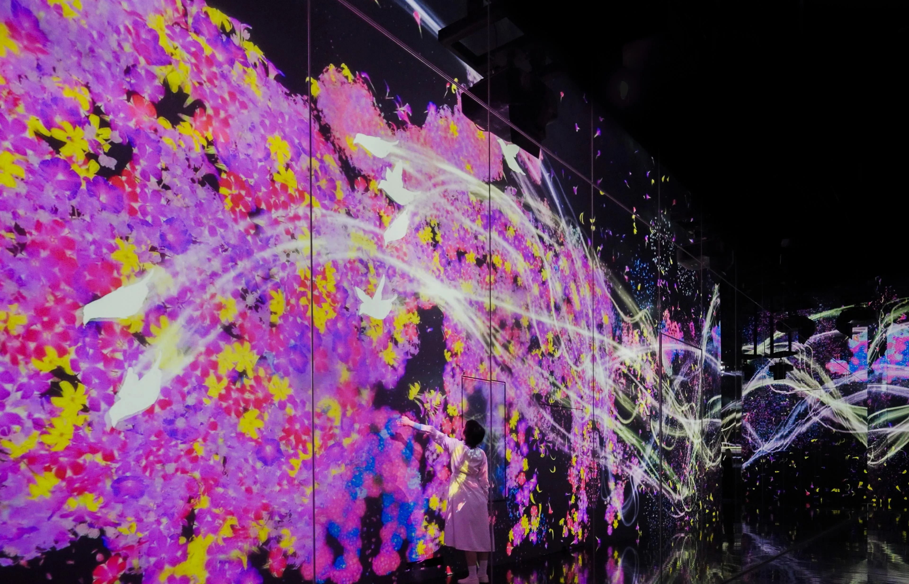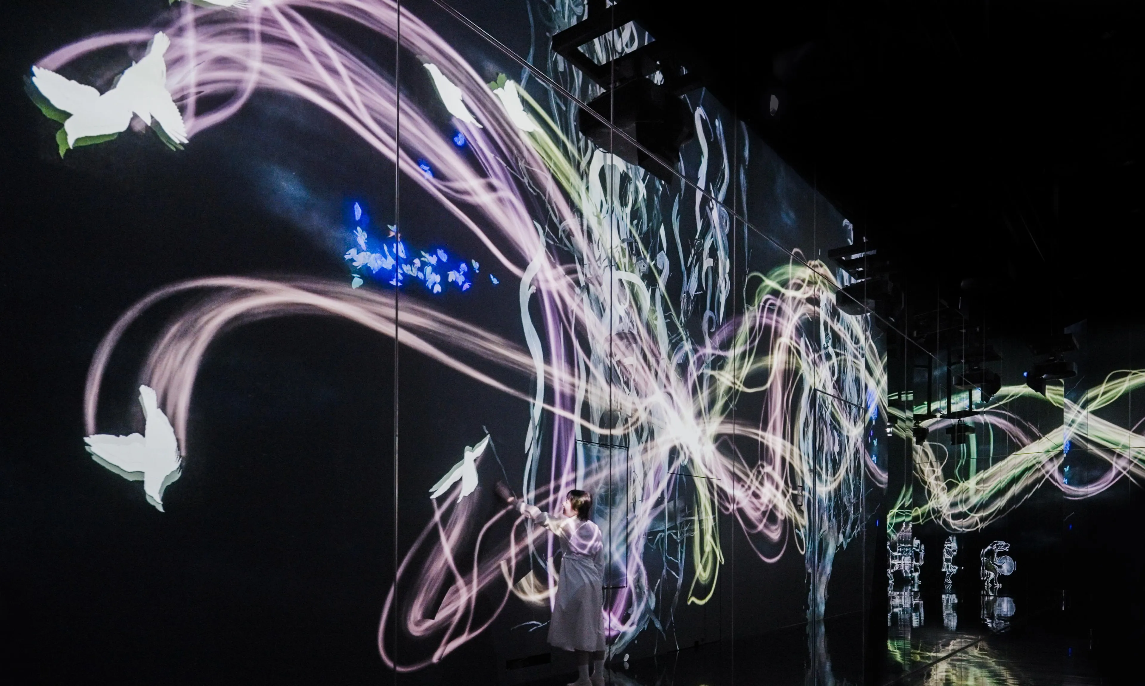 Les corbeaux sont rendus en lumière à mesure qu'ils volent autour de l'espace, laissant des traces lumineuses sur leurs chemins qui viennent créent une calligraphie spatiale. Les corbeaux se poursuivent les uns les autres et à leur tour, ils se font eux-mêmes poursuivre. Lorsque les corbeaux poursuivis se percutent, ils se dispersent et se transforment en fleurs. Les corbeaux tentent de voler autour des gens dans l'espace, mais lorsqu'ils percutent un spectateur, ils se dispersent et se transforment en fleurs de la même manière.