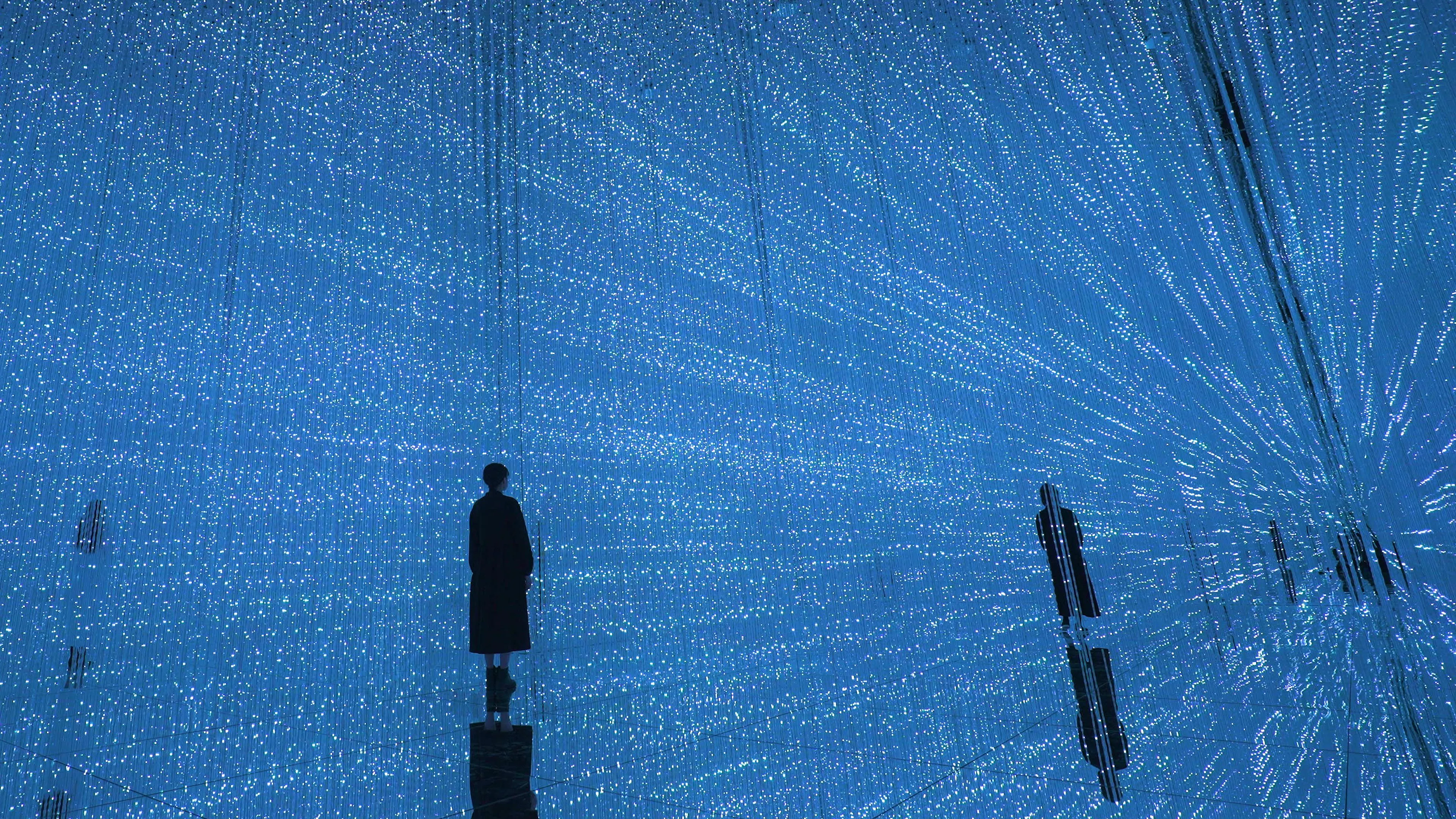 Pointillism uses an accumulation of distinct dots of color to create a picture. Here, light points are used to create three-dimensional objects. The light sculpture extends infinitely in all directions.