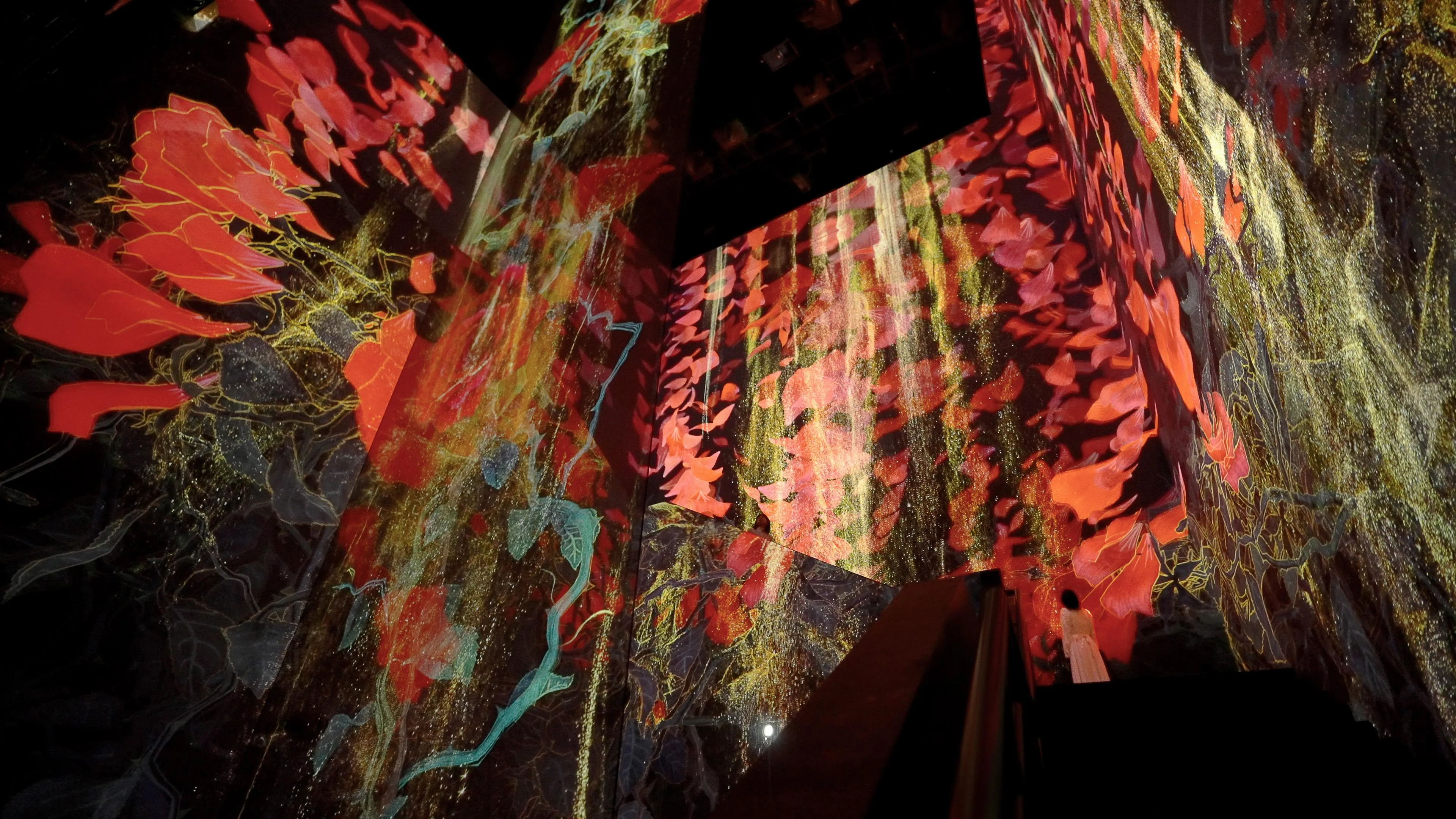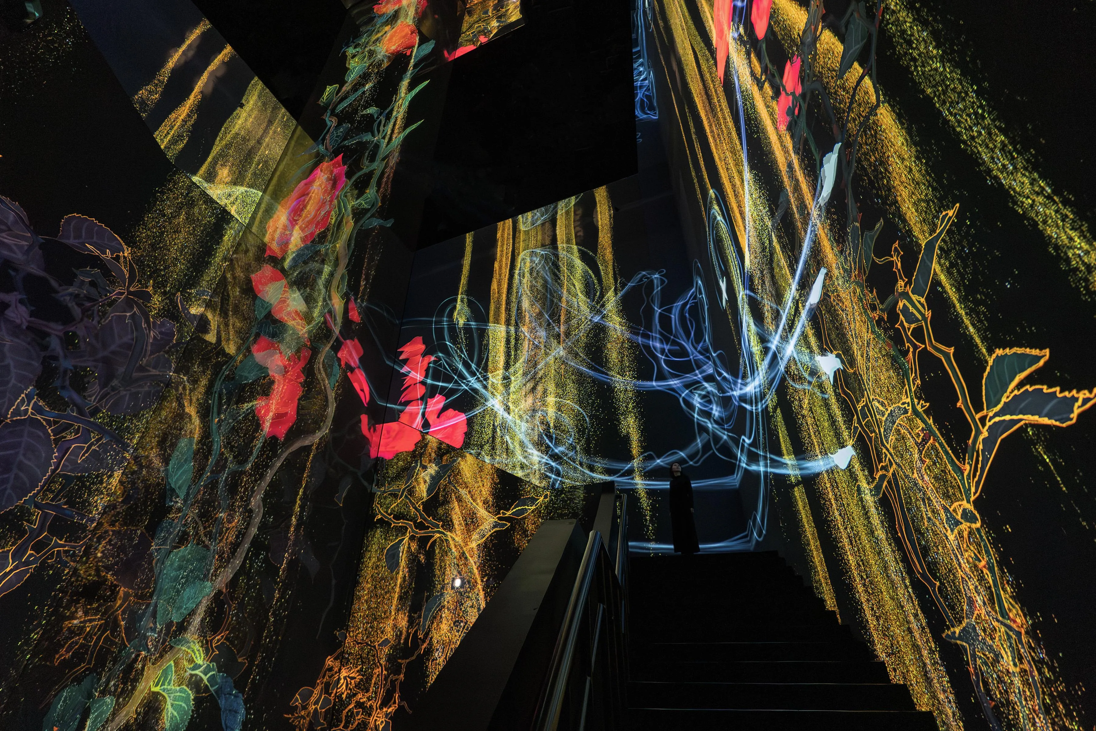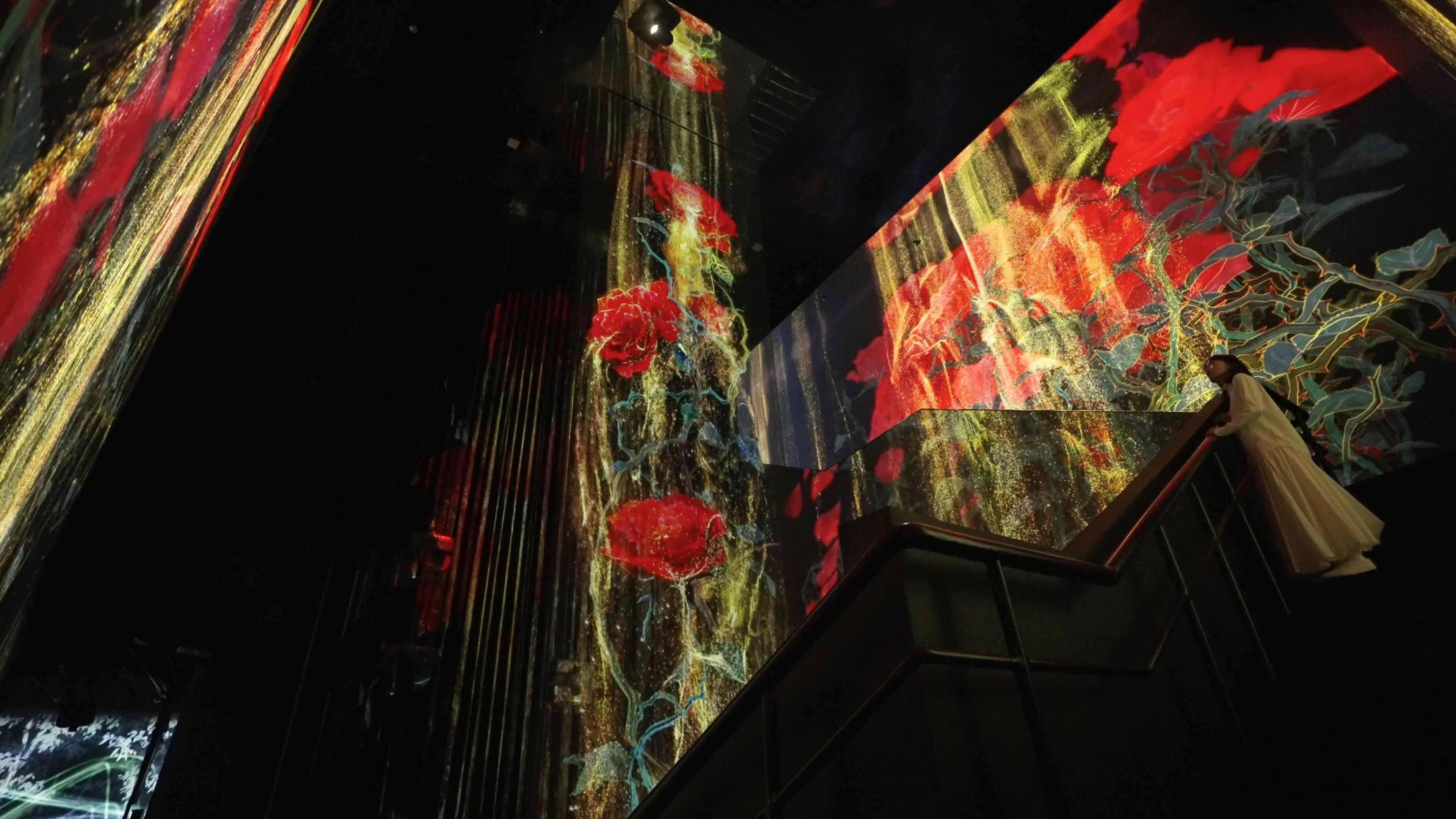 The space of the artwork is created with what teamLab refers to as Ultrasubjective Space. In contrast to spaces that are created through, or in other words cut out by, lenses and perspective, Ultrasubjective Space does not fix the viewer’s viewpoint and in turn frees the body. The wall that the flowers are seen on does not become a boundary between the viewer and the artwork, and the artwork space is continuous with the space of the viewer’s body.