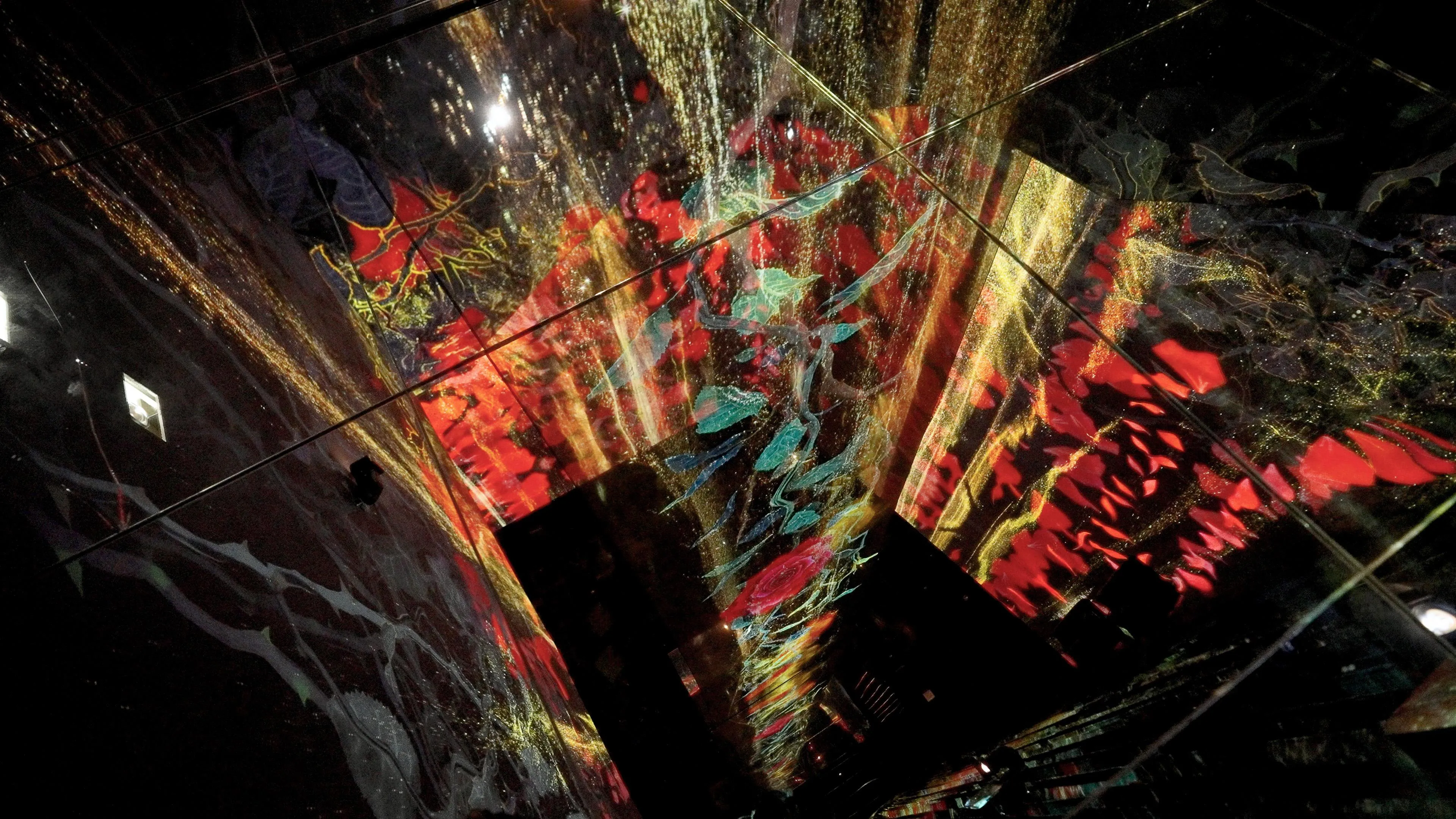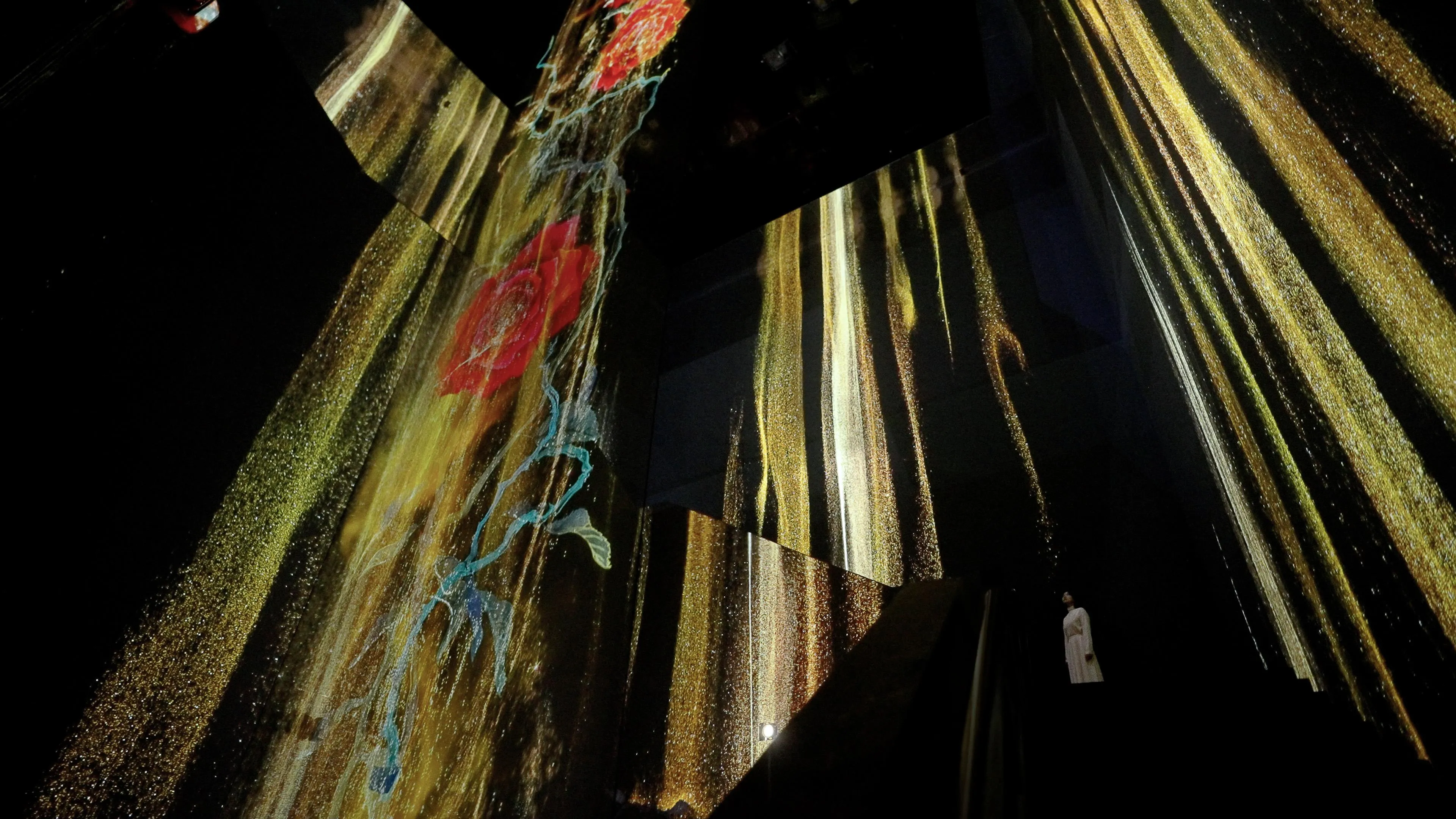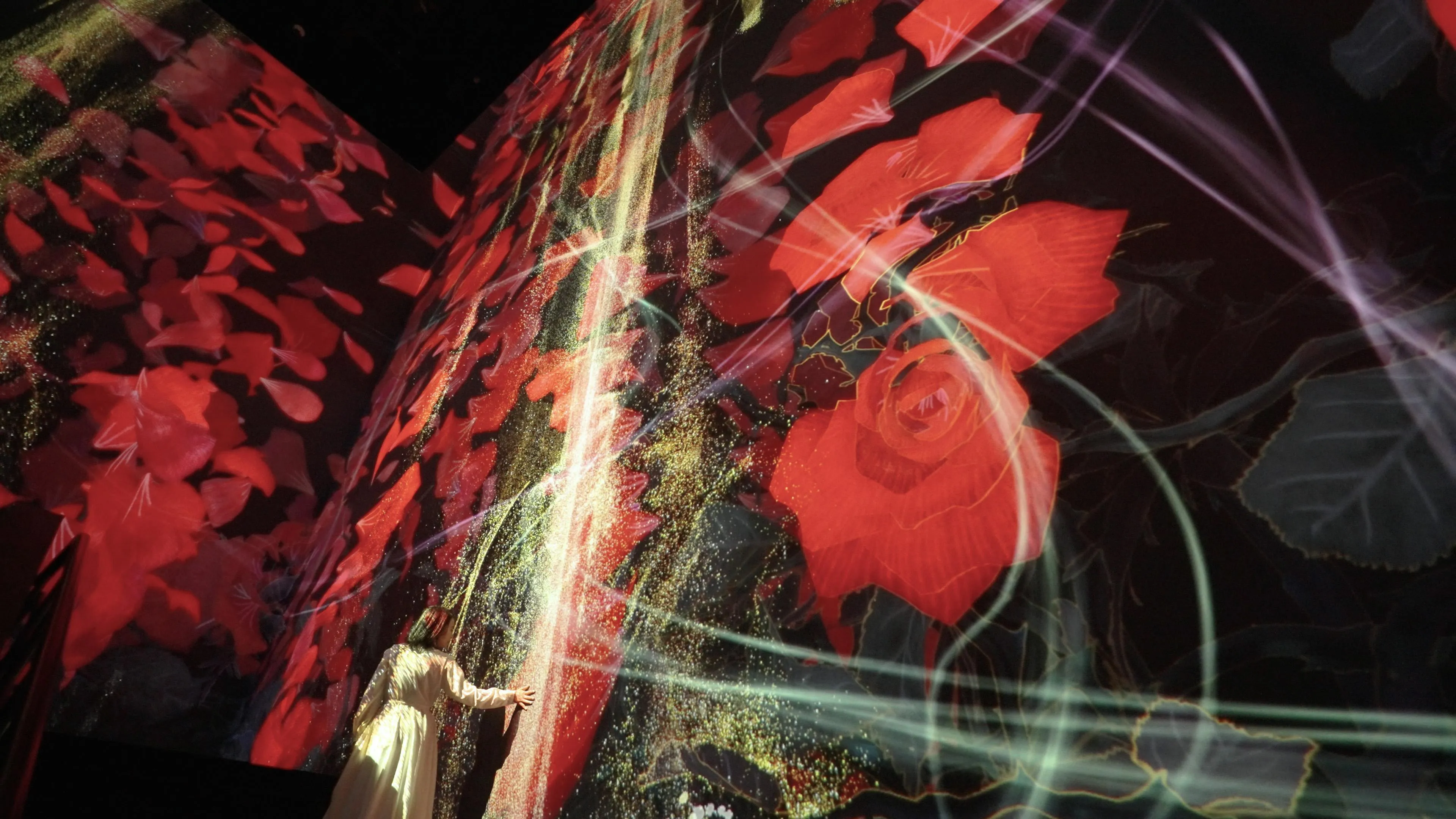 The space of the artwork is created with what teamLab refers to as Ultrasubjective Space. In contrast to spaces that are created through, or in other words cut out by, lenses and perspective, Ultrasubjective Space does not fix the viewer’s viewpoint and in turn frees the body. The wall that the flowers are seen on does not become a boundary between the viewer and the artwork, and the artwork space is continuous with the space of the viewer’s body.