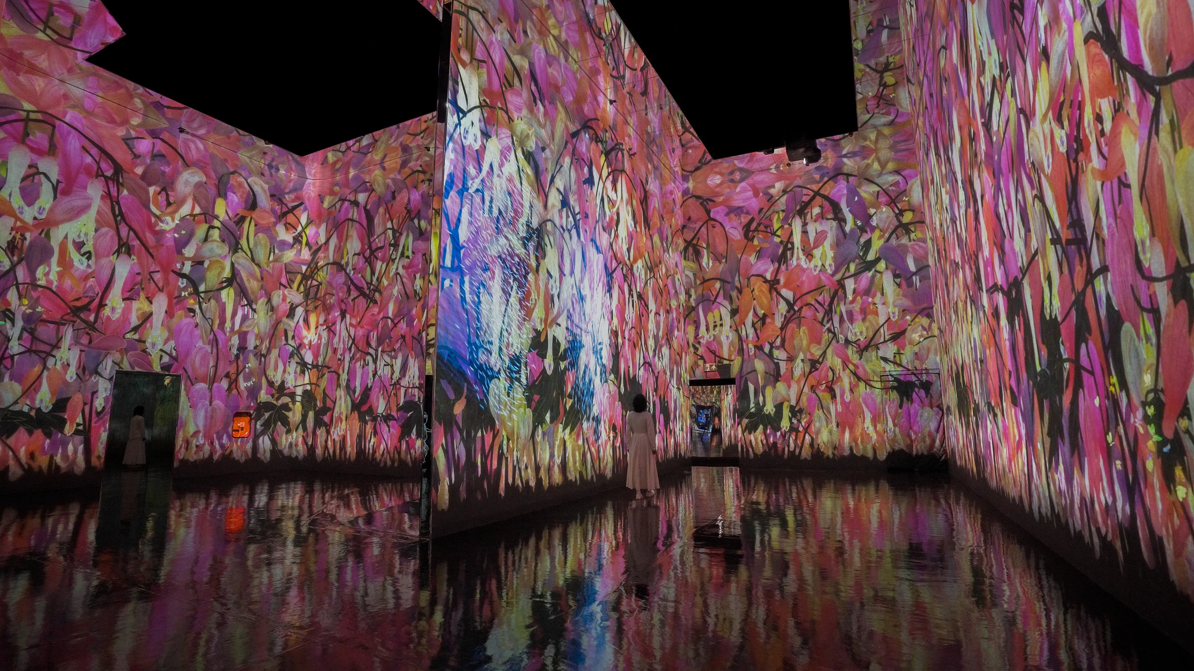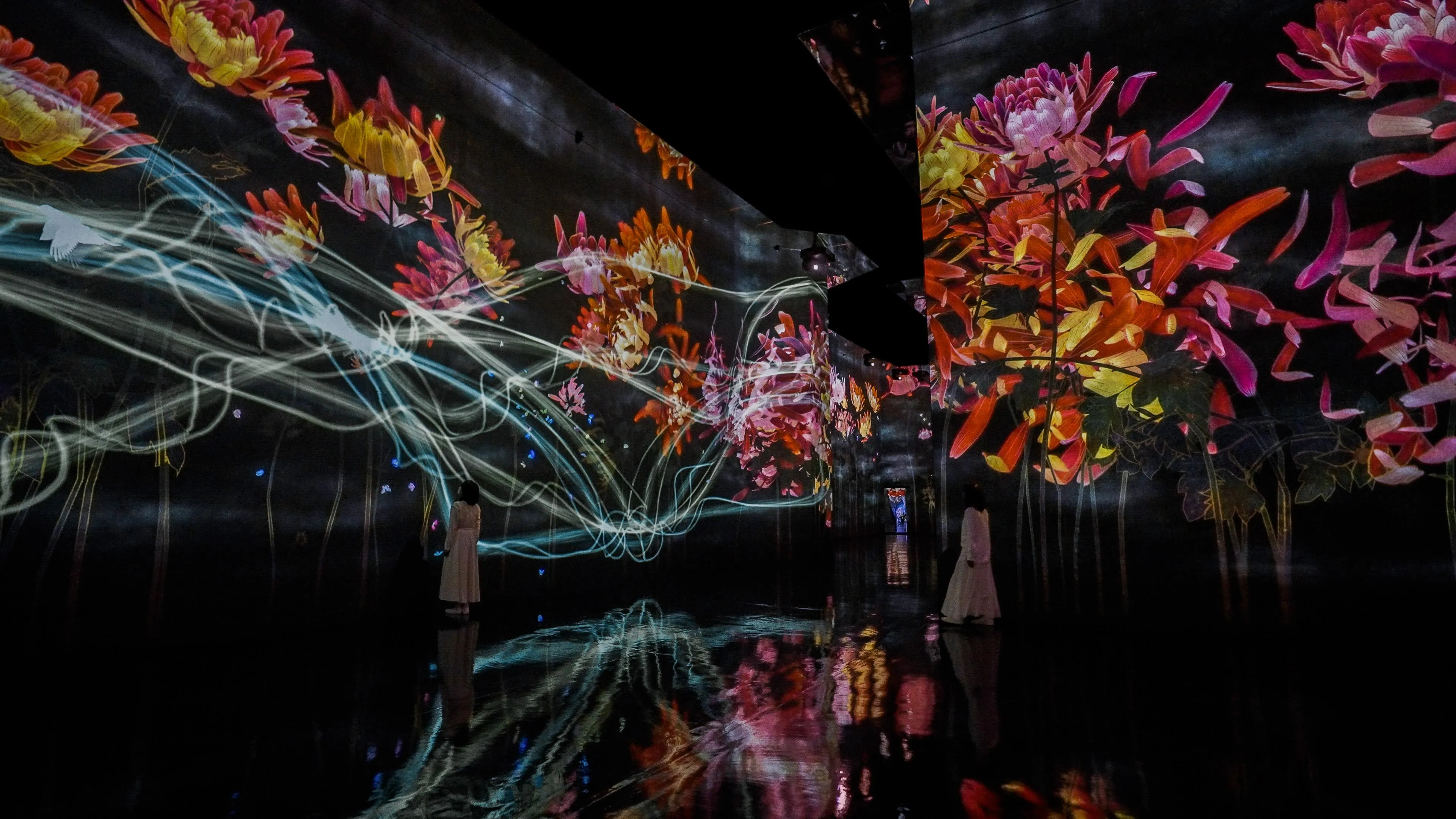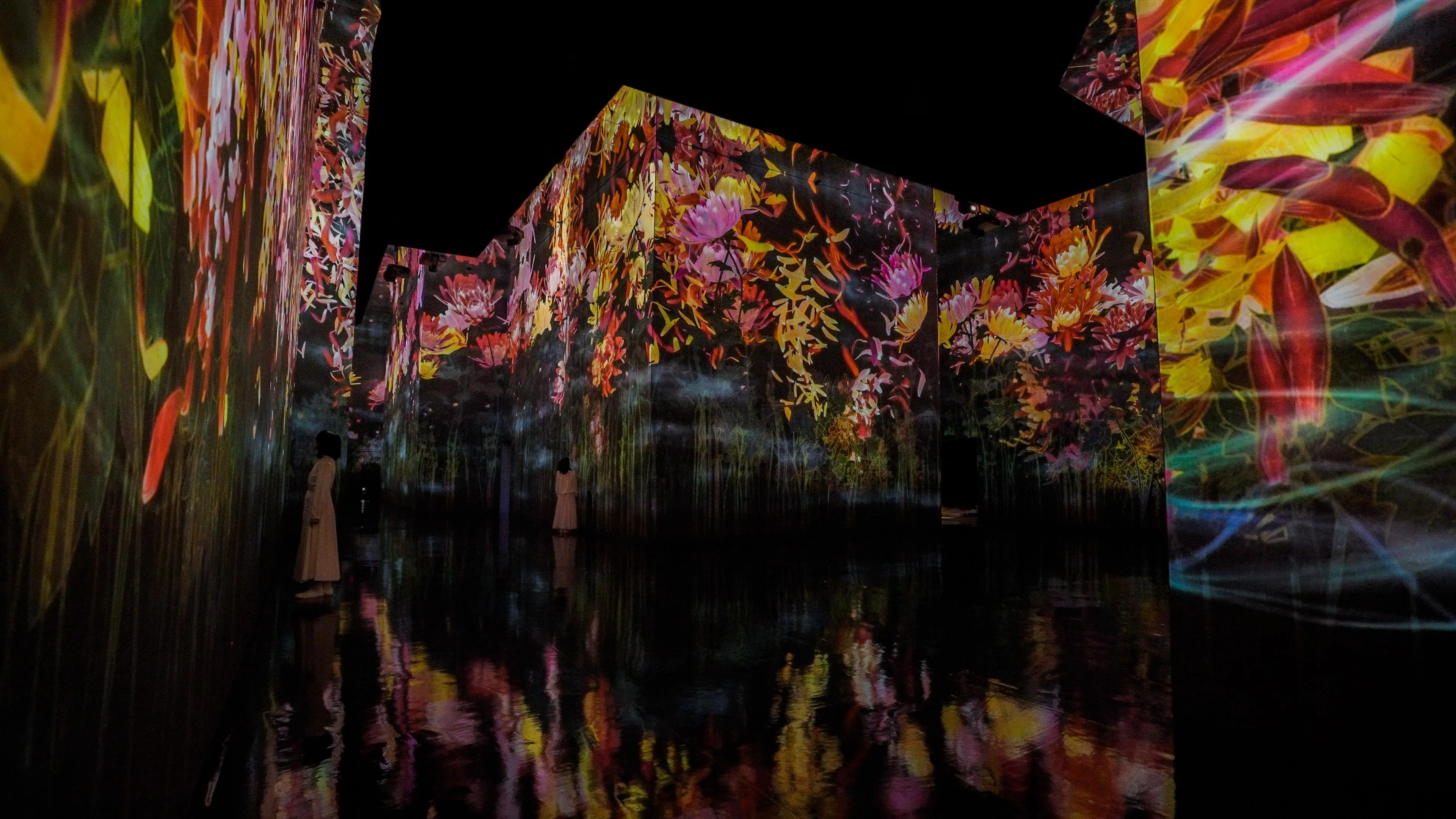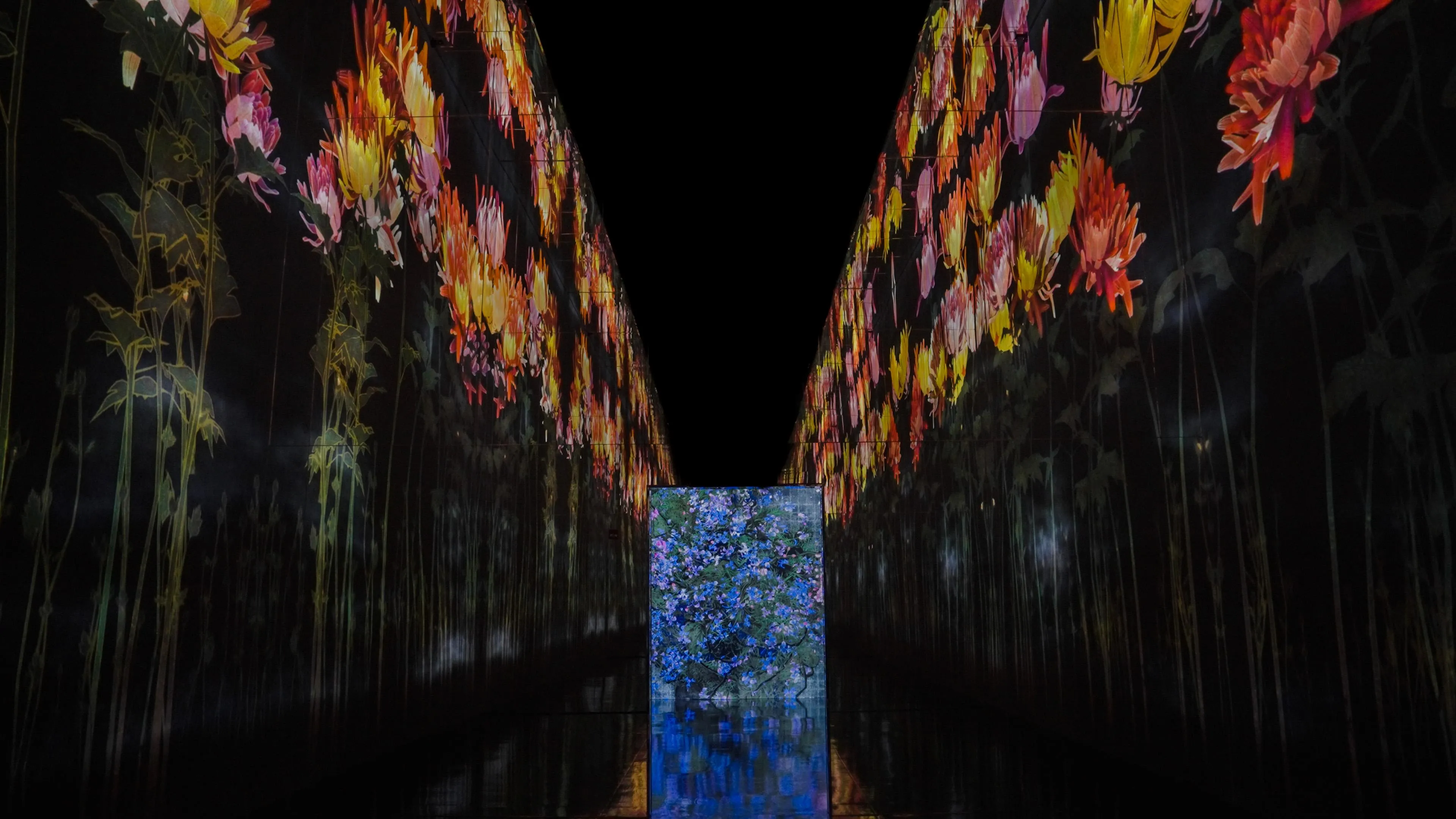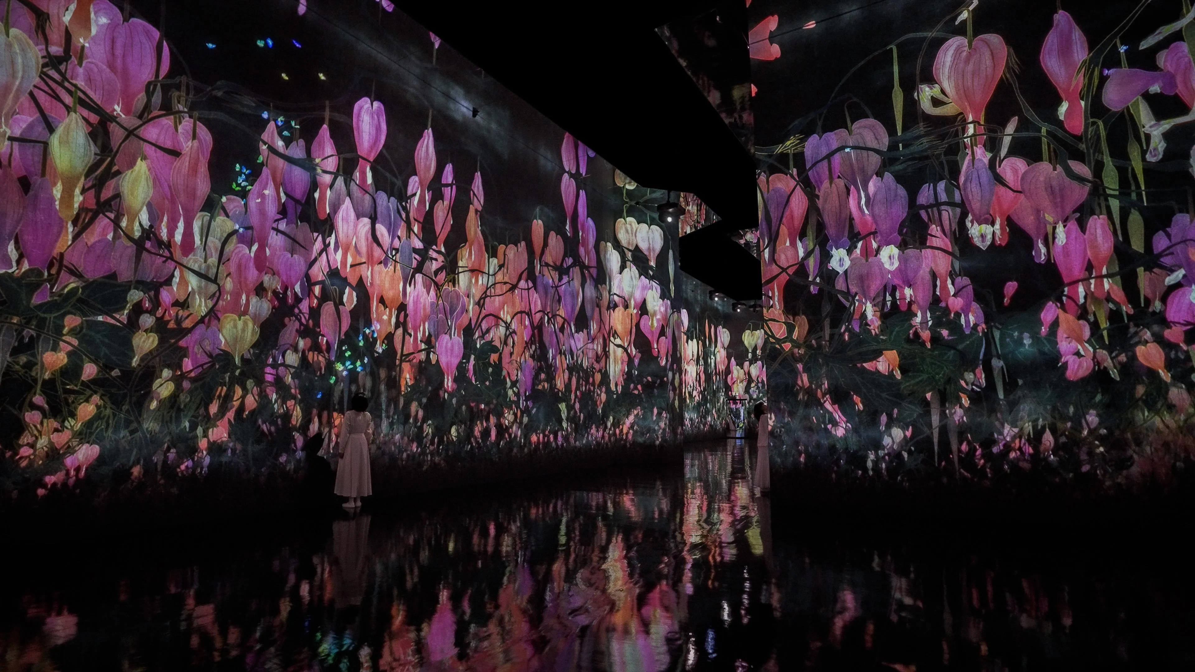The world of the artwork is flattened through teamLab's concept of Ultrasubjective Space. Unlike when flattening by lenses or perspective, the viewer's viewpoint is not fixed, and the viewer's body is free to move. The wall on which the world of the work is depicted does not become a boundary between the people and the work; the flowers blur the boundary between the walls, and the world of the work is continuous with the space where the people's bodies are located.