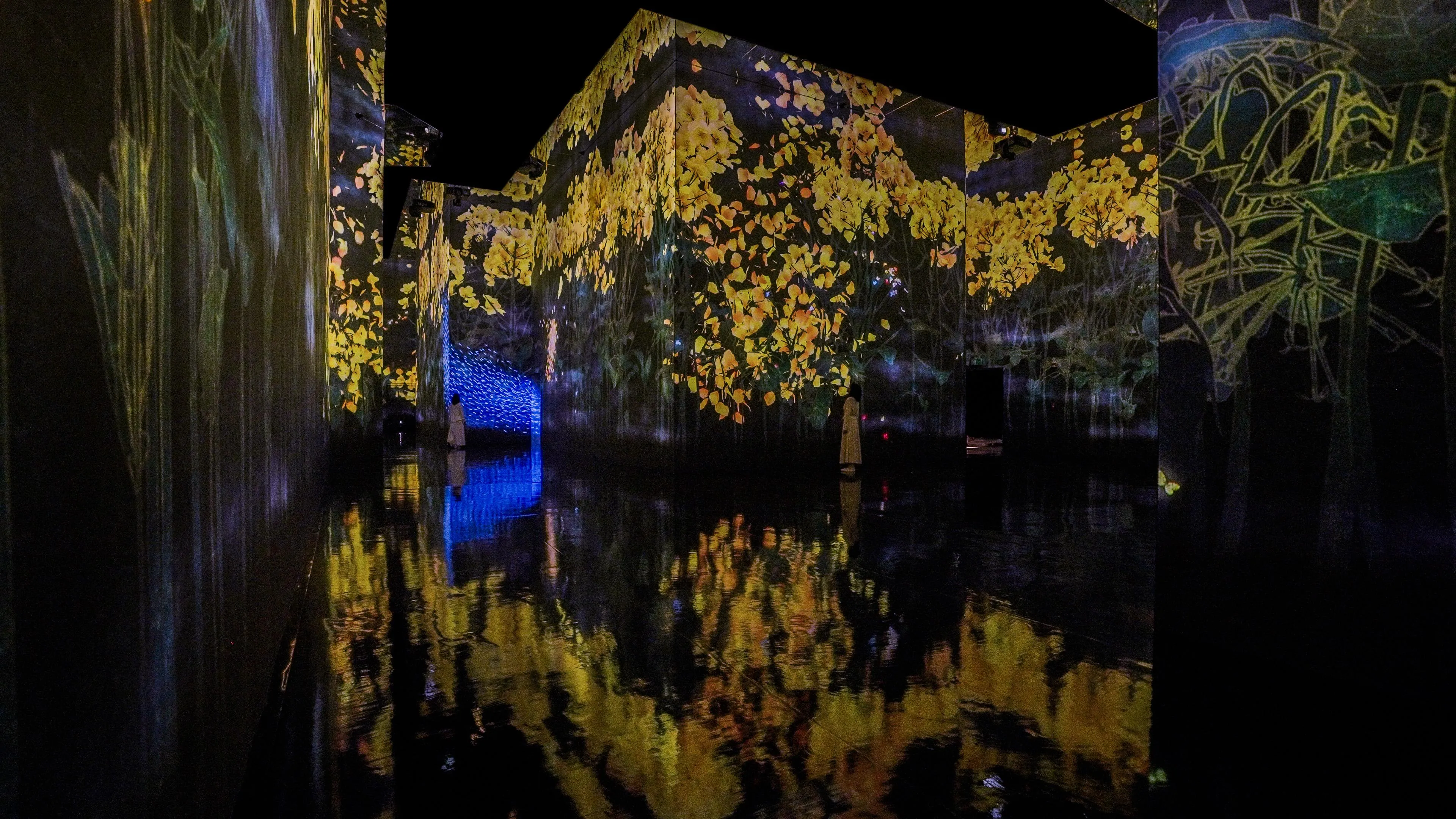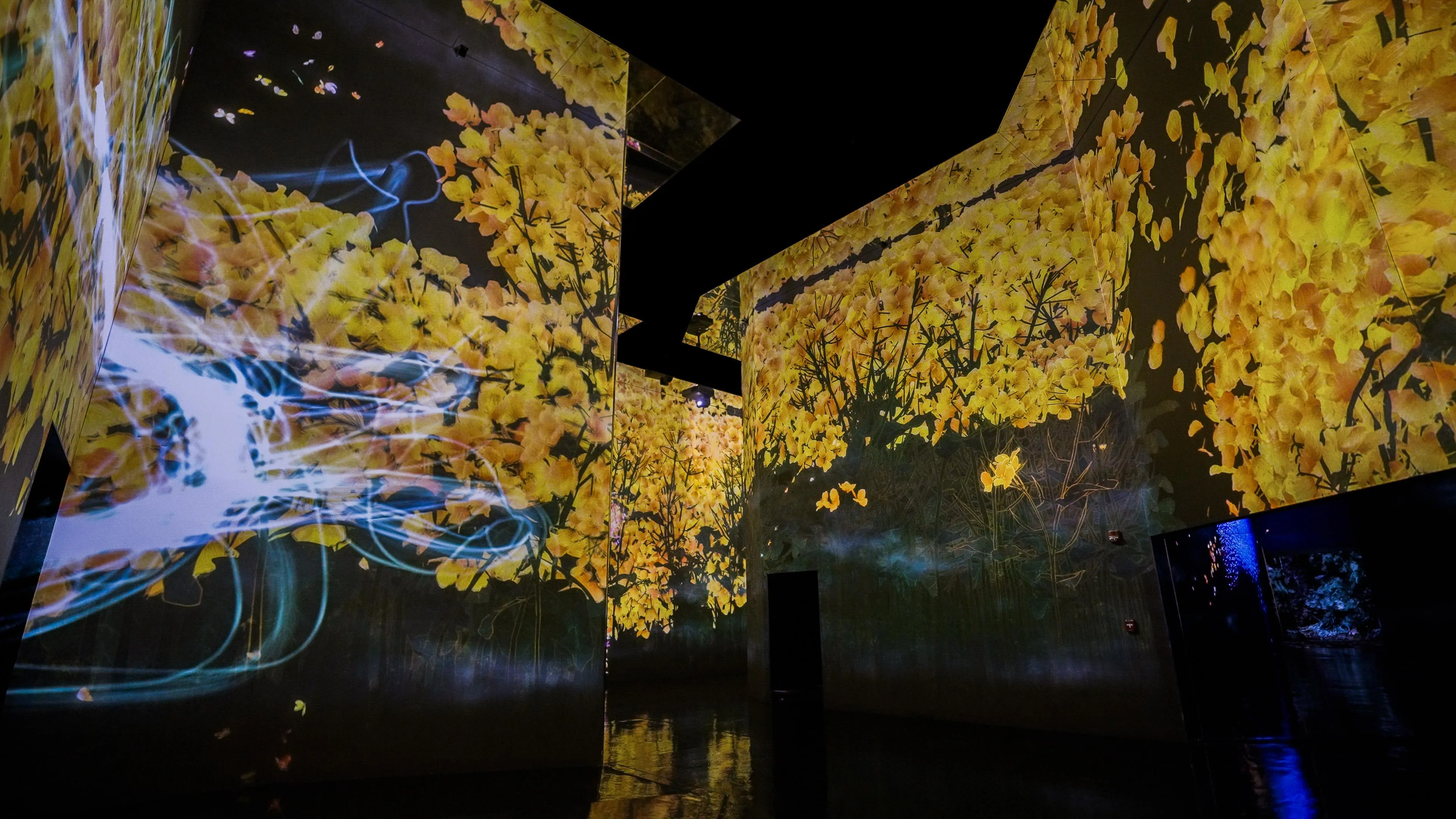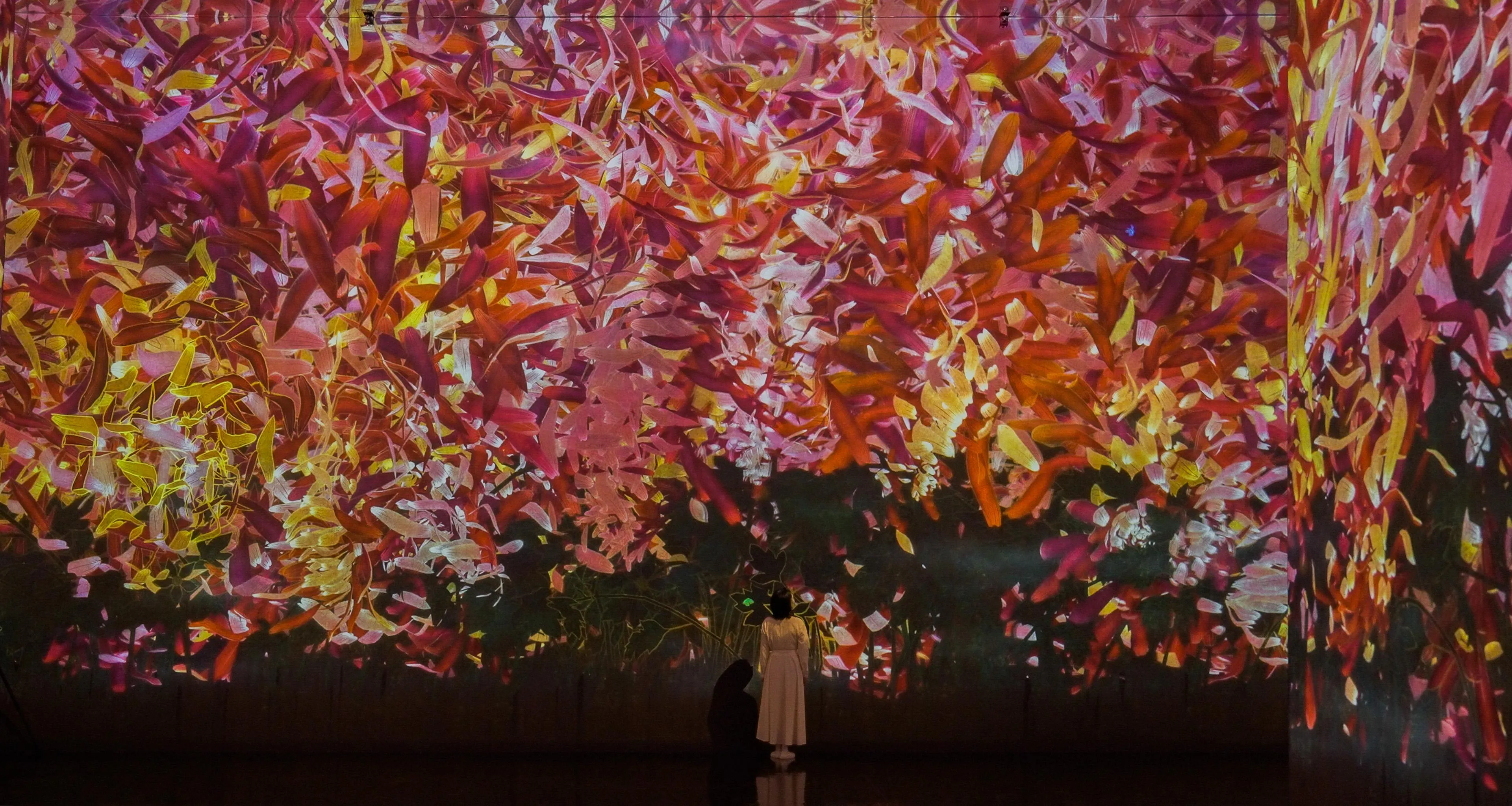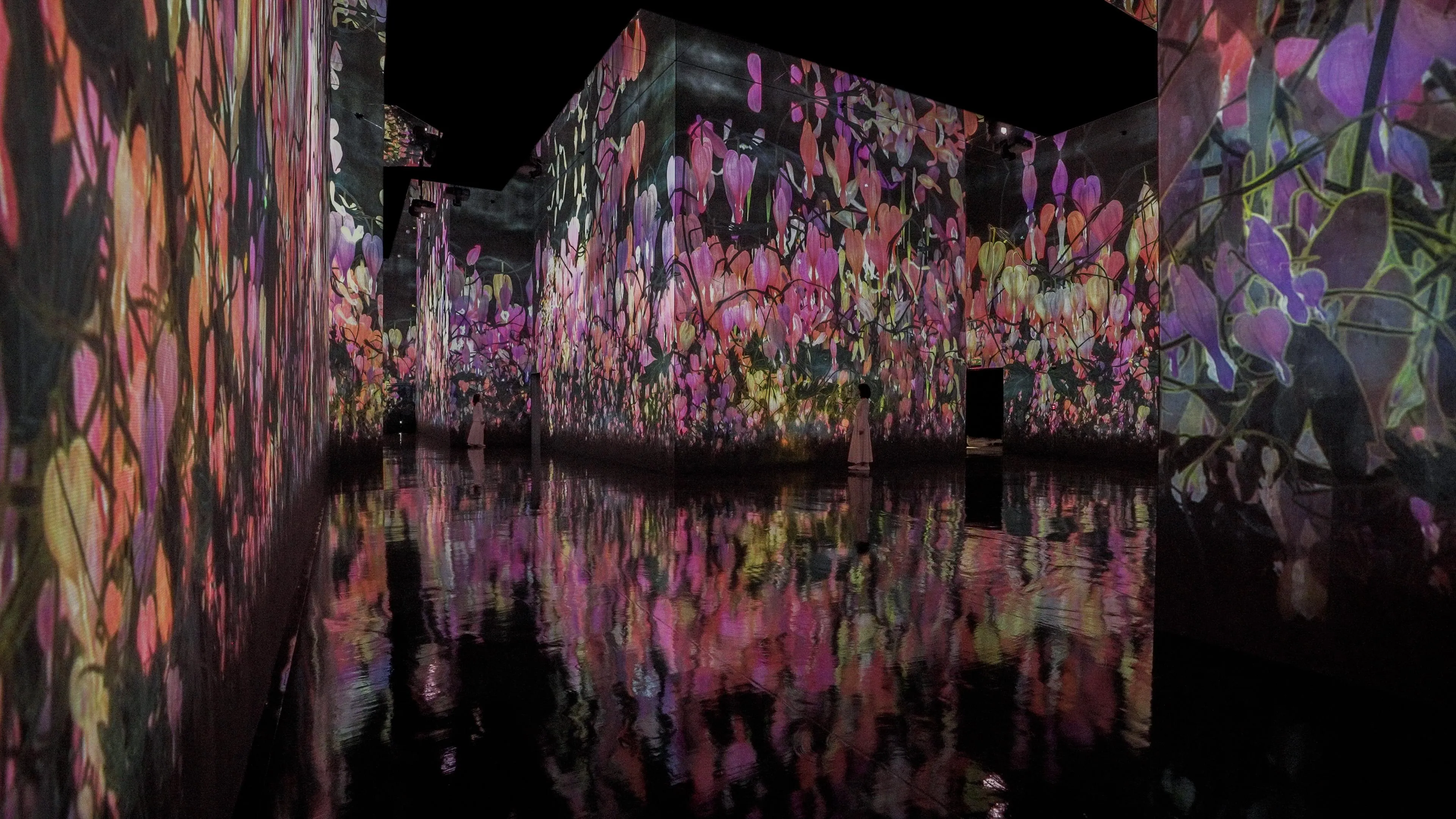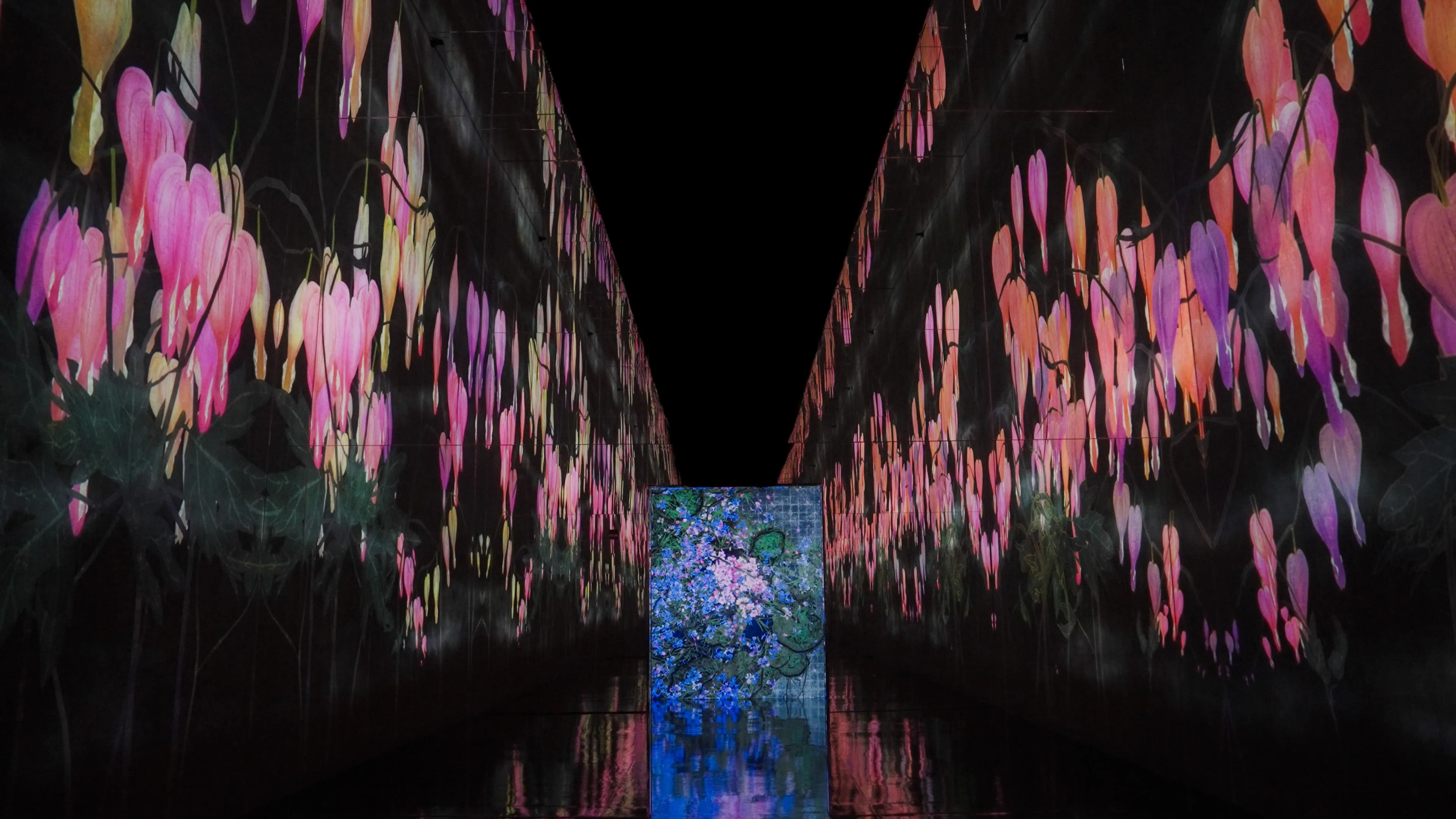 The world of the artwork is flattened through teamLab's concept of Ultrasubjective Space. Unlike when flattening by lenses or perspective, the viewer's viewpoint is not fixed, and the viewer's body is free to move. The wall on which the world of the work is depicted does not become a boundary between the people and the work; the flowers blur the boundary between the walls, and the world of the work is continuous with the space where the people's bodies are located.