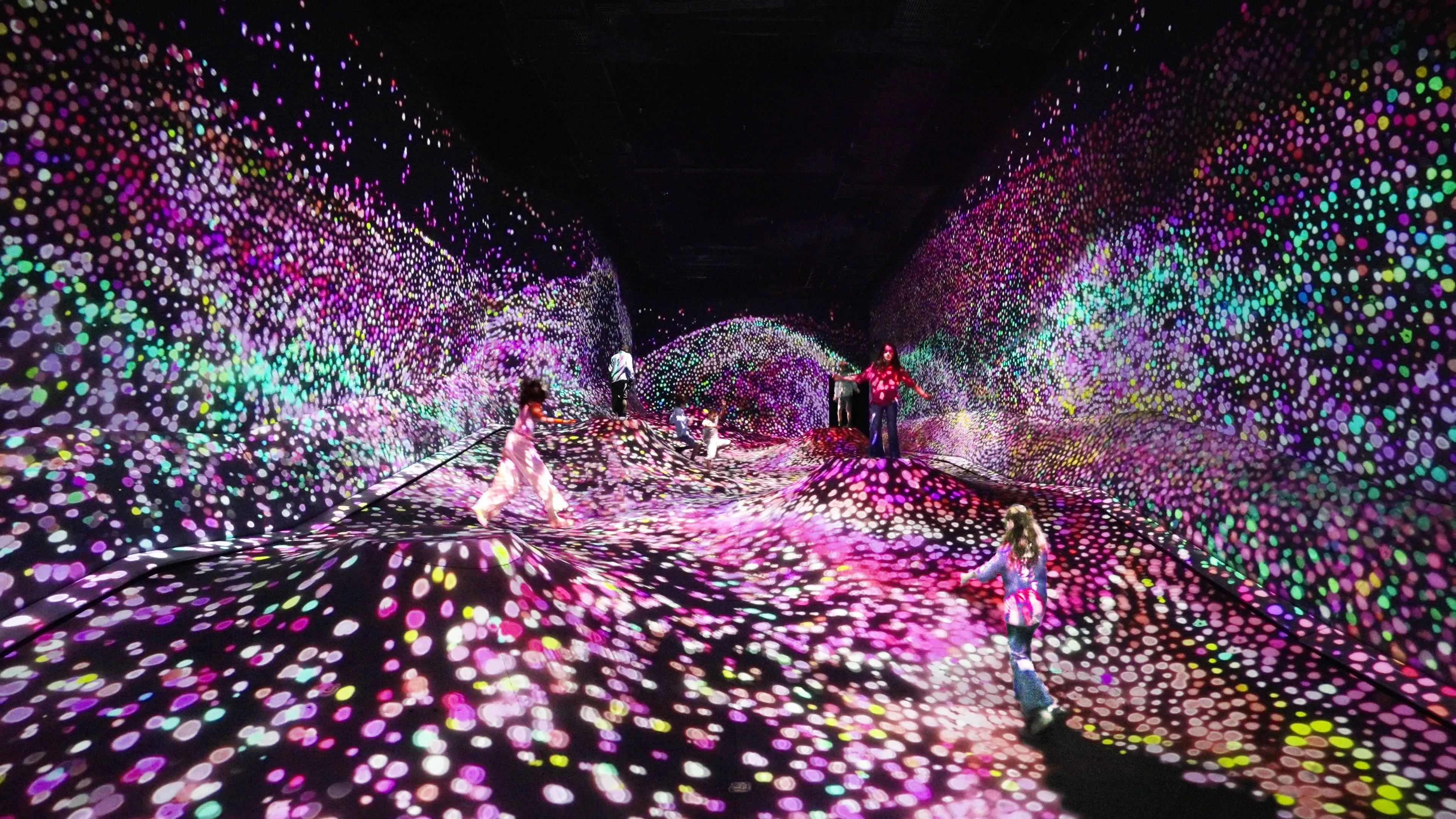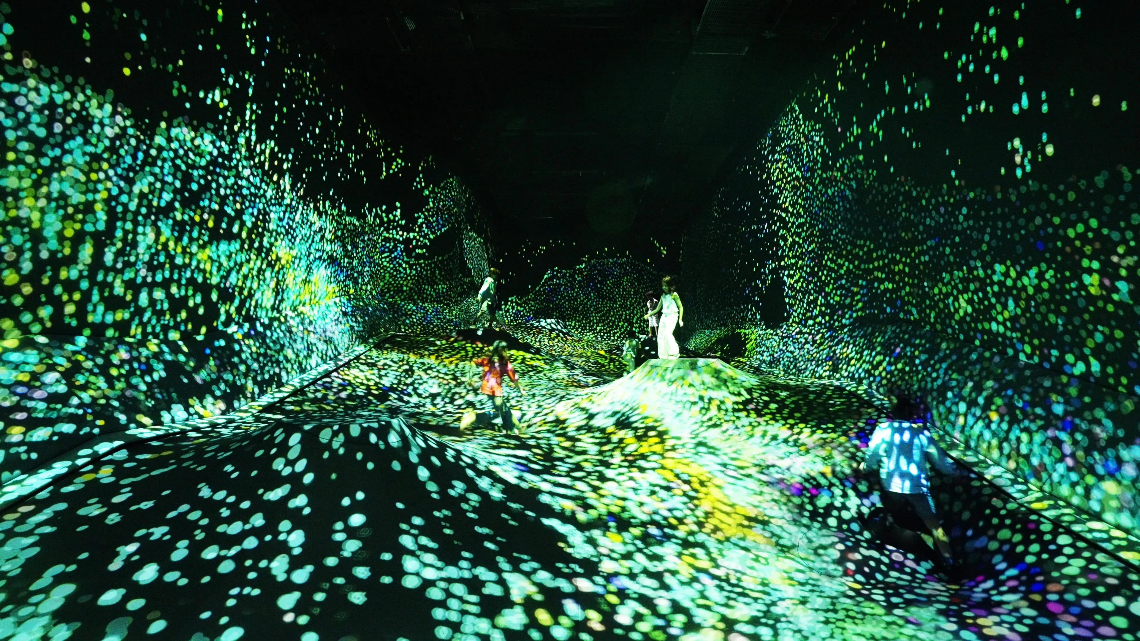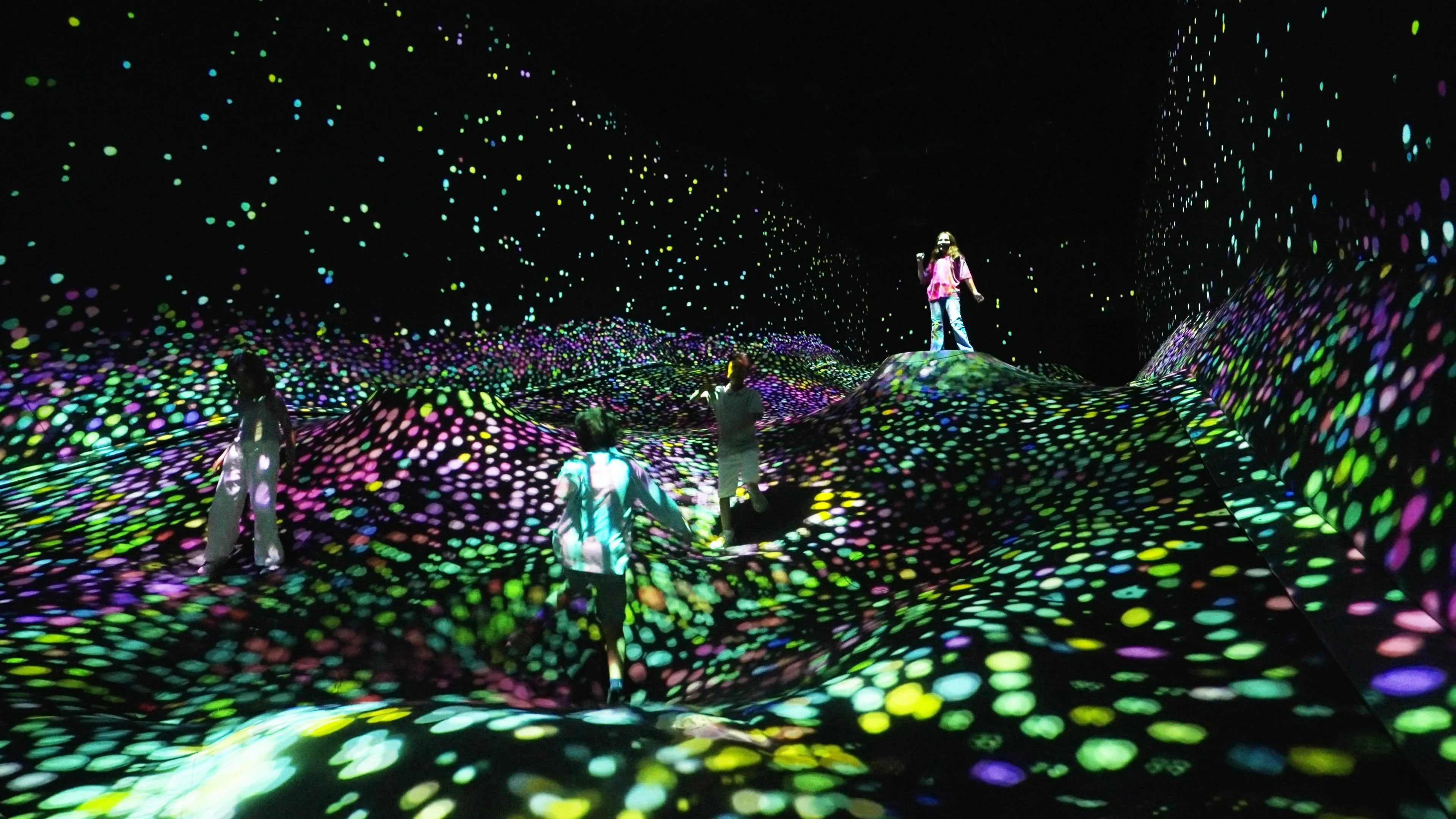 The ground sinks beneath people, and granules of light gather in these sunken areas. As people walk, the granules burst out and intermix, changing the stratum pattern.