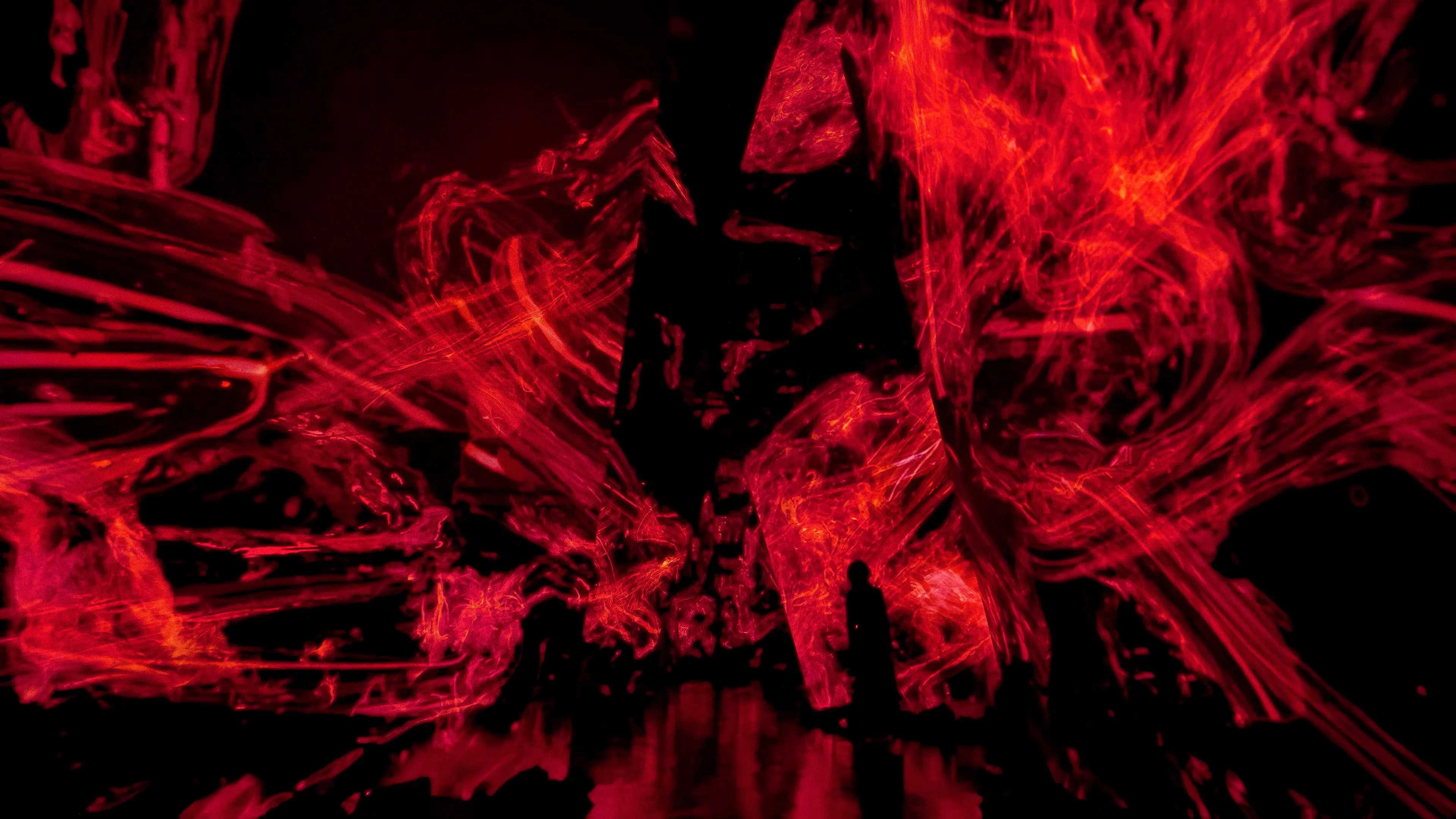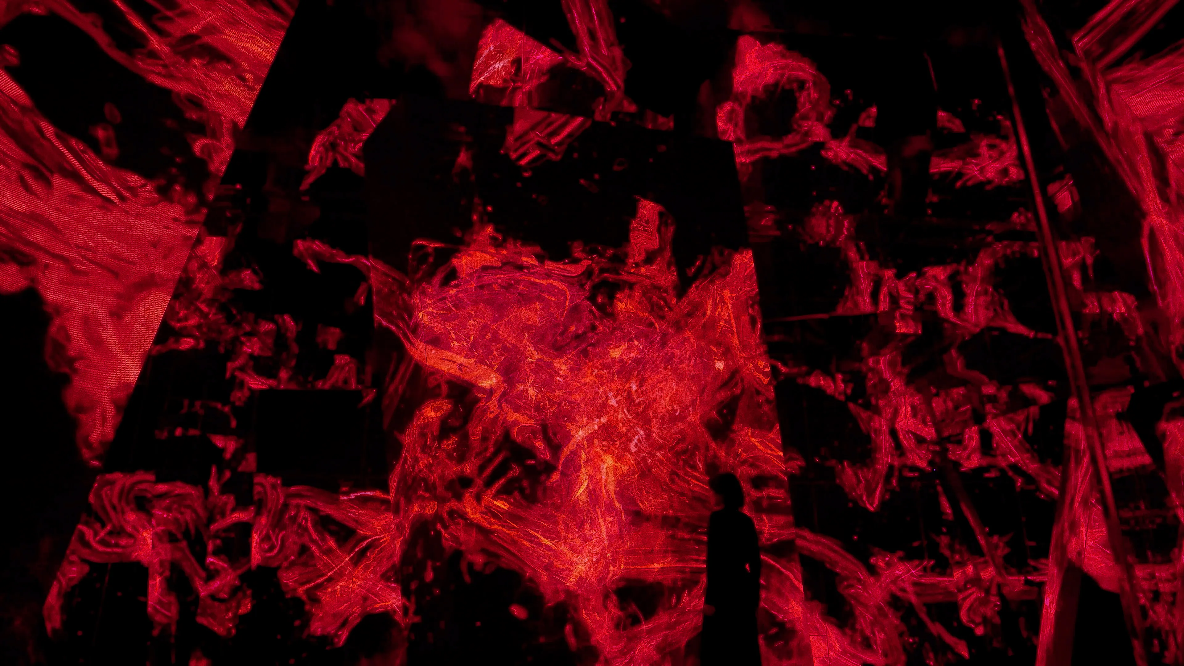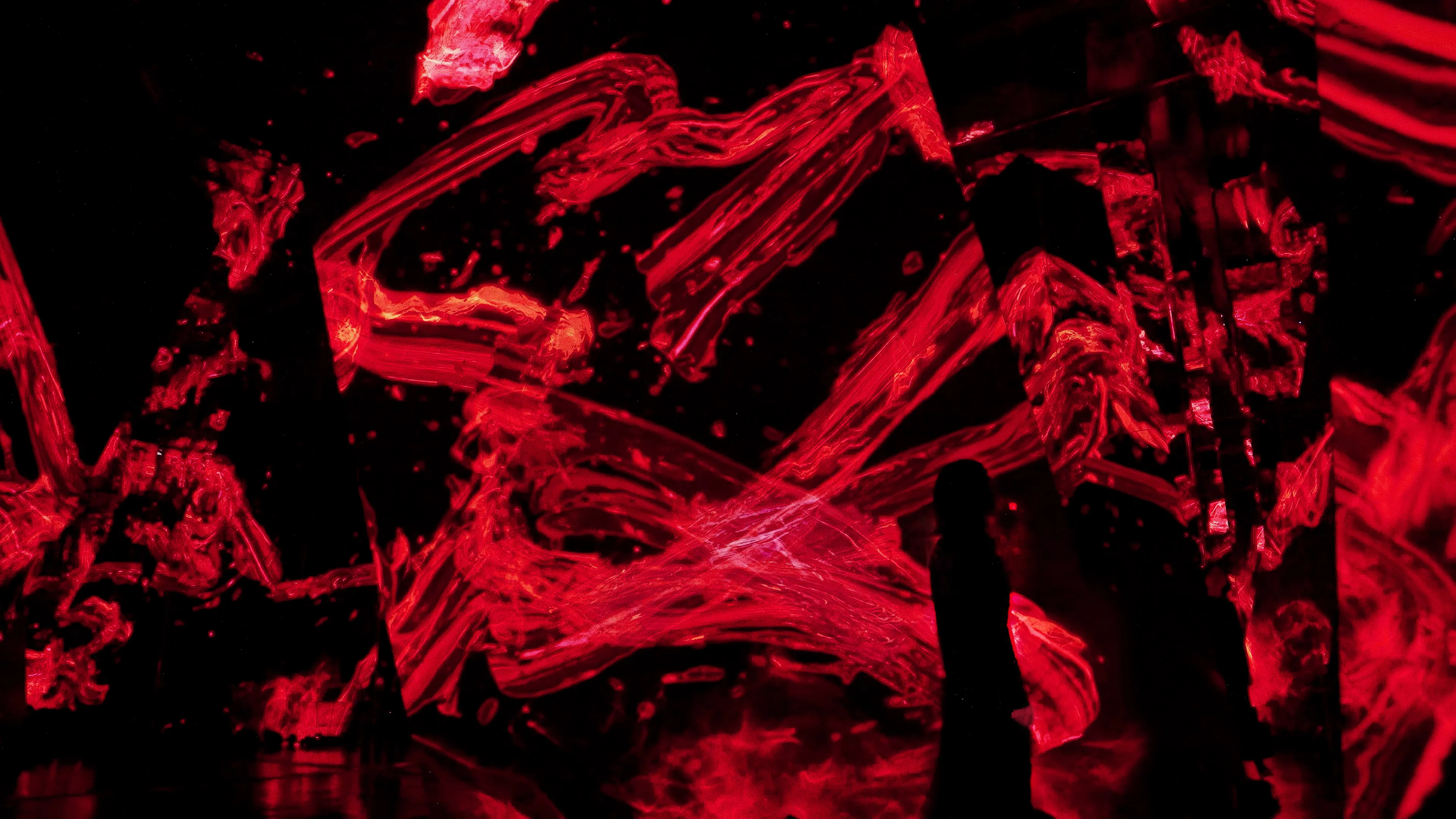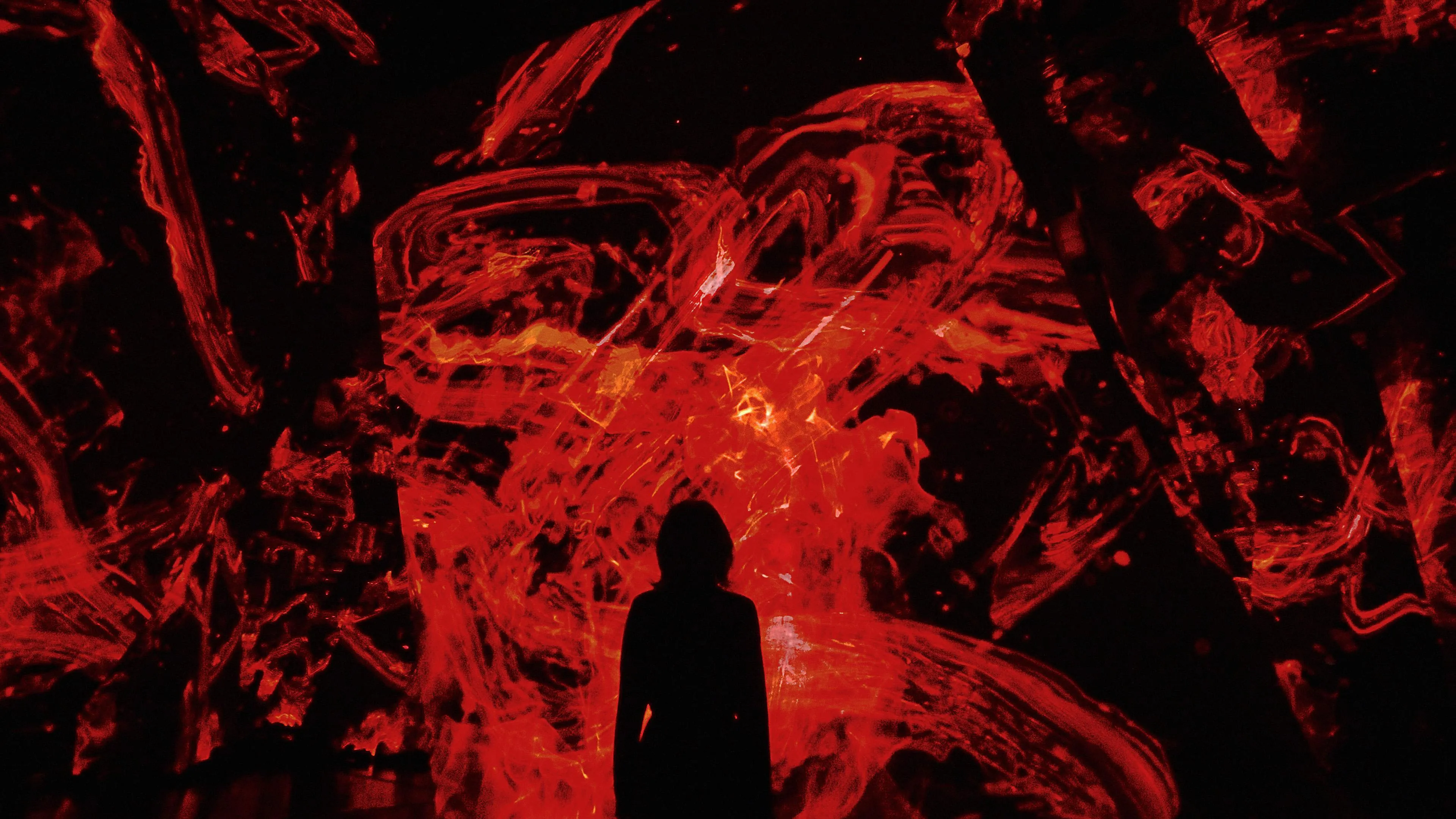 Spatial Calligraphy is a form of calligraphy drawn in space that teamLab has been exploring since it was founded. The artwork reconstructs calligraphy in three-dimensional space to express the depth, speed, and power of the brush stroke, and that calligraphy is then flattened using the logical structure of space that teamLab calls Ultrasubjective Space. The calligraphy shifts between two and three dimensions.