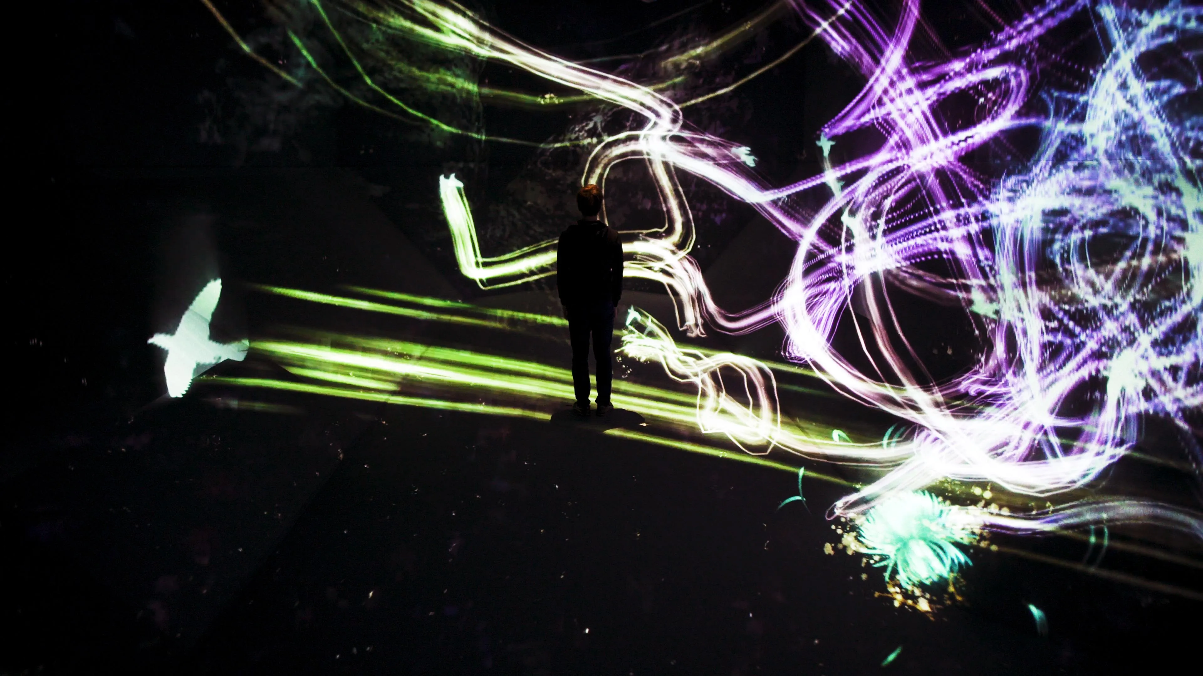 Flocks of mythical crows (Yatagarasu) rendered in light fly around the space leaving trails in their wake and forming Spatial Calligraphy. The chasing crows are eventually chased themselves, and form flowers when they crash into each other, scattering their petals. Although the crows usually avoid crashing into people in the space, when they happen to do so, they similarly form flowers, scattering their petals.