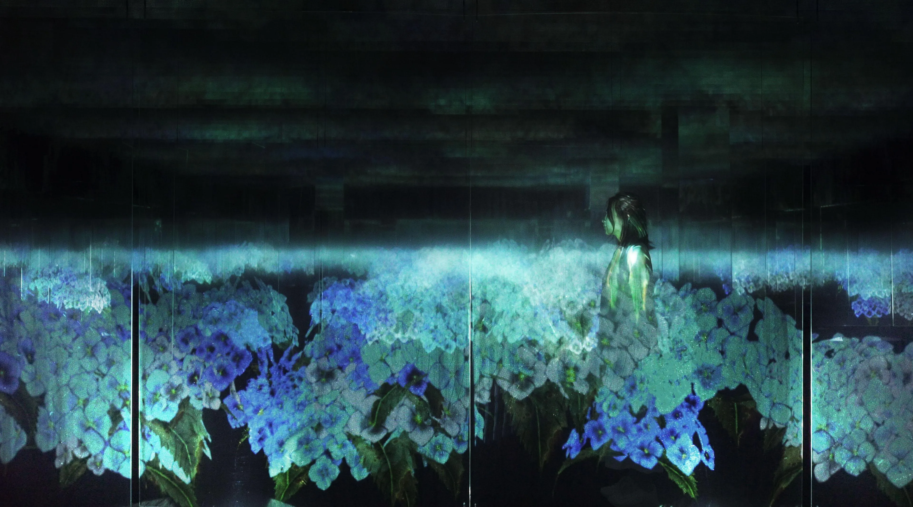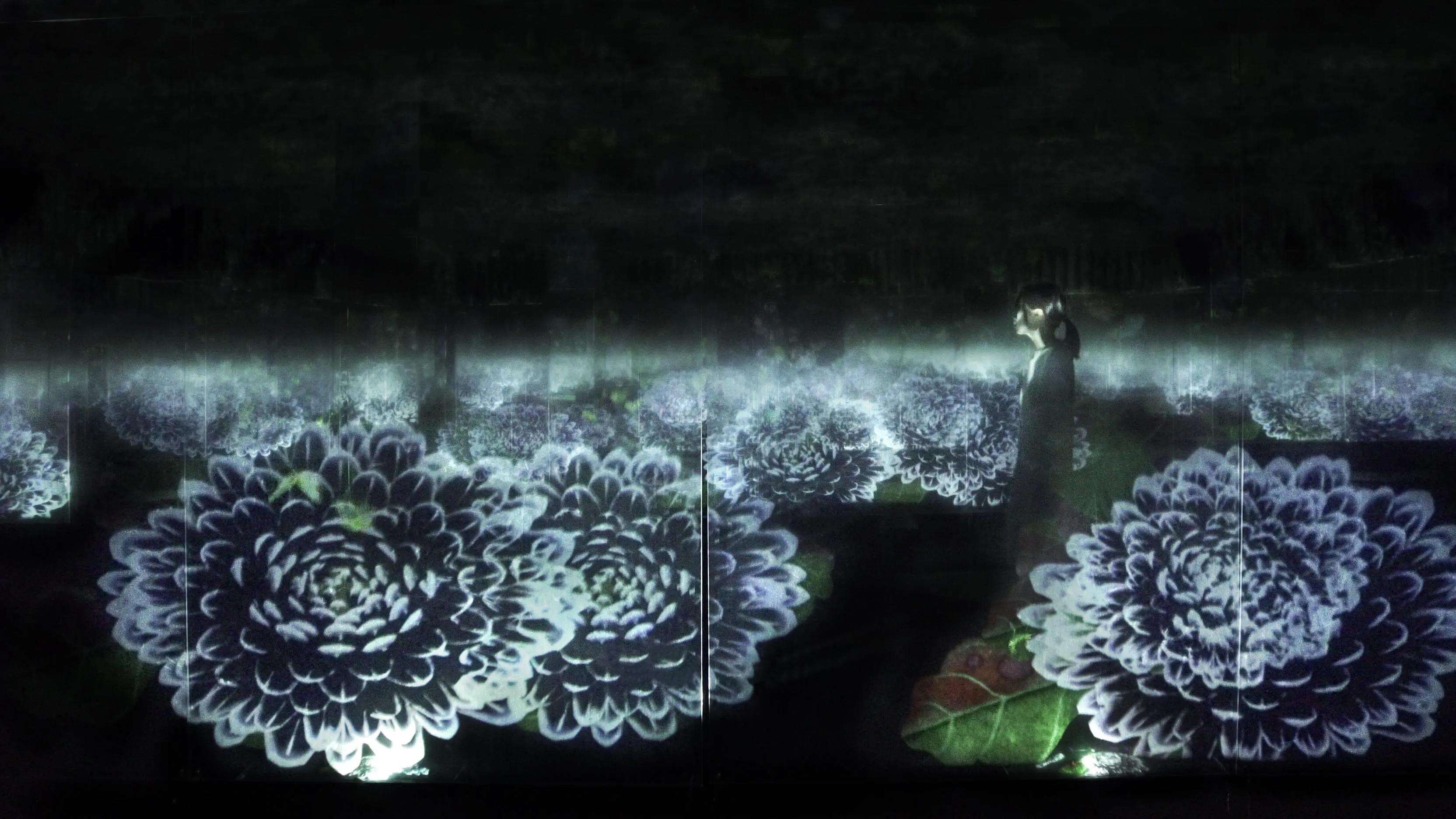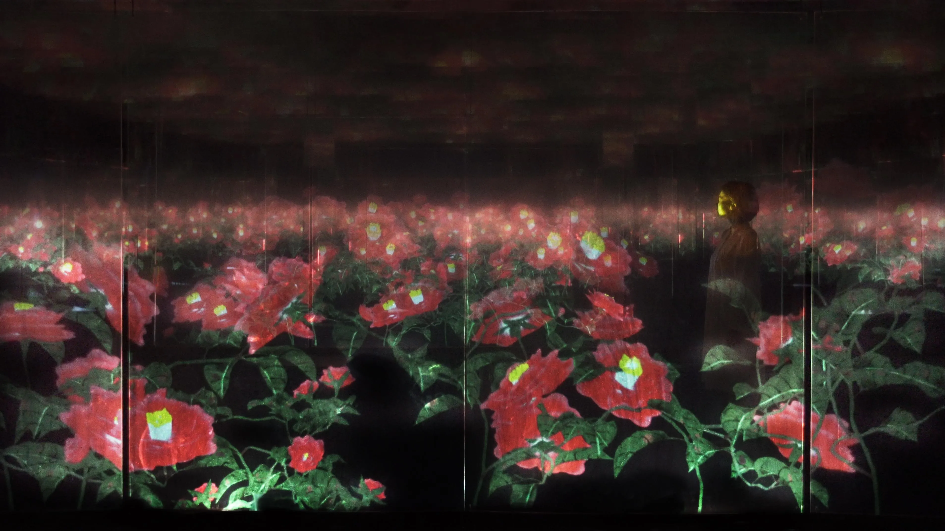 When a person is seen across the screens, layered with the flowers, the person appears as though they themself exist in the artwork world of the flowers. In other words, a person seen across the screens will become one not only with the exhibition space, but with the artwork world as well.