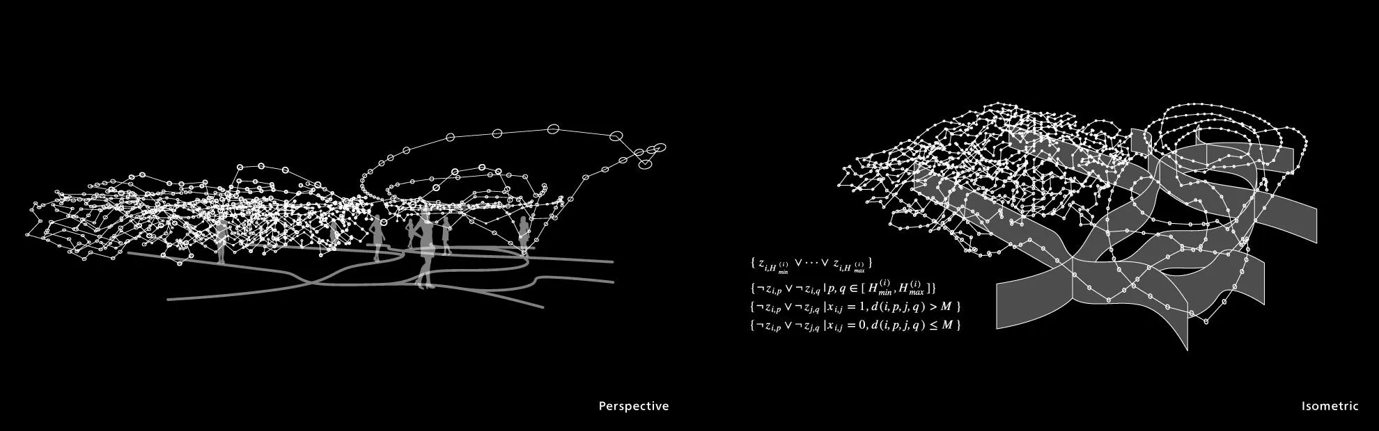 The seemingly random arrangement of lamps in the space is mathematically derived such that, starting from any lamp, a line continuously drawn to the nearest lamp results in a single, connected path of light that passes through every lamp exactly once, like a unicursal stroke.