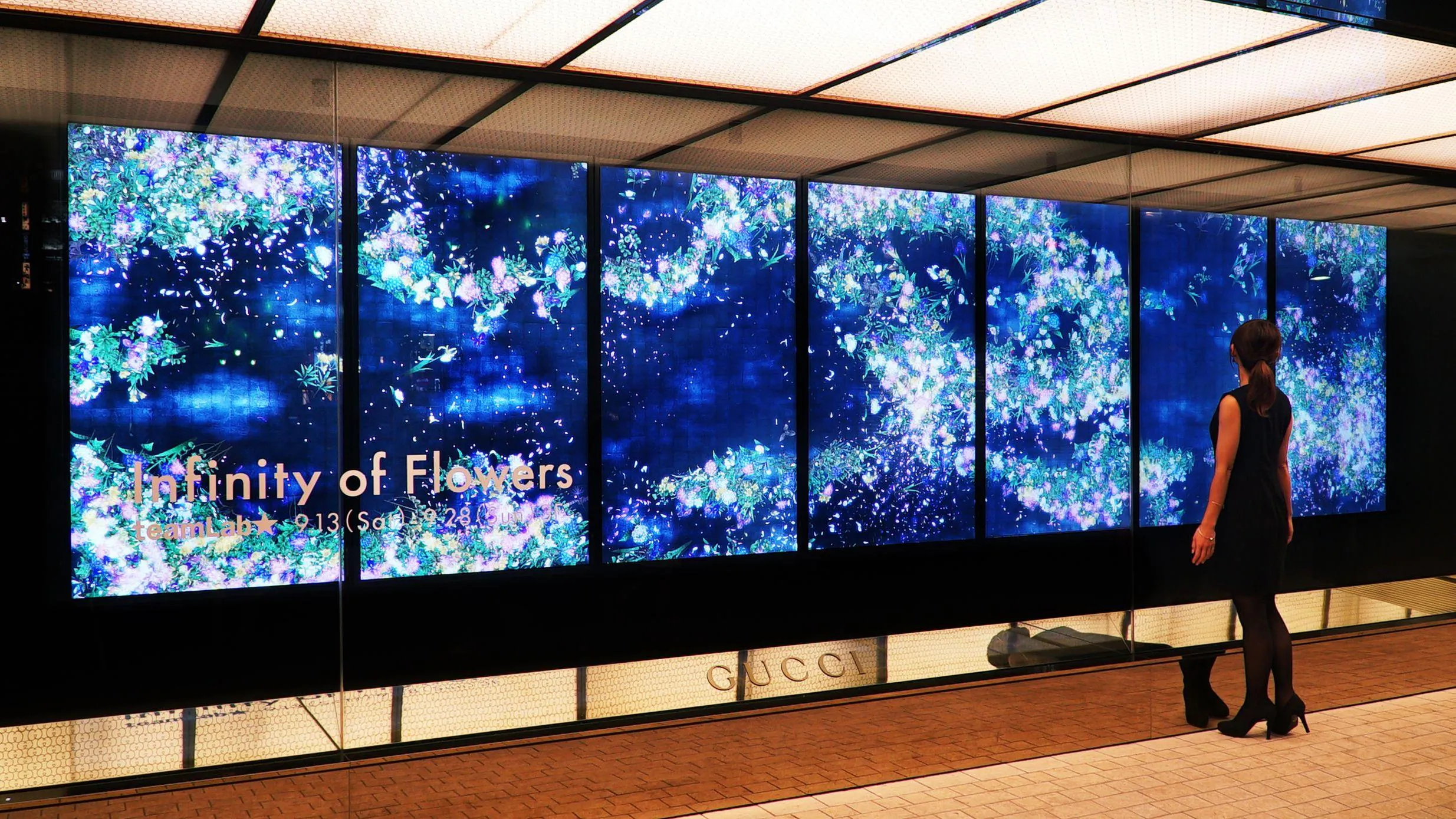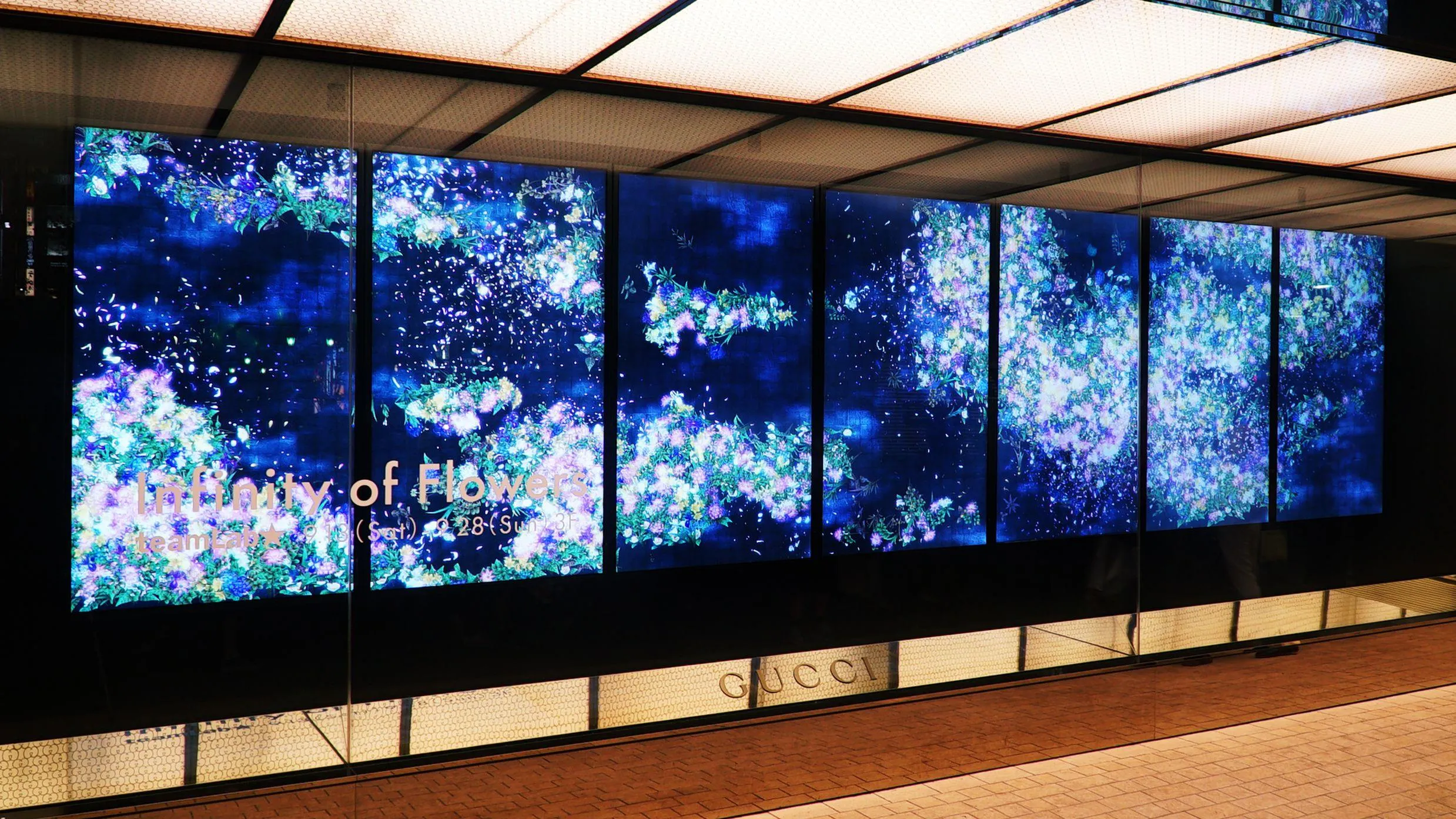Ultra-technologists group teamLab led by Toshiyuki Inoko presents an installation titled “Infinity of Flowers” using Gucci’s symbolic Flora motif. The piece is currently on display on the third floor of Gucci Shinjuku store. (Excerpt from text)