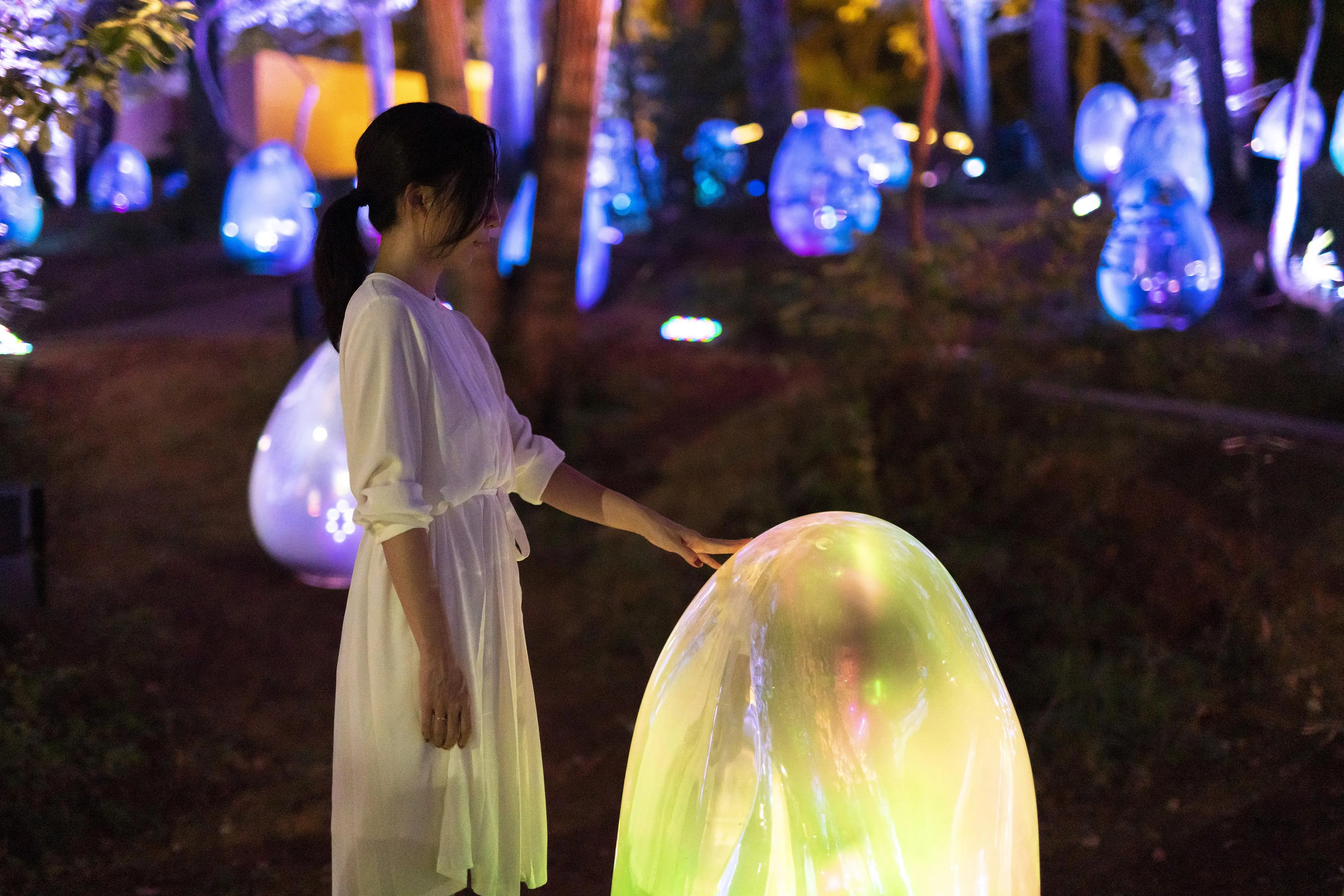 As the sun sets, the ovoids shine by themselves. When an ovoid is pushed by a person or blown by the wind it falls down and then rises, a sound resonates out, and it emits a light color specific to the sound. The ovoids around it also respond one after another, making the same tone sound, and emitting the same light color that continues to resonate out. And the surrounding Resonating Trees also respond and change continuously.