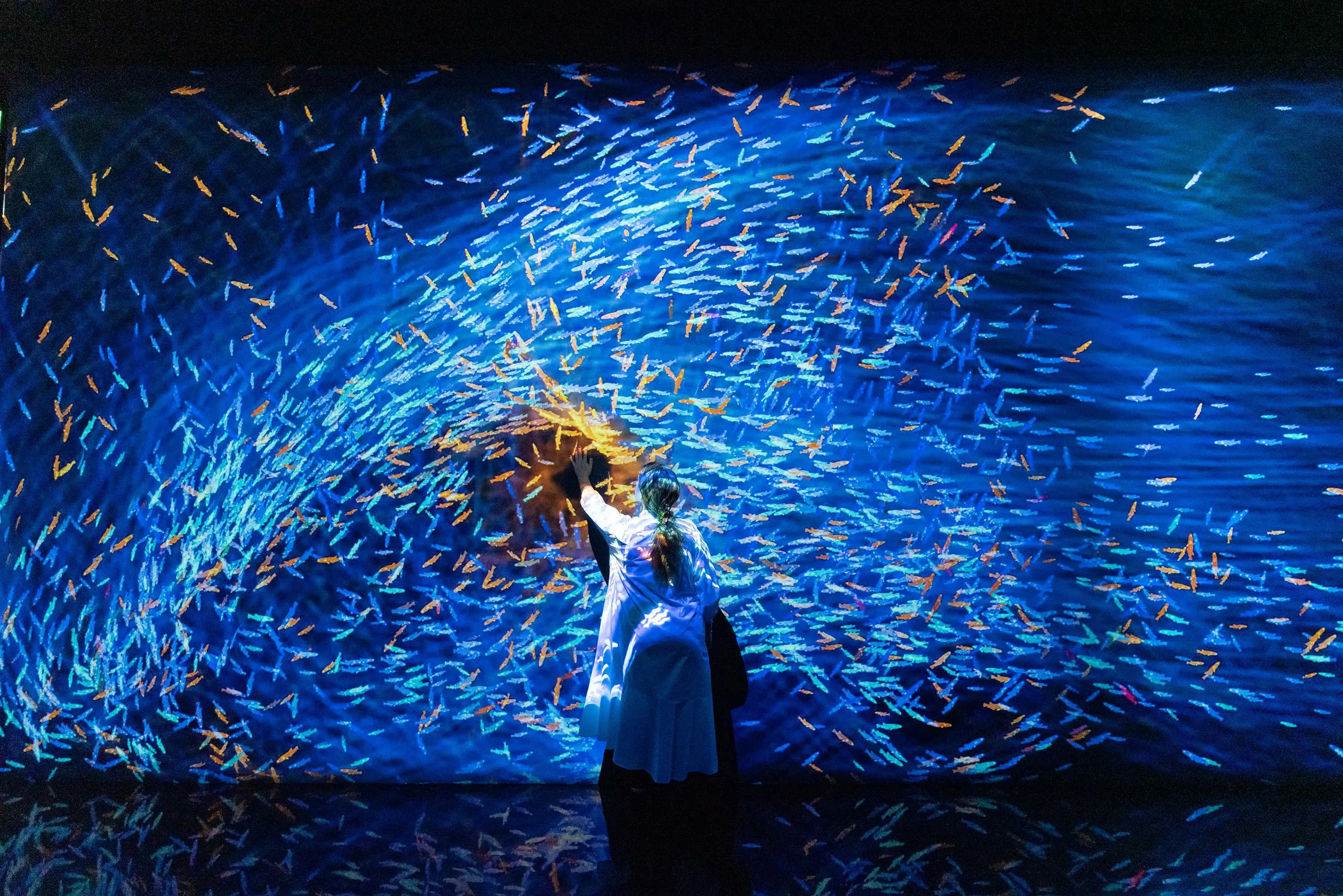 When people touch a shoal of fish, the fish are dyed a color unique to that person.