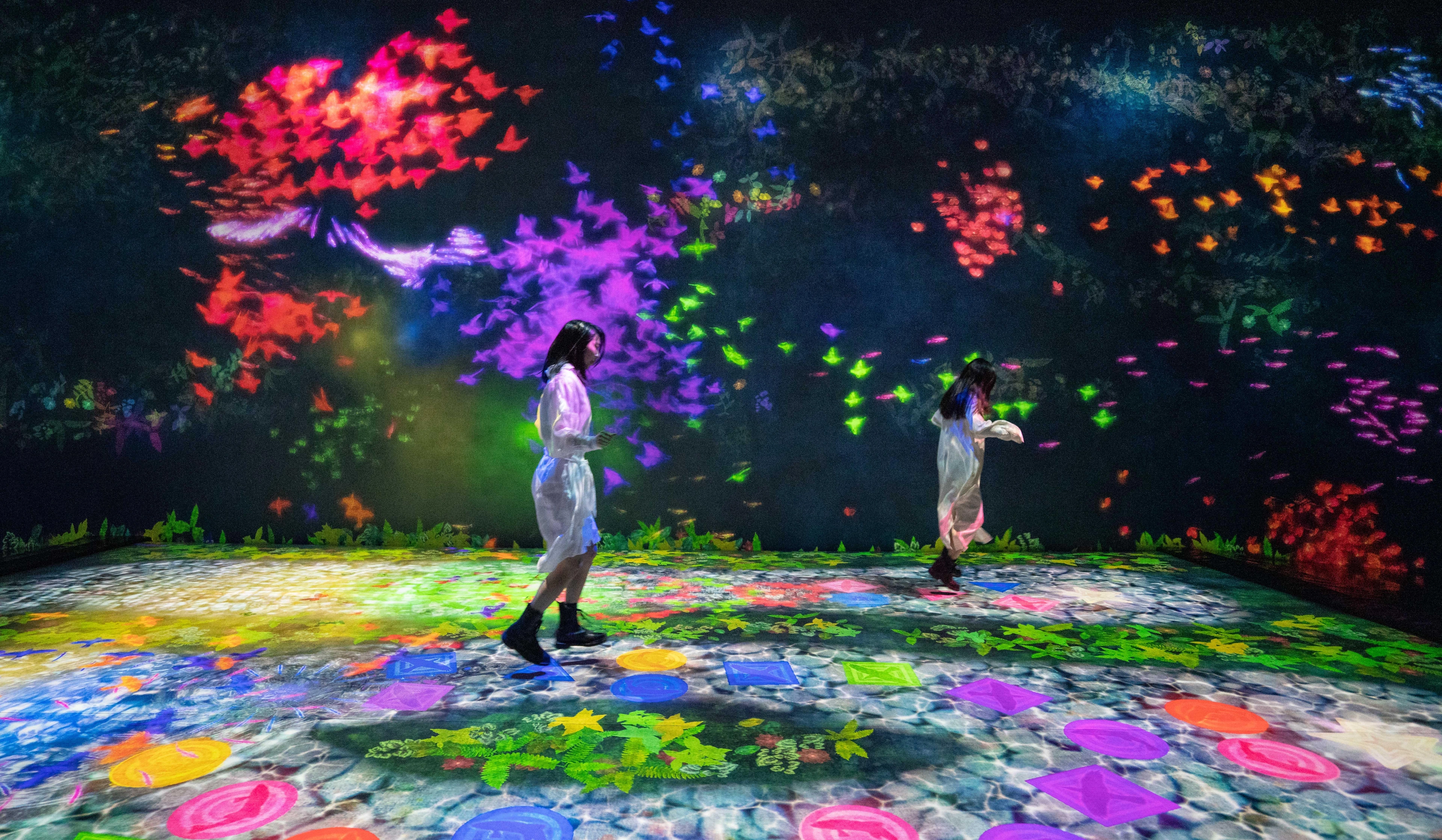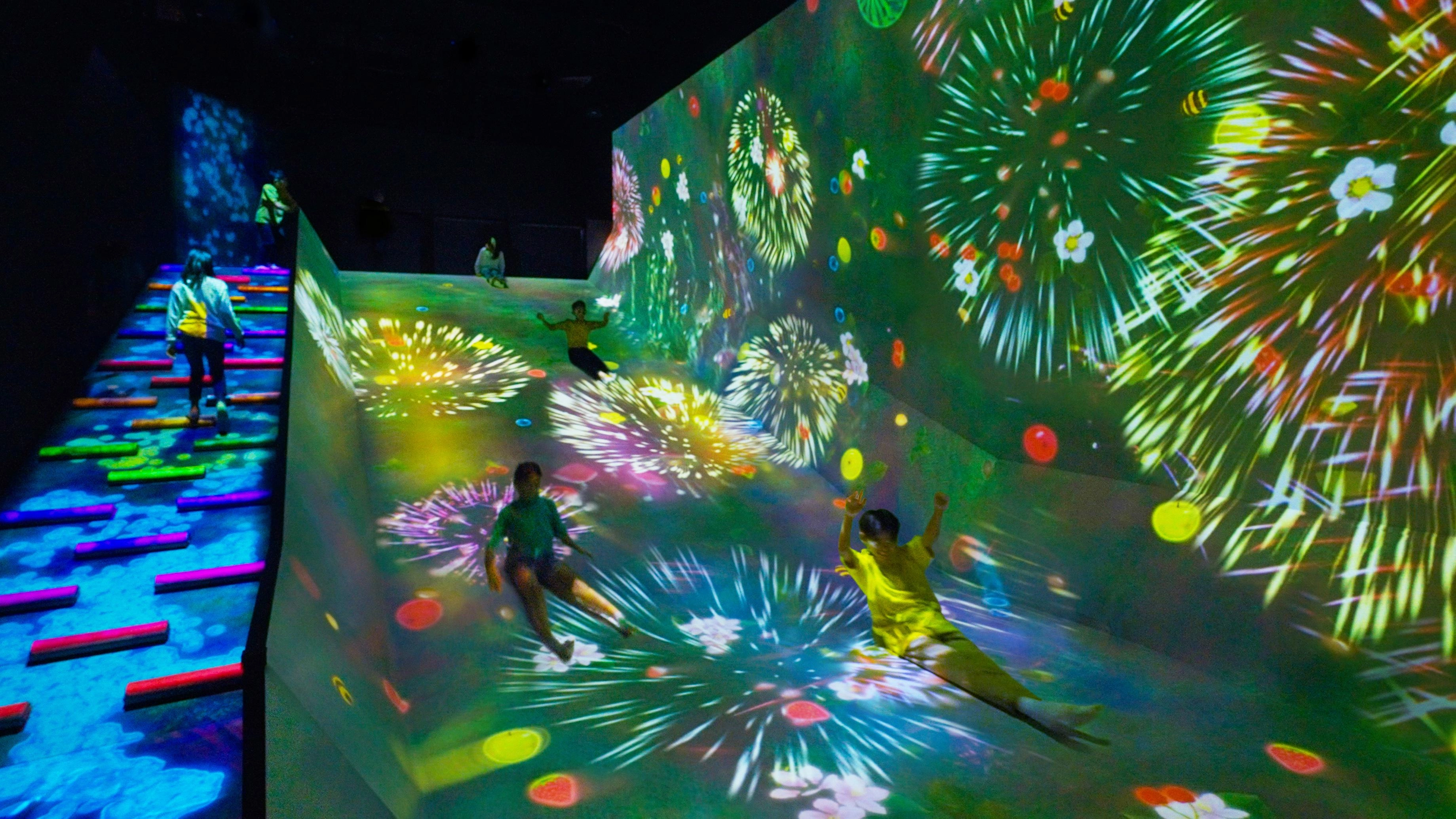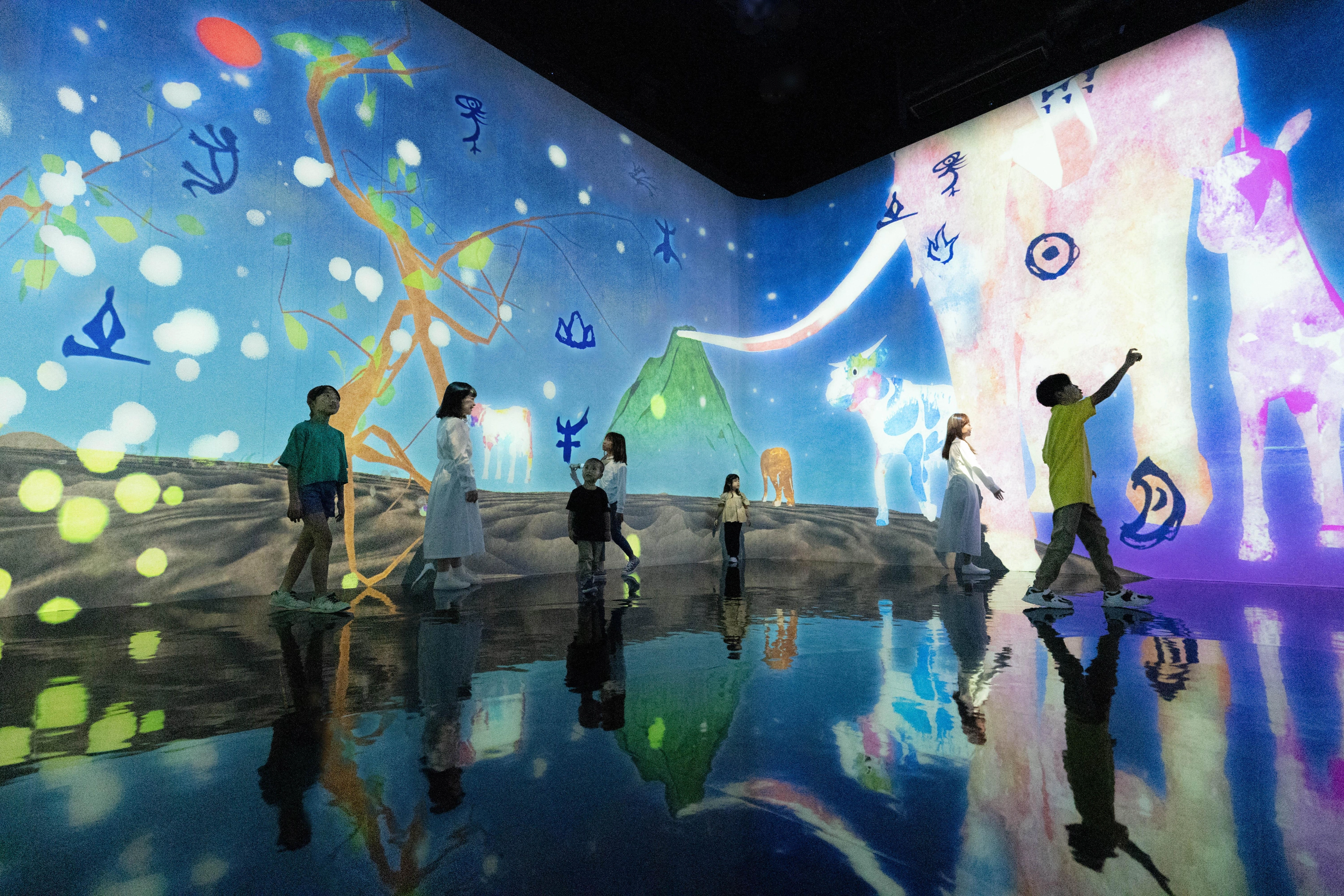 ときおり、《花と共に生きる動物たち II》に呼応して、現実世界の今の季節の花々が生き物たちから咲きはじめる。人々が生き物の花々を踏むと花々は散ってしまう。