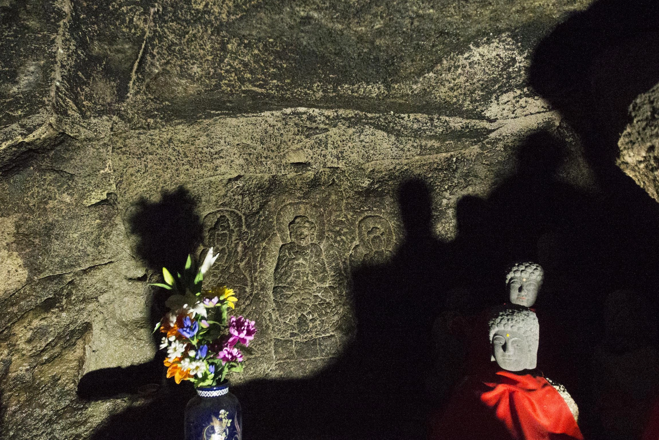 1845年(江戸後期)に50万平米にも及ぶ敷地に創られた御船山楽園。敷地の境界線上には、日本有数の巨木である樹齢3000年以上の武雄神社神木の大楠があり、庭園の中心には樹齢300年の大楠がある。そのことからわかるように、古来より大事にされてきた森の一部を、森の木々を生かしながら造った庭園であることが想像できる。庭園と自然の森との境界は曖昧で、回遊していく中でいつのまにか森に入り込んだり、けもの道に出くわしたりする。森の中には、超自然的に積み重なった巨石の磐座(いわくら)であろう祠が今では稲荷大明神としてまつられている。また、後に奈良の大仏をつくる名僧行基が約1300年前に御船山に入山し五百羅漢を彫ったとされており、森の中の洞窟の岩壁には、行基が直接彫ったと伝えられる磨崖仏が今も残る。