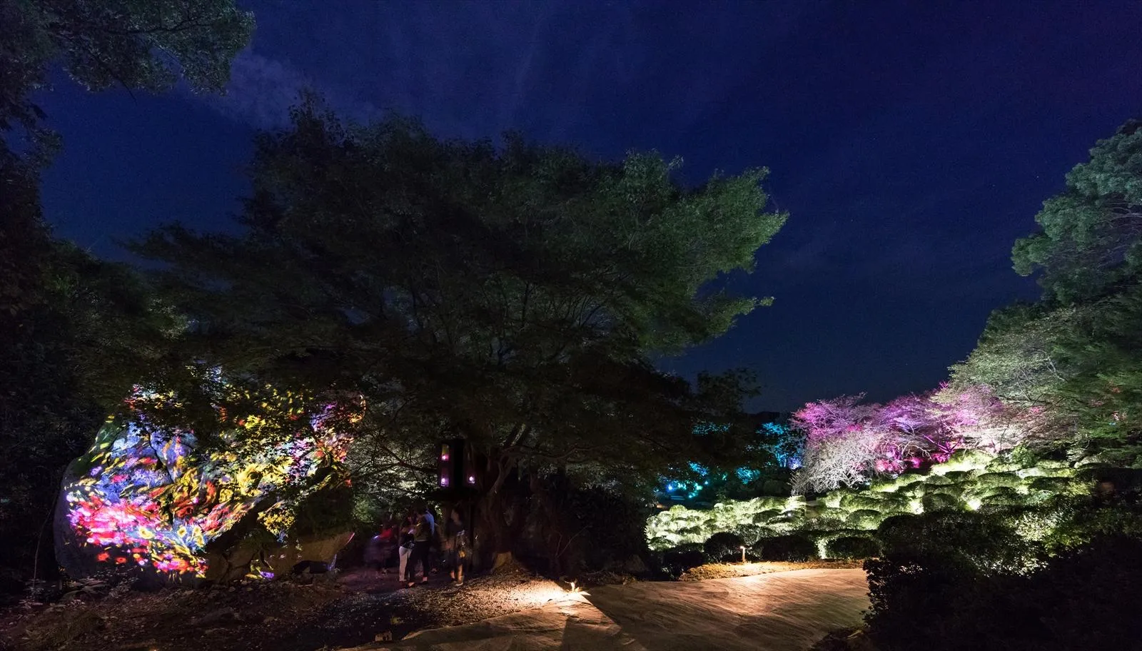 「増殖する生命の巨石」「夏桜と夏もみじの呼応する森」「呼応するつつじ」「小舟と共に踊る鯉によって描かれる水面のドローイング」「小さきもの中にある無限の宇宙に咲く花々」「呼応するランプの森とスパイラル - one stroke」