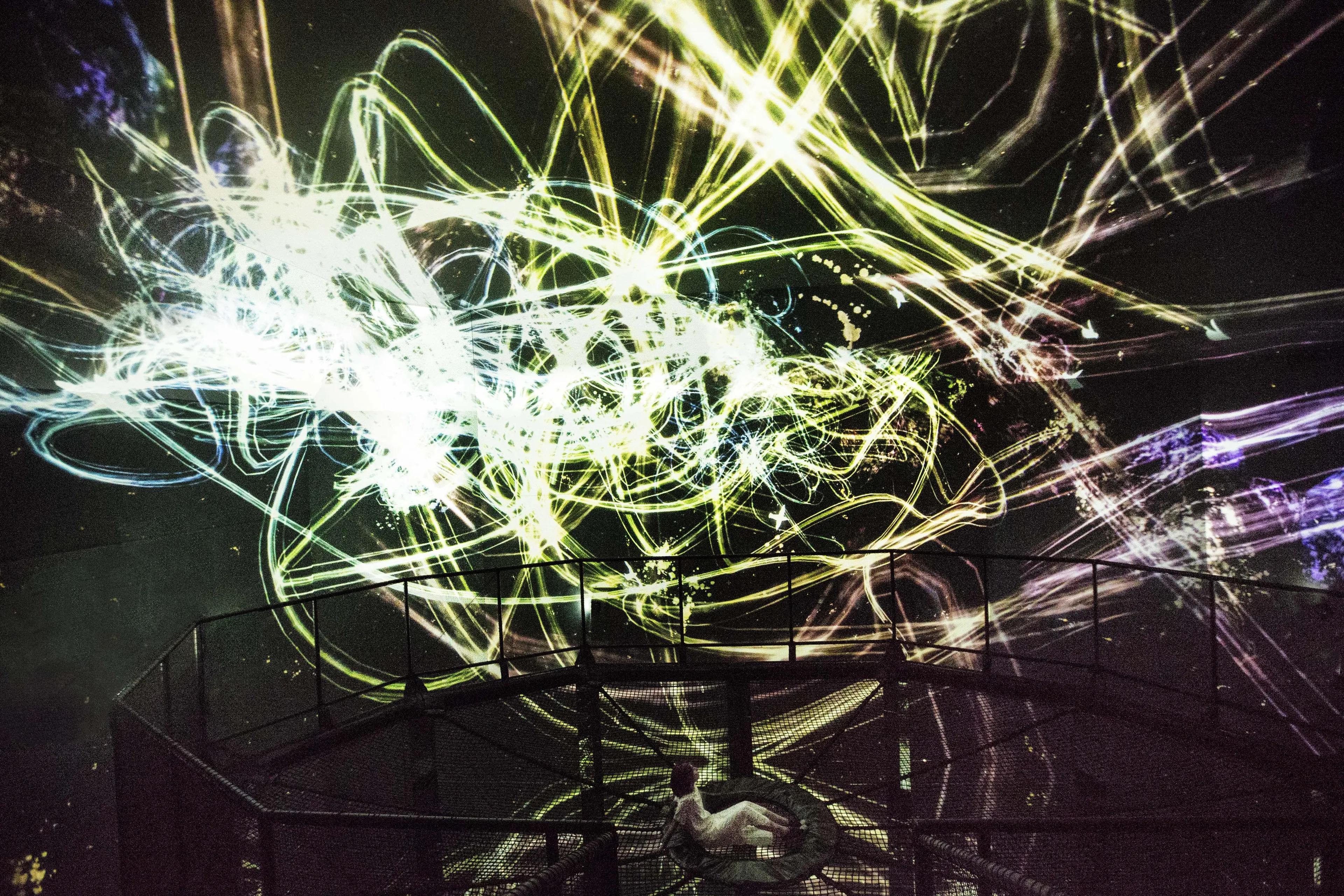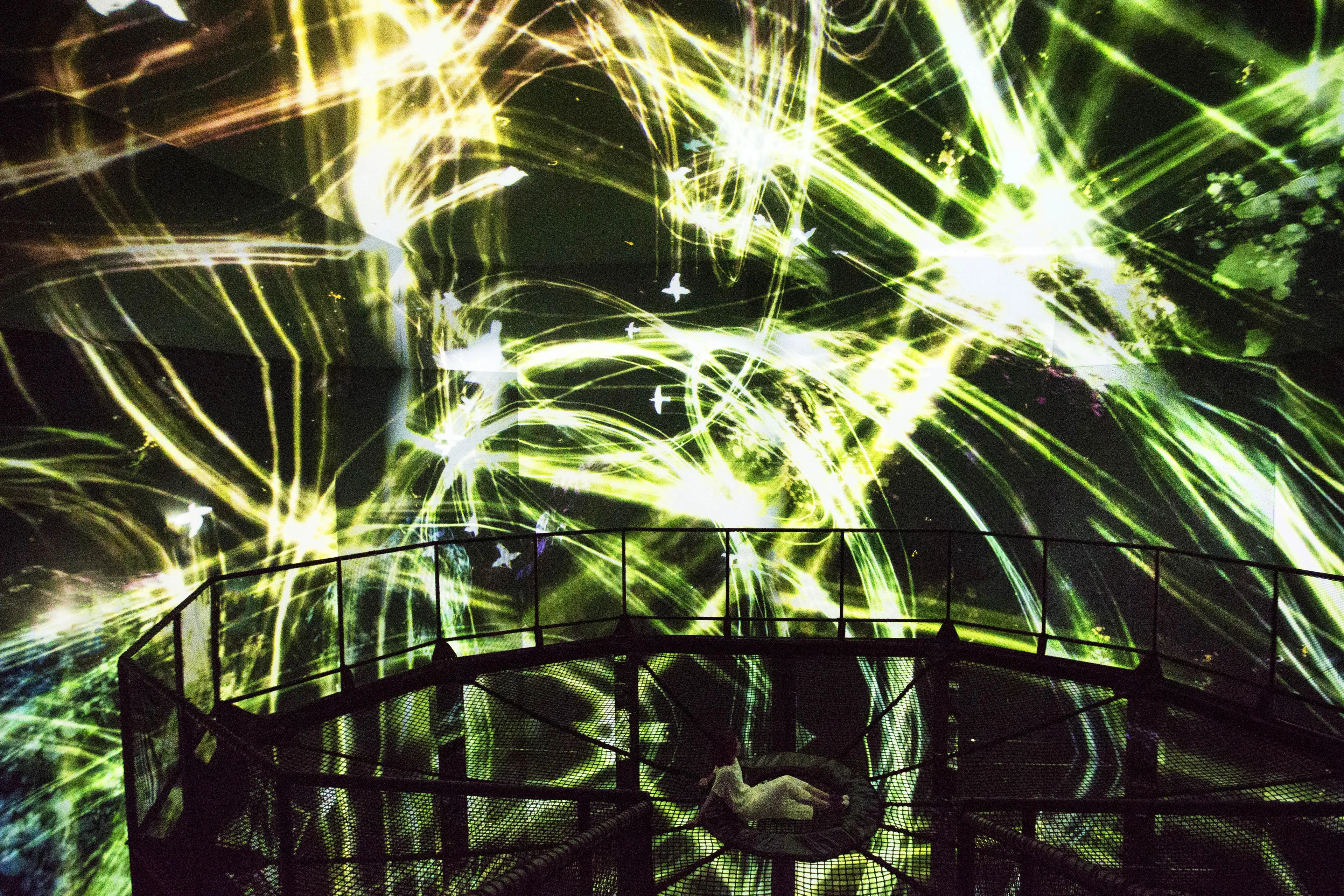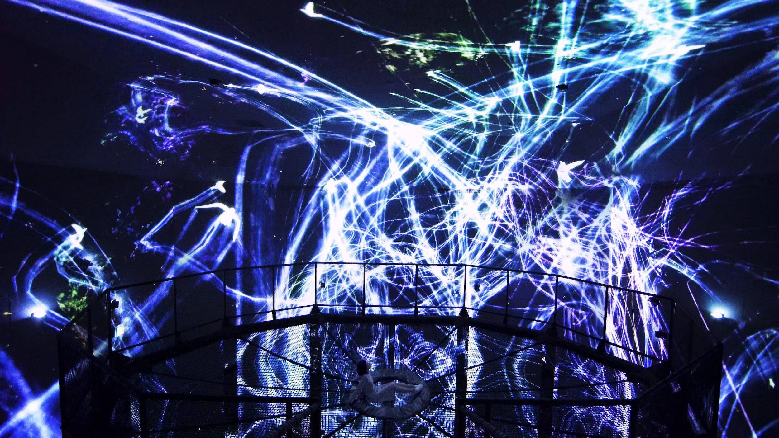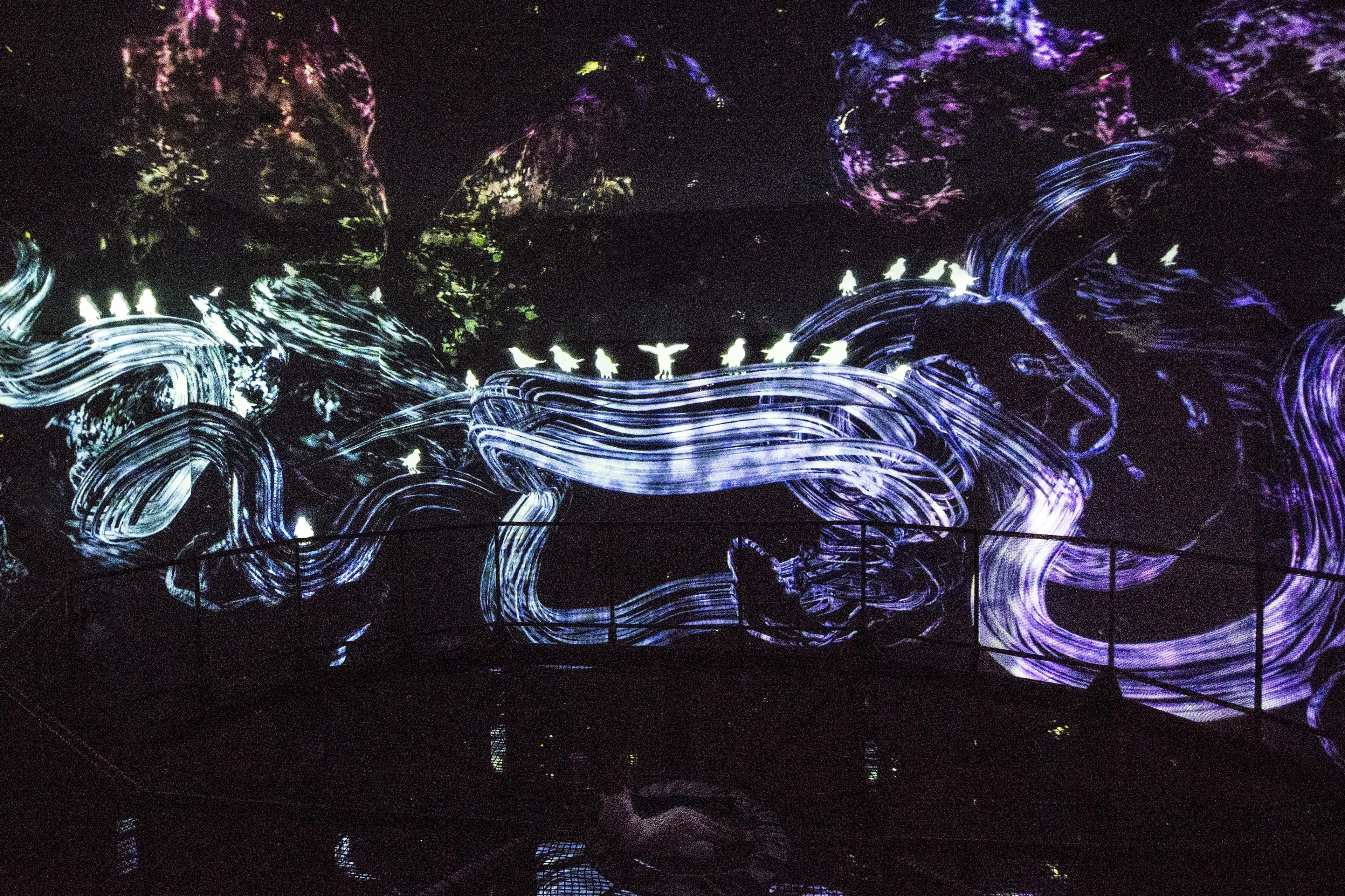 光で描かれた八咫烏が空間を飛び回り、その軌跡が光跡となり光の空間に描く書「空書」を描いている。カラスが互いに追い追われる。追うカラスも、やがて追われる側になり、追いつかれカラス同士ぶつかると、カラスは散って花となる。