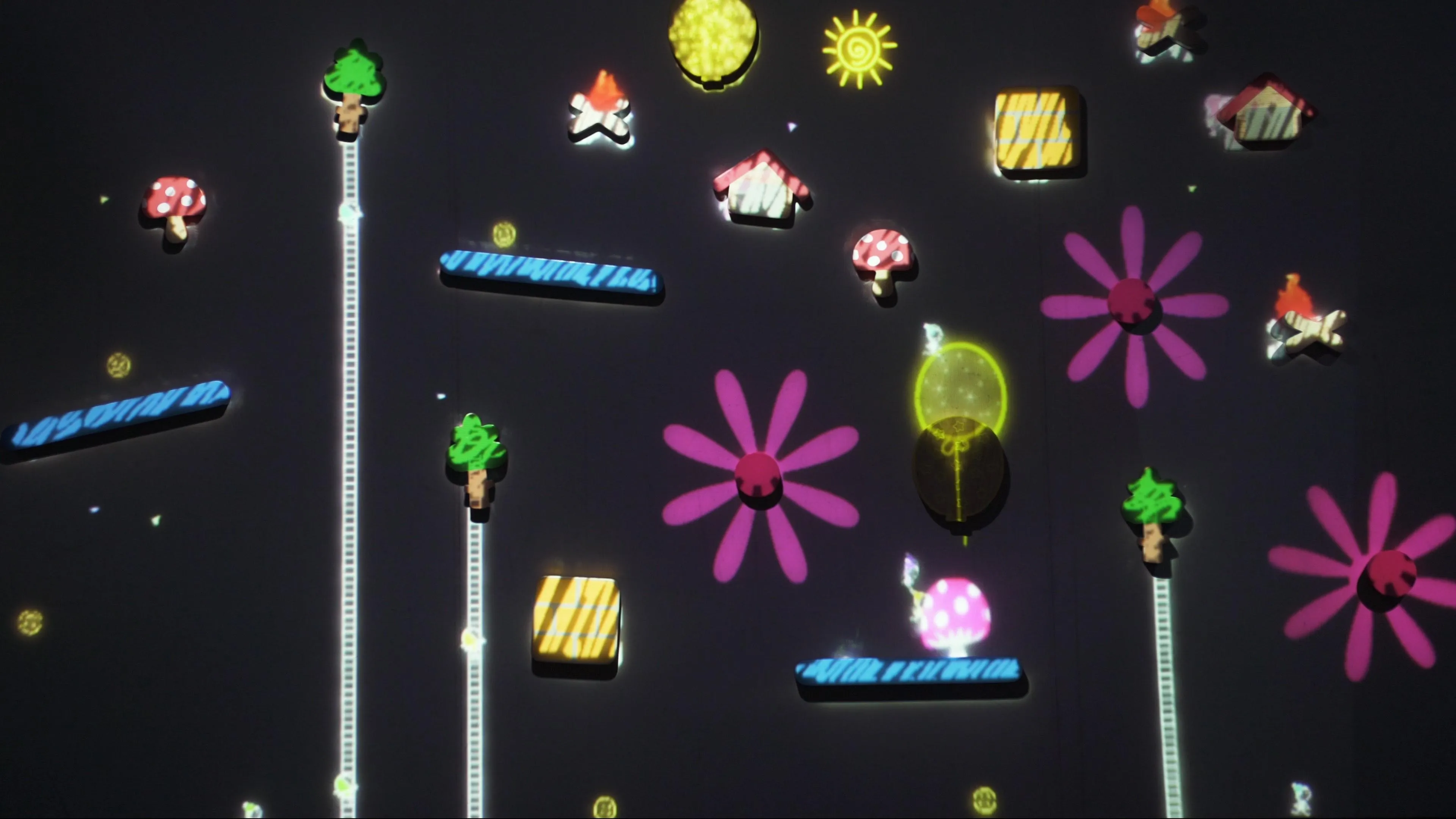 壁の上の方からニコニコの種が落ちてきて、キノコなどにあたって様々な音を奏でる。