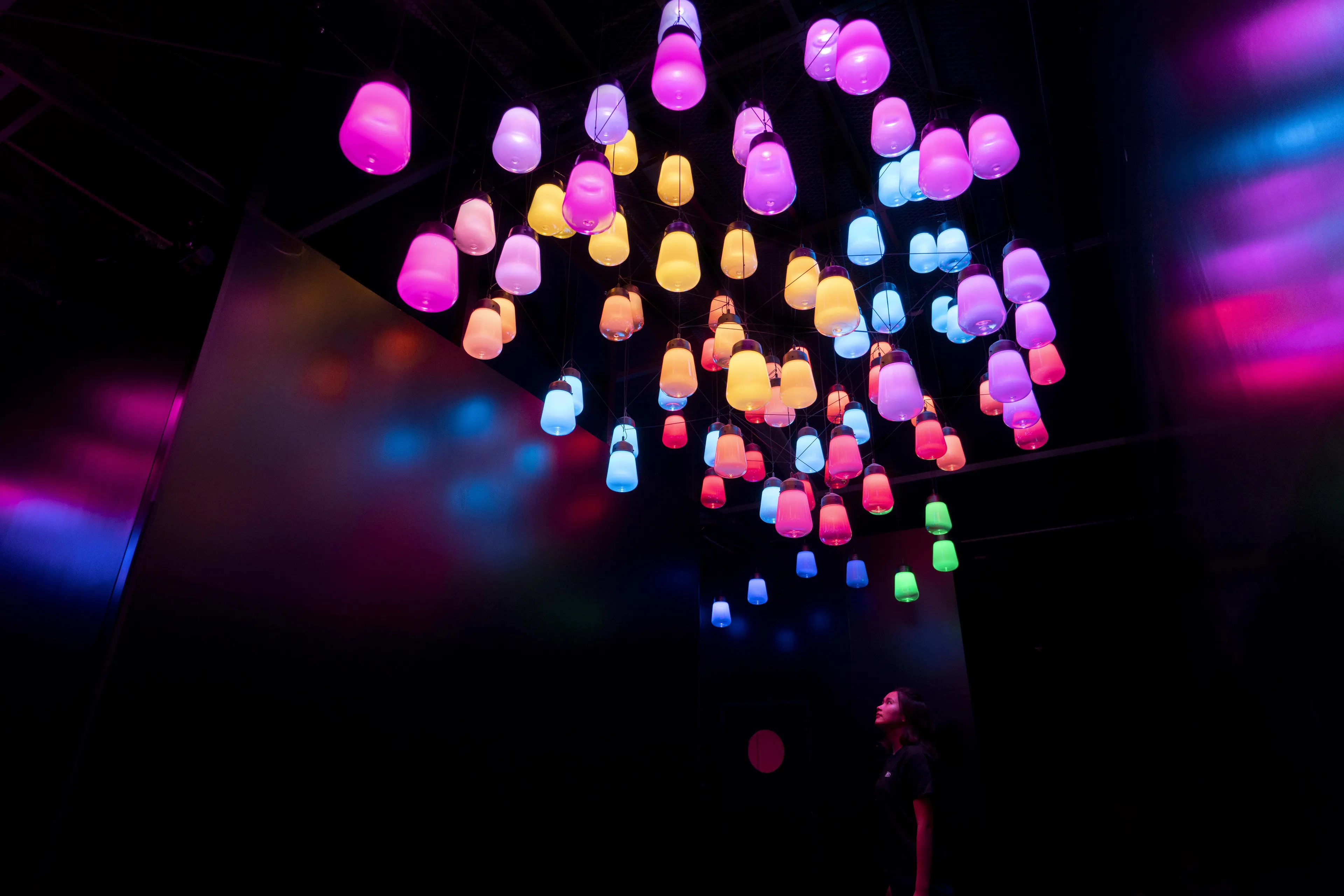 人が、ランプのアレイ(高密度に集合しているランプの塊)の底にある一番低いランプの下を通ると、そのランプが、強く輝き音色を響かせる。もしくは、人が各サウナ室に出入りすると、そのサウナ室の出入口付近のランプが、そのサウナ室の光の色に強く輝き音色を響かせる。