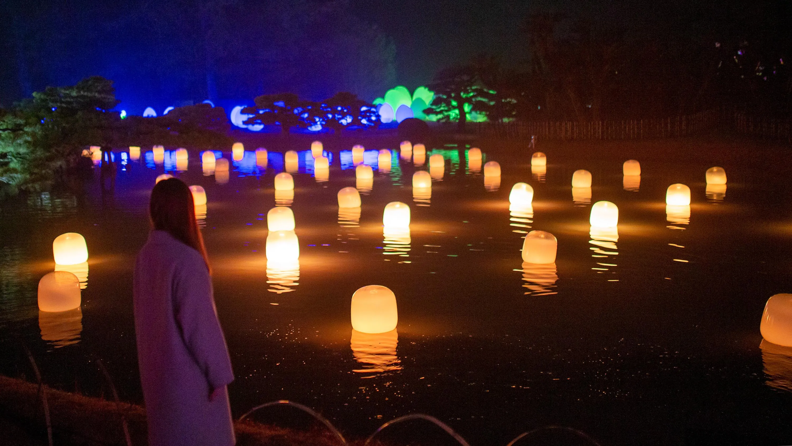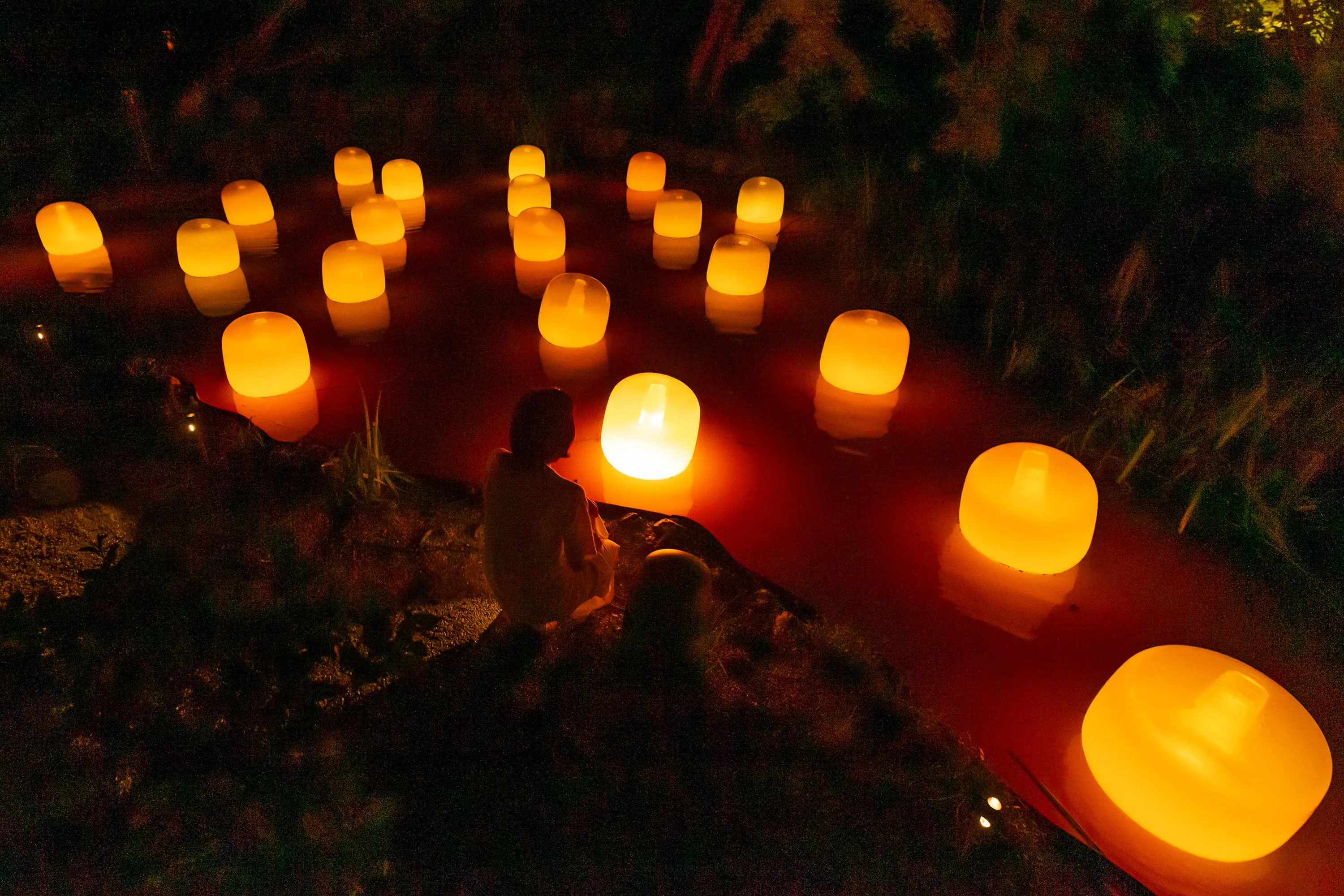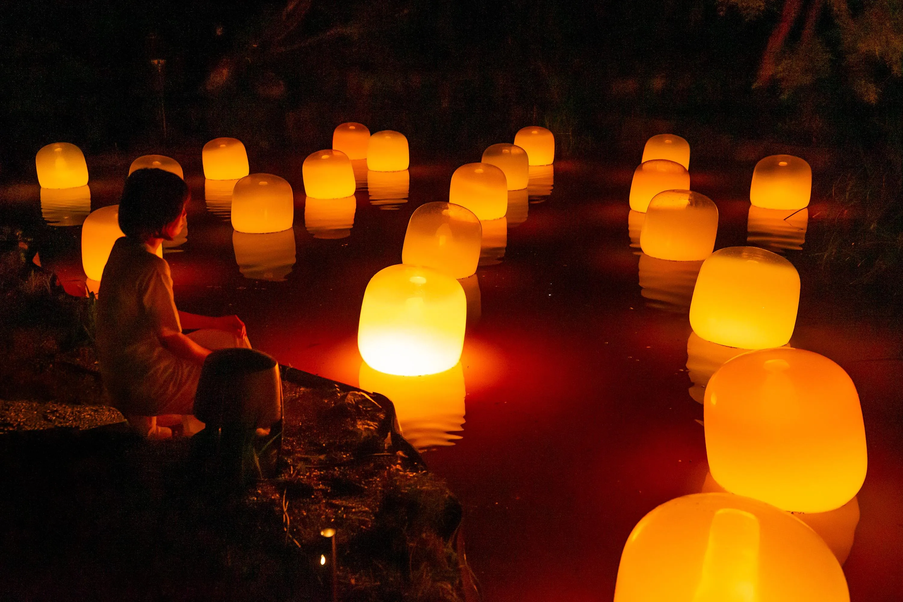 水面に浮かぶランプは、それぞれ自律し浮遊している。人がランプの近くで立ち止まっていると、もしくは風に吹かれて傾くと、強く輝き音色を響かせる。そのランプの光は、隣のランプに次々伝播し、音色を響かせながら、連続していく。伝播していく光は、必ず、全てのランプを一度だけ強く輝かせ、全てのランプに伝播する。人々はきっと、同じ空間にいる他の人々の存在を感じるだろう。