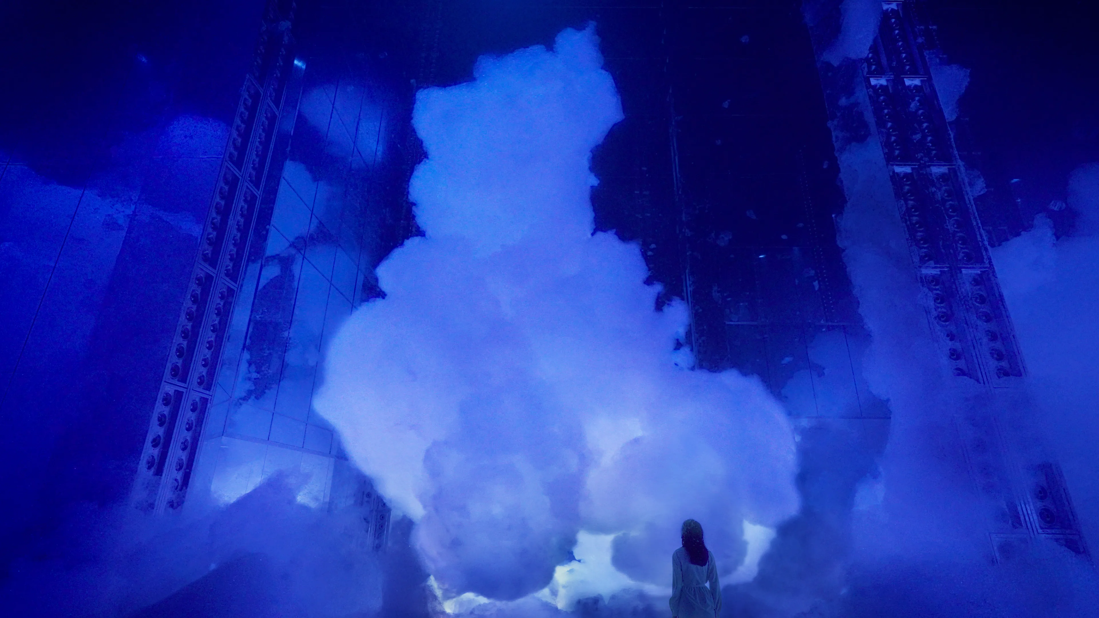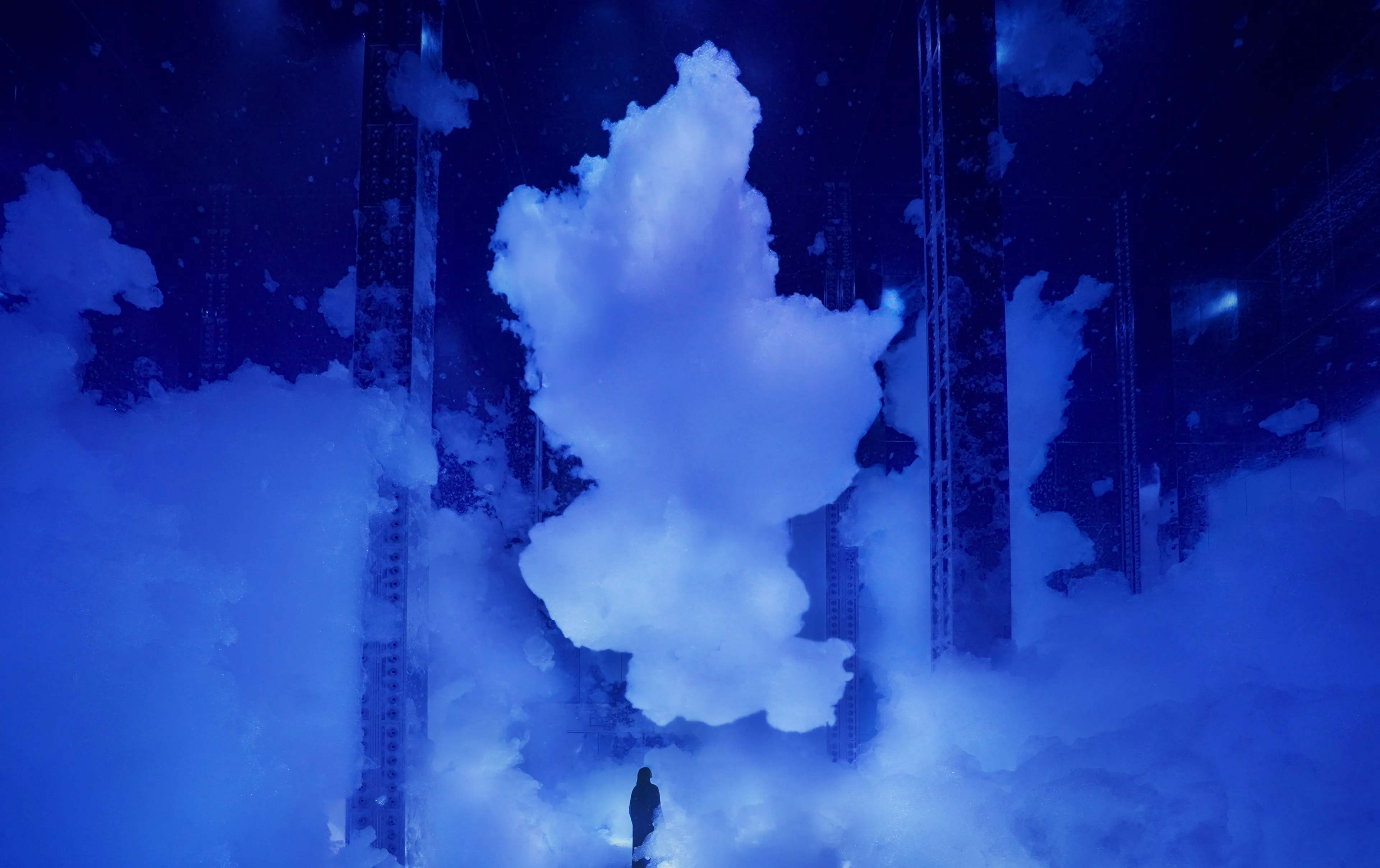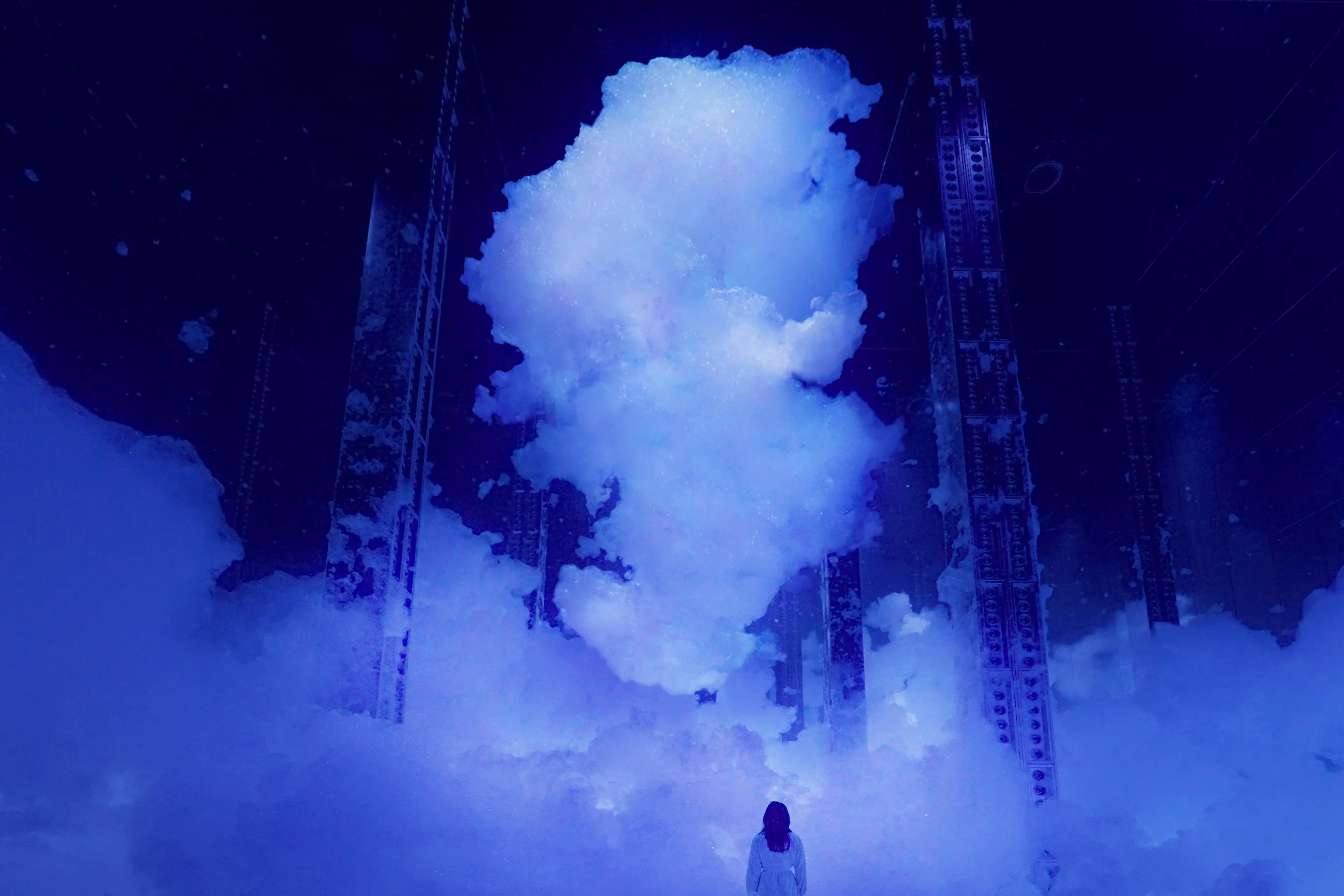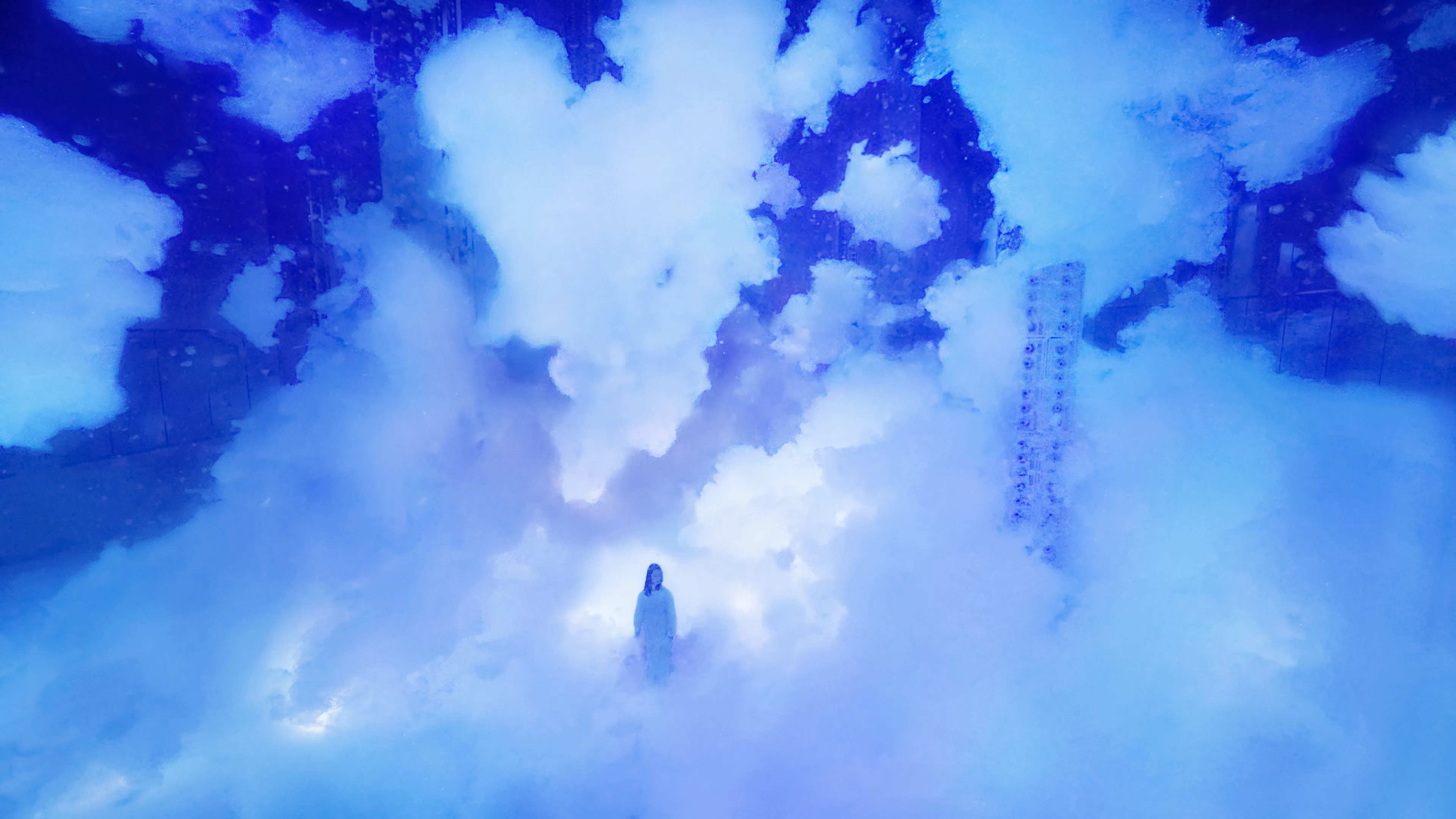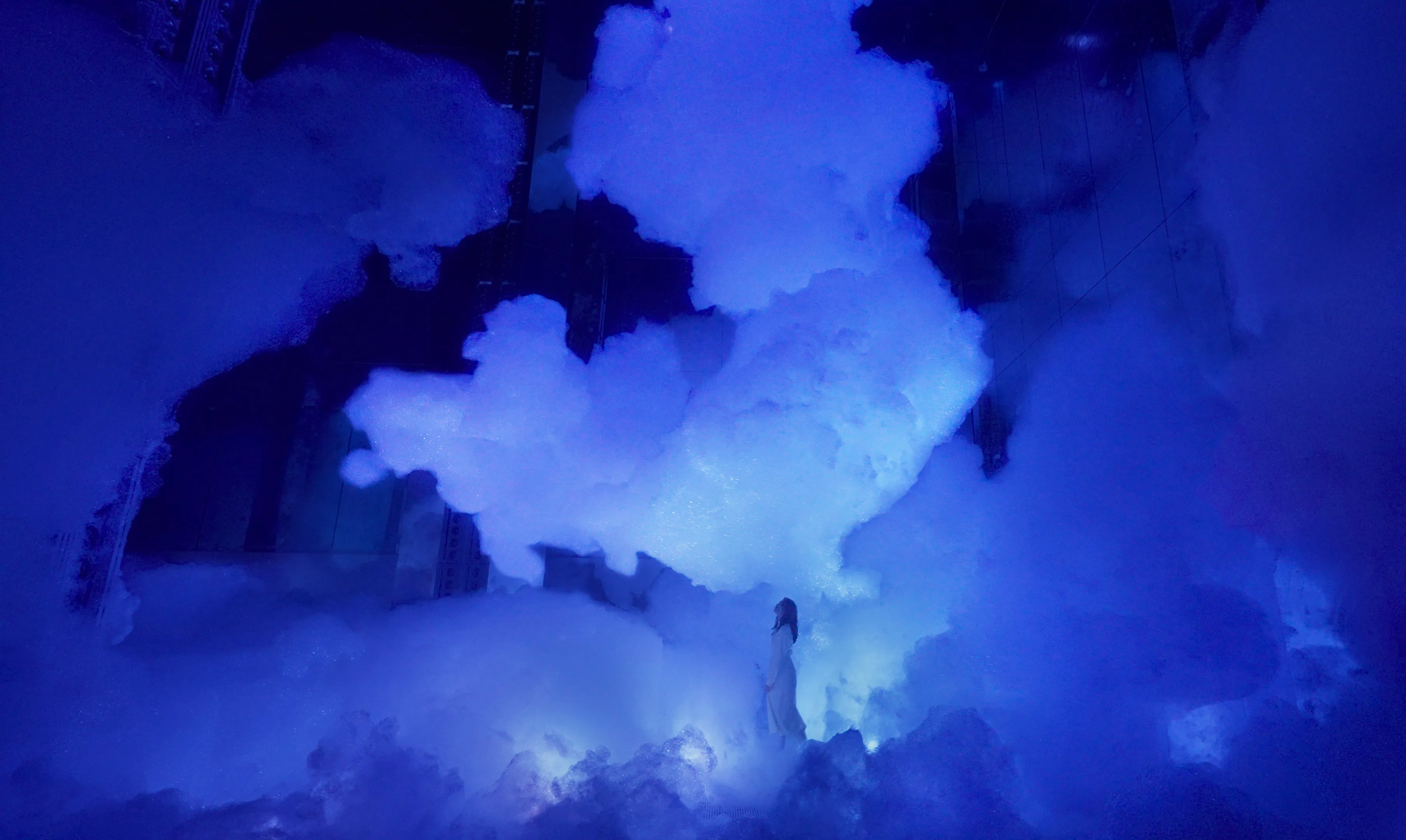 浮遊する巨大な彫刻は、泡の海から生まれ、質量の概念を超越し、地面に沈むこともなく、天井まで上がりきることもなく、空間の中ほどを漂う。この浮遊する彫刻の存在の輪郭は曖昧で、千切れて小さくなったり、くっついて大きくなったりする。人がこの彫刻に身体ごと入り込んでも存在は維持され、人々によって壊されても、自ら修復する。しかし、塊は、自ら修復できる範囲を超えて破壊された時、修復が追いつかず崩れていく。そして、人々が押したり、横にのけようとしても、この彫刻を動かすことができないし、人々が風をあおげば、彫刻は散り散りになってしまう。人間の物理的な行為では、この彫刻を動かすことすらできない。