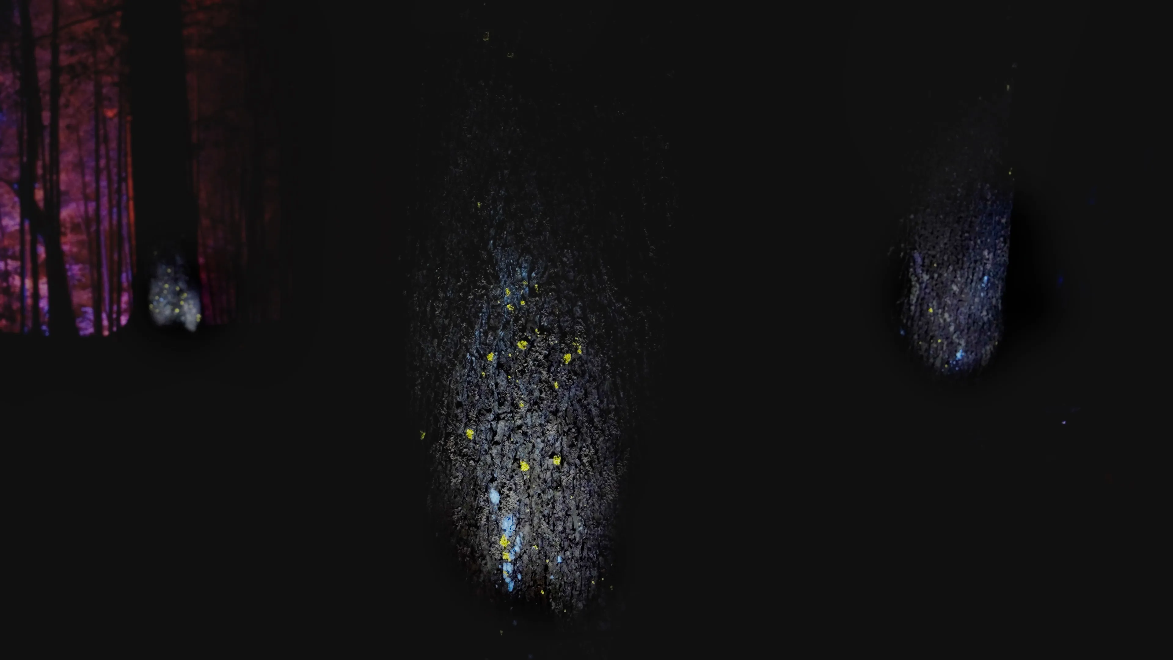暗闇の中、紫外線によって明滅する色鮮やかな輝き。それは、数十年、数百年の歳月が森に描き続けてきた生命の軌跡である。