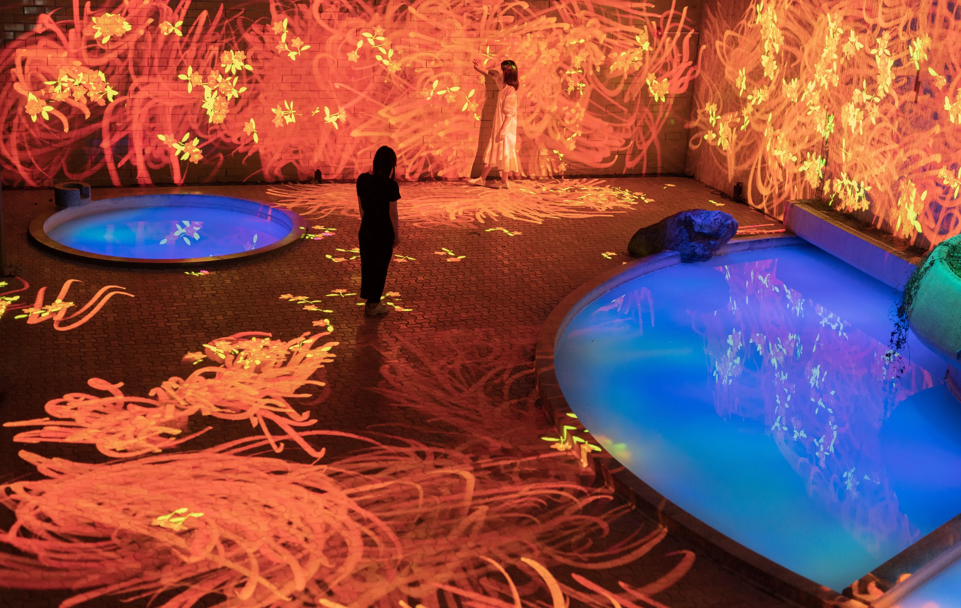 Visitors drew flowers as part of the Graffiti Nature artwork displayed here when the exhibition teamLab: A Forest Where Gods Live was on view in Mifuneyama Rakuen during the summer and autumn months. These flowers now bloom across the bath house ruins in the forest.
