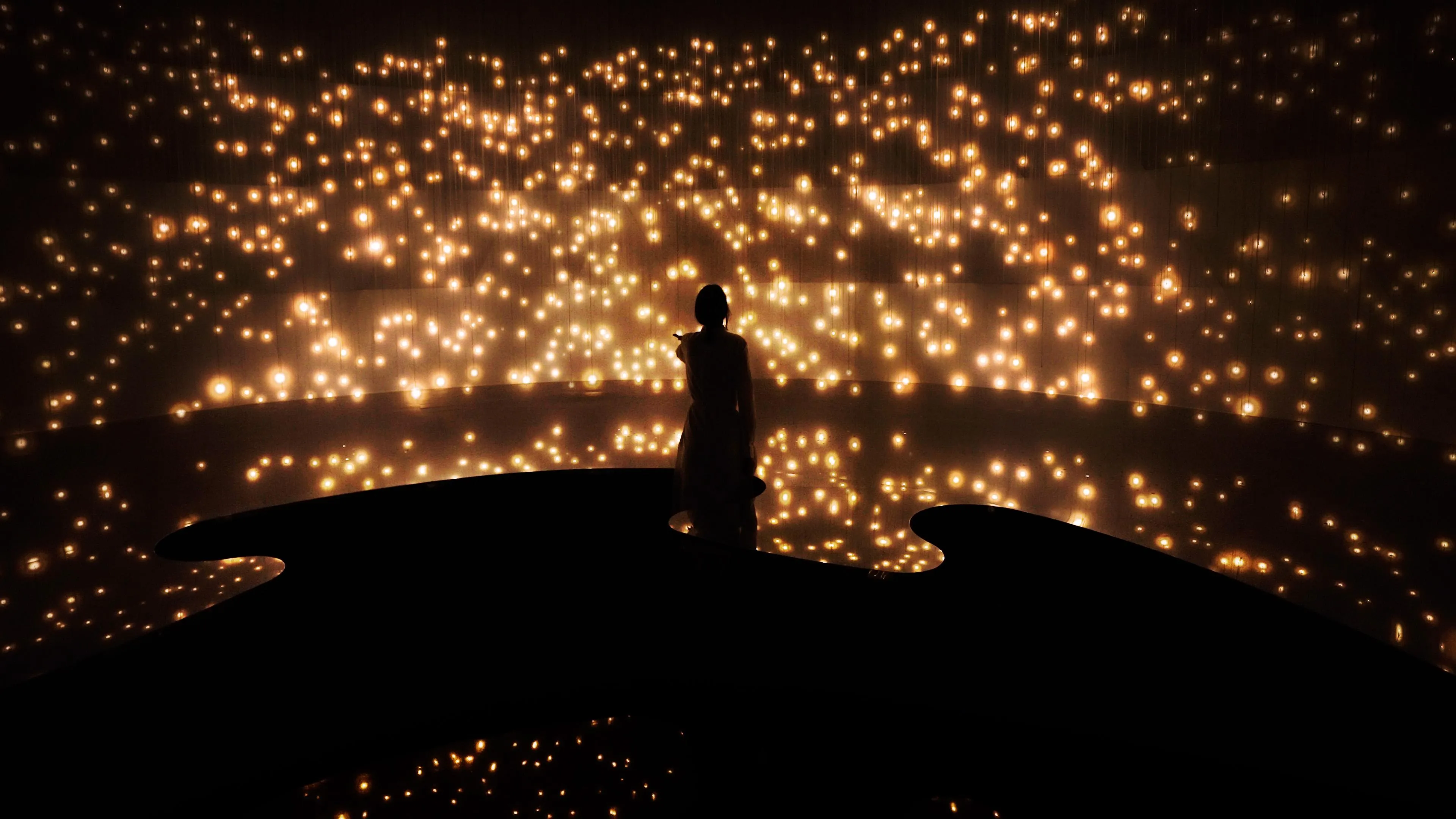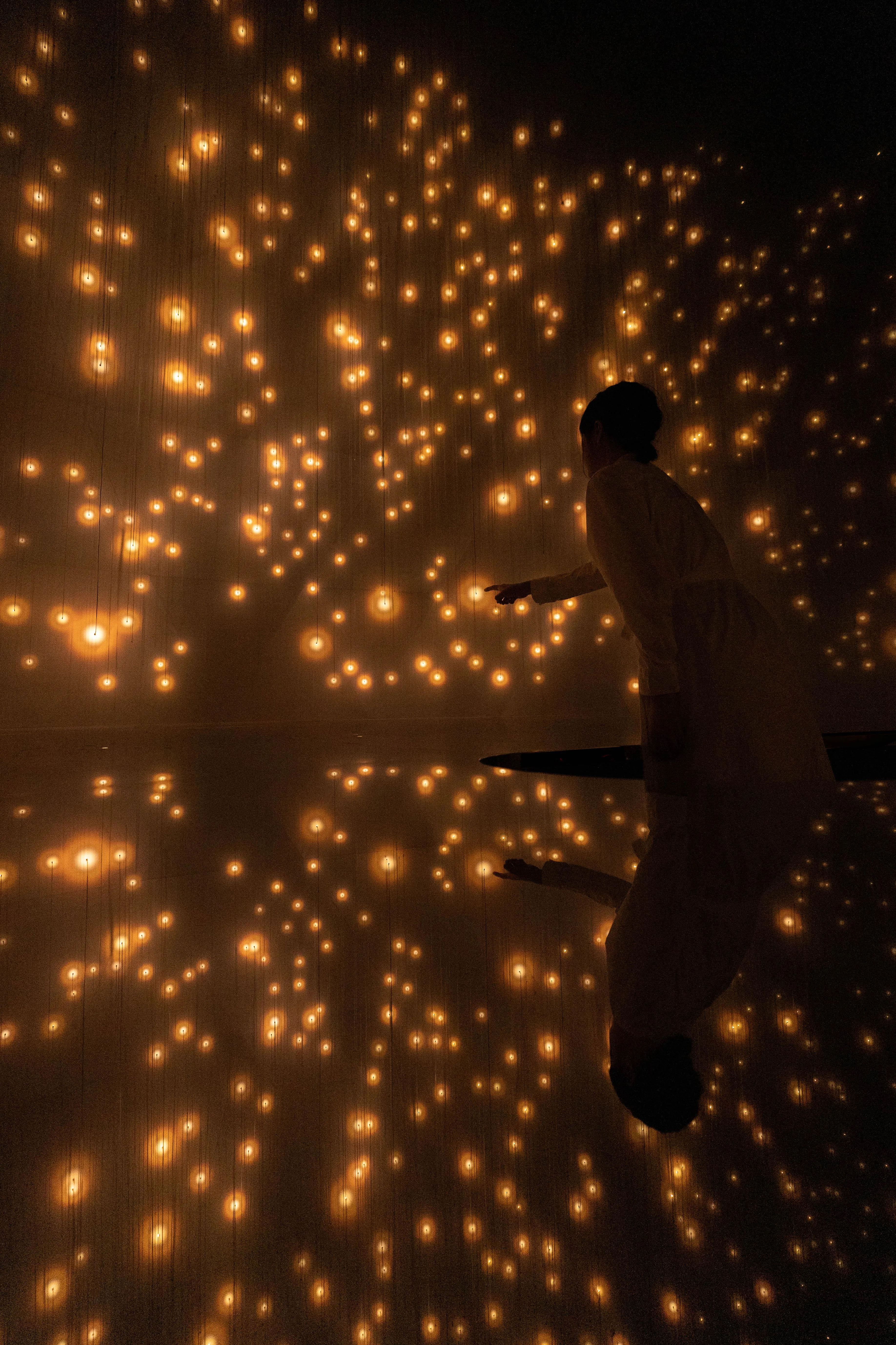 If you try to touch a sphere of light, the sphere shines brightly and the surrounding spheres respond one after the other. When Tea in Spontaneous Order shines brightly, the surrounding spheres also respond one after the other.
